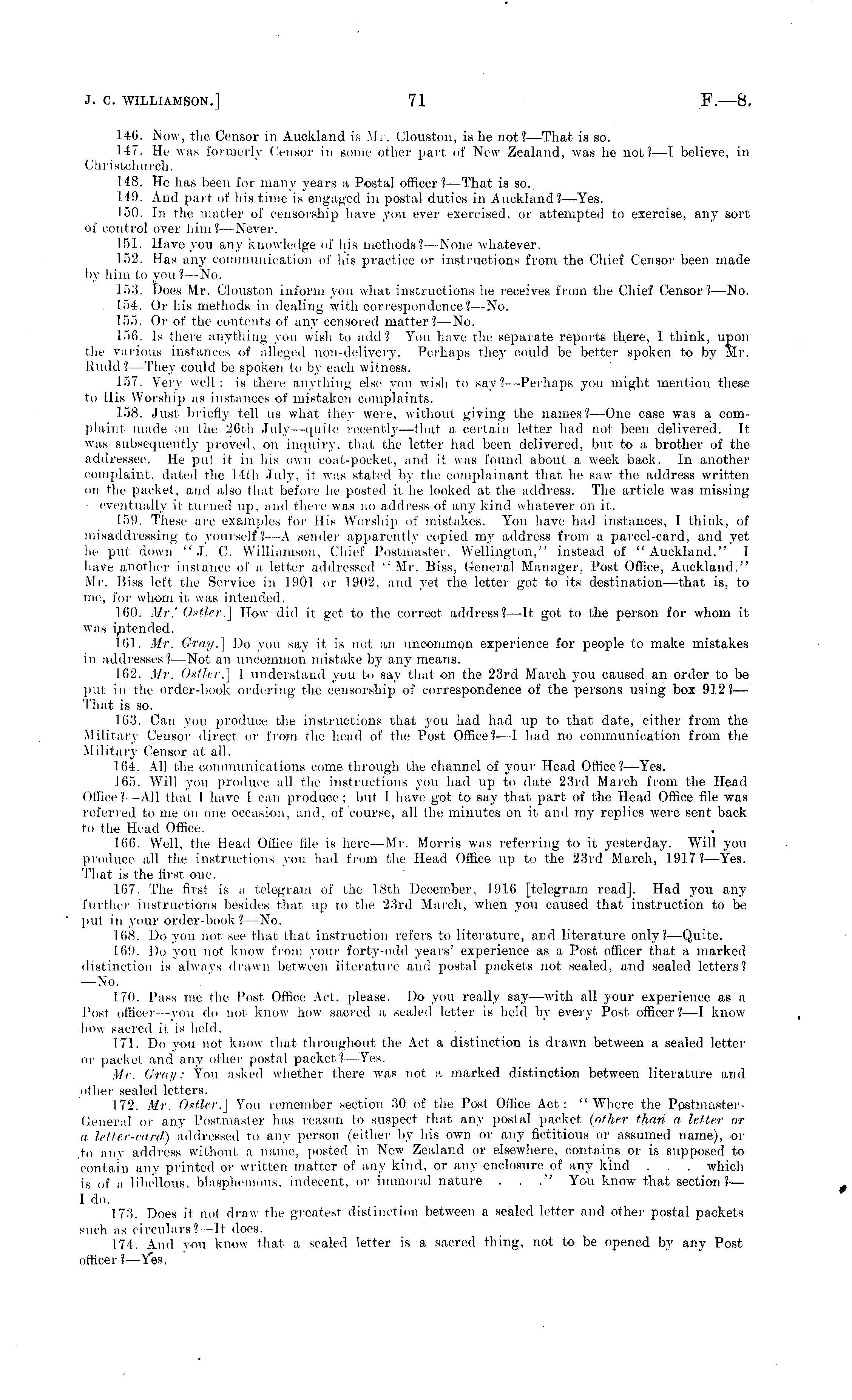 146. Now, the Censor in Auckland is Mr. Clouston, is he not?—That is so. 147. He was formerly Censor in some other part of New Zealand, was he not? —I believe, in Christchurch. 148. He has been for many years a Postal officer?—That is so. ; 149. And part of his time is engaged in postal duties in Auckland?—Yes. 150. In the matter of censorship have you ever exercised, or attempted to exercise, any sort of control over him?—Never. 151. Have you any knowledge of his methods?—None whatever. 152. Has any communication of his practice or instructions from the Chief Censor been made by him to you ?—No. 153. Does Mr. Clouston inform you what instructions he receives from the Chief Censor?—No. 154. Or his methods in dealing with correspondence?—No. 155. Or of the contents of any censored matter?—No. 156. Is there anything you wish to add? You have the separate reports there, I think, upon the various instances of alleged non-delivery. Perhaps they could be better spoken to by Mr. Rudd ?—They could be spoken to by each witness. 157. Very well ; is there anything else you wish to say?—Perhaps you might mention these to His Worship as instances of mistaken complaints. 158. Just briefly tell us what they were, without giving the names?—One case was a complaint made on the 26th July—quite recently —thai a certain letter had not been delivered. It was subsequently proved, on inquiry, that the letter had been delivered, but to a. brother of the addressee. He put it in his own coat-pocket, and it was found about a week back. In. another complaint, dated the 14th July, if was stated by the complainant that he saw the address written on the packet, and also that before he posted it he looked at the address. The article was missing —eventually it turned up, and there was no address of any kind whatever on it. 159. These are examples for His Worship of mistakes. You have had instances, I think, of misaddressing to yourself?—A sender apparently copied my address from a parcel-card, and yet he put down " J. C. Williamson. Chief Postmaster, Wellington," instead of " Auckland." 1 have another instance of a letter addressed " Mr. Hiss, General Manager, Post Office, Auckland." Mr. Hiss left the Service in 1901 or 1902, and yet the letter got to its destination—that is, to me, for whom it was intended. 160. Mr.' Ostler.] How did it get to the correct address?—It got to the person for whom it was in.tended. 161. Mr. Gray.] Do you say it, is not an uncommon experience for people to make mistakes in addresses?—Not an uncommon mistake by any means. 162. Mr. Os/Icr.] 1 understand you to say that on the 23rd March you caused an order to be put in the order-book ordering the censorship of correspondence of the persons using box 912?— That is so. 163. Can you produce the instructions that you had had up to that date, either from the Military Censor direct or from I he head of the Post Office?—I had no communication from the M ilitary Censor at all. 1-64. All the communications come through the channel of your Head Office?—Yes. 165. Will you produce all the instructions you had up to date 23rd March from the Head Office? -All that T have I can produce; but 1 have got to say that part of the Head Office file was referred to me on one occasion, and, of course, all the minutes on. it and my replies were sent back to the Head Office. 166. Well, the Head Office file is here—Mr. Morris was referring to it yesterday. Will you produce all the instructions you had from the Head Office up to the 23rd March, 1917?—Yes. That is the first one. 167. 'fhe first is a telegram of the 18th December, 1916 [telegram read]. Had you any further instructions besides that up to the 23rd March, when you caused that instruction to be put in your order-book ?—No. 168. Do you not see that that instruction refers to literature, and literature only?—Quite. 169. Do you not know from your forty-odd years' experience as a Post officer that a marked distinction is always drawn between literature ami postal packets not sealed, and sealed letters? —No. 170. Pass me the Post Office Act, please. Do you really say—with all your experience as a Post officer—you do not know how sacred a, sealed letter is held by every Post officer? —I know how sacred if is held. 171. Do you not know that throughout the Act a distinction is drawn between a sealed letter or packet and any other postal packet?-—Yes. Mr. Gray: You asked whether there was not a marked distinction between literature and other sealed letters. 172. Mr. Ostler.] You remember section 30 of the Post Office Act : " Where the PostmasterGeneral or any Postmaster has reason to suspect that any postal packet (other than a letter or a letter-card) addressed to any person (either by his own or any fictitious or assumed name), or to any address without a name, posted in New Zealand or elsewhere, contains or is supposed to contain any printed or written matter of any kind, or any enclosure of any kind . . . which is of a libellous, blasphemous, indecent, or immoral nature . . ." You know that section?— I do. 173. Does it not draw the greatest distinction between a sealed letter and other postal packets such as circulars? —It does. 174. And you know that a. sealed letter is a sacred thing, not to be opened by any Post officer? —Yes,