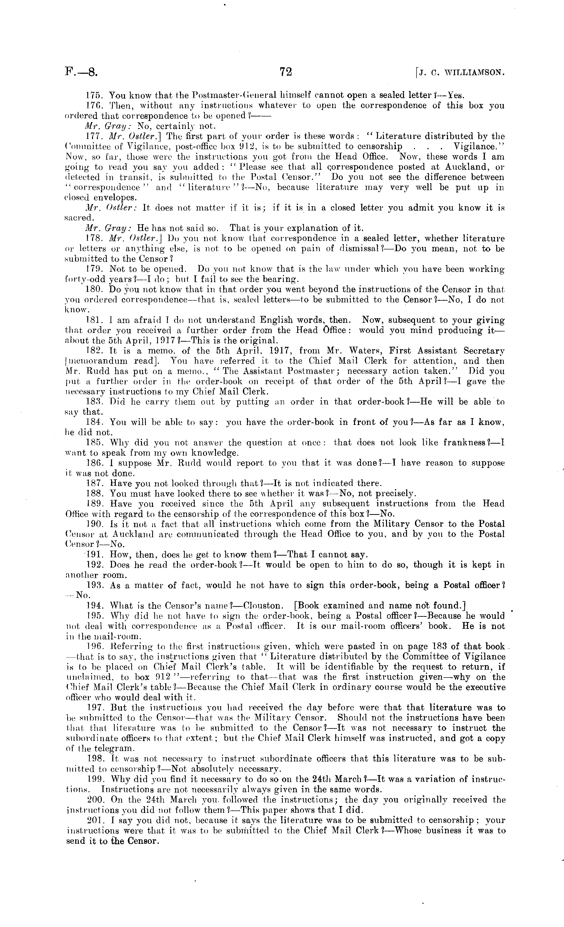 175. You know that the Postmaster-General himself cannot open a sealed letter? —Yes. 176. Then, without, any instructions whatever to open the correspondence of this box you ordered that correspondence to be opened? Mr. Gray: No, certainly not. 177. Mr. Ostler.] The first part, of your order is these words : " Literature distributed by the Committee of Vigilance, post-office box 912, is to be submitted to censorship . . . Vigilance." Now, so far, those were the instructions you got from the Head Office. Now, these words I am going to read you say you added : " Please see that all correspondence posted at Auckland, or delected in transit, is submitted to the Postal Censor." Do you not see the difference between "correspondence" and "literature"? —No, because literature may very well be put up in closed envelopes. Mr. Ostler: It does not matter if it is; if it is in a closed letter you admit you know it is sacred. Mr. Gray: He has not said so. That is your explanation of it. 178. Mr. Ostler.] Do you not know that correspondence in a sealed letter, whether literature or letters or anything else, is not to be opened on pain of dismissal? —Do you mean, not to be submitted to the Censor ? 179. Not to be opened. Do you not know that, is the law under which you have been working forty-odd years?—l do; but. I fail to see the bearing. 180. Do you not know that in that order you went beyond the instructions of the Censor in that you ordered correspondence—that, is, sealed letters—to be submitted to the Censor?—No, I do not, know. 181. lam afraid Ido not understand English words, then. Now, subsequent to your giving that order you received a further order from the Head Office: w r ould you mind producing it — about the sth April, 1 917 ? —This is the original. 182. It is a memo, of the sth April, 1917, from Mr. Waters, First Assistant Secretary [memorandum read]. You have referred it to the Chief Mail Clerk for attention, and then Mr. Rudd has put on a memo., "The Assistant Postmaster; necessary action taken." Did you put a further order in the order-book on receipt, of that order of the sth April?—l gave the necessary instructions to my Chief Mail Clerk. 183. Did he carry them out by putting an order in that order-book? —He will be able to say that. 184. You will be able to say: you have the order-book in front of you?—As far as I know, he did not. 185. Why did you not answer the question at once: that does not look like frankness?—l want to speak from my own knowdedge. ,186. I suppose Mr. Rudd would report to you that it, was done? —I have reason to suppose it was not done. 187. Have you not looked through that?—lt is not indicated there. 188. You must, have looked there to see whether it was?—No, not precisely. 189. Have you received since the sth April any subsequent instructions from the Head Office with regard to the censorship of the correspondence of this box ?—No. 190. Is it not a fact that all instructions which come from the Military Censor to the Postal Censor at Auckland are communicated through the Head Office to you, and by you to the Postal (lensor ?—No. 191. How, then, does he get to know them?— That I cannot say. 192. Does he read the order-book? —It would be open to him to do so, though it is kept in another room. 193. As a matter of fact, would he not have to sign this order-book, being a Postal officer? —No. 194. What is the Censor's name?—Clouston. [Book examined and name not found.] 195. Why did he not, have to sign the order-book, being a Postal officer?— Because he would not deal with correspondence as a Postal officer. It is our mail-room officers' book. He is not in I be mail-room. 196. Referring to the first instructions given, which were pasted in on page 183 of that book —that is to say, the instructions given that " Literature distributed by the Committee of Vigilance is to be placed on Chief Mail Clerk's table. It will be identifiable by the request to return, if unclaimed, to box 912 " —referring to that—that, was the first instruction given—why on the Chief Mail Clerk's table?— Because the Chief Mail Clerk in ordinary course would be the executive officer who would deal with it, 197. But the instructions you had received the day before were that that literature was to be submitted to the Censor—that was the Military Censor. Should not the instructions have been thai, that literature was lo be submitted to the Censor?—lt was not necessary to instruct the subordinate officers to that extent; but the Chief Mail Clerk himself was instructed, and got a copy of the telegram. 198. ft was not necessary to instruct subordinate officers that this literature was to be submitted to censorship?— Not absolutely necessary. 199. Why did you find it necessary to do so on the 24th March ?—lt was a variation of instructions. Instructions are not necessarily always given in the same words. 200. On. the 24th March you. followed the instructions; the day you originally received the instructions you did not follow them?— This paper shows that I did. 201. I say you did not, because it says the literature was to be submitted to censorship ; your instructions were that it was to be submitted to the Chief Mail Clerk?—- Whose business it was to send it to the Censor.