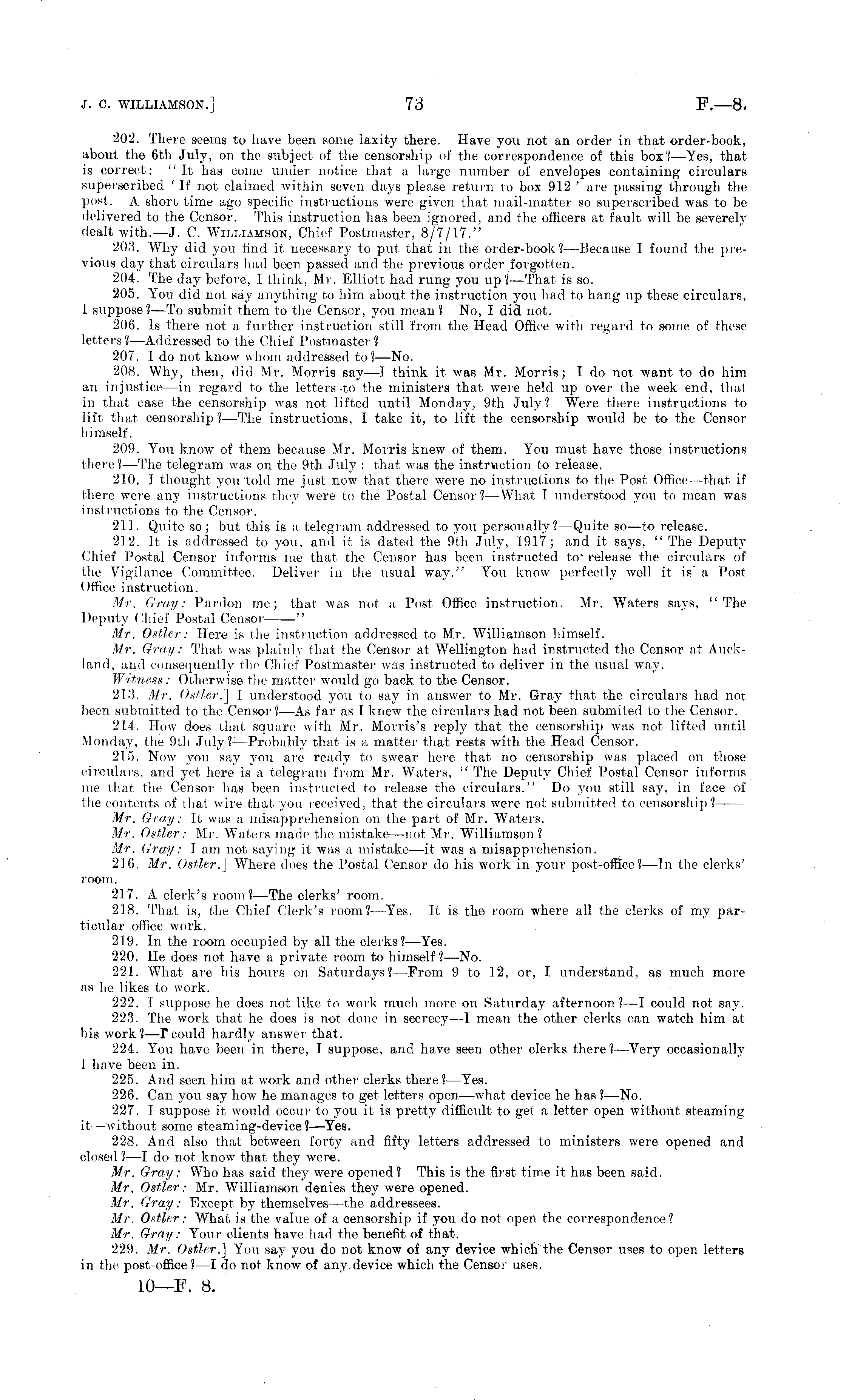 202. There seems to have been some laxity there. Have you not an order in that order-book, about the 6th July, on the subject of the censorship of the correspondence of this box? —Yes, that is correct: "It has come under notice that a large number of envelopes containing circulars superscribed ' If not claimed within seven days please return to box 912 ' are passing through the post, A short time ago specific instructions were given that mail-matter so superscribed was to be delivered to the Censor. This instruction has been ignored, and the officers at fault will be severely dealt with. —J. C. Williamson, Chief Postmaster, 8/7/17." 203. Why did you find it necessary to put, that in the order-book?— Because I found the previous day that circulars had been passed and the previous order forgotten. 204. The day before, I think, Mr. Elliott had rung you up?— That, is so. 205. You. did not say anything to him about the instruction you had to hang up these circulars, I suppose?—To submit them to the Censor, you mean? No, I did not. 206. Is there not a further instruction still from the Head Office with regard to some of these letters ?—Addressed to the Chief Postmaster ? 207. I do not know whom addressed to?— No. 208. Why, then, did Mr. Morris say—l think it was Mr. Morris; Ido not want to do him an injustice—in regard to the letters-to the ministers that were held up over the week end, that in that case the censorship was not lifted until Monday, 9th July? Were there instructions to lift that censorship ? —The instructions, I take it, to lift the censorship would be to the Censor himself. 209. You know of them because Mt. Morris knew of them. You must have those instructions there?— The telegram was on the 9th July : that was the instruction to release. 210. I thought you'told me just now that there were no instructions to the Post Office—that if there were any instructions they were to the Postal Censor?— What I understood you to mean was instructions to the Censor. 211. Quite so; but this is a telegram addressed to you personally?— Quite so—to release. 212. It is addressed to you, ami it is dated the 9th July, 1917; and it says, " The Deputy Chief Postal Censor informs me that, the Censor has been instructed to" release the circulars of the Vigilance Committee. Deliver in the usual way." You know perfectly well it is a Post Office instruction. Mr. Gray: Pardon me; that was not a Post Office instruction. Mr. Waters says, "The Deputy Chief' Postal Censor " Mr. Ostler: Here is the instruction addressed to Mr. Williamson himself. Mr. Gray: That was plainly that the Censor at Wellington had instructed the Censor at Auckland, and consequently the Chief Postmaster was instructed to deliver in the usual way. Witness: Otherwise the matter would go back to the Censor. 213. Mr. Ostler.] I understood you to say in answer to Mr. Gray that the circulars had not been submitted to the Censor?—As far as I knew the circulars had not been submited to the Censor. 214. How does that square with Mr. Morris's reply that the censorship was not lifted until Monday, the 9th July V —Probably that is a matter that rests with the Head Censor. 215. Now yoU say you are ready to swear here that no censorship was placed on those circulars, and yet here is a telegram from Mr. Waters, " The Deputy Chief Postal Censor informs me that the Censor has been instructed to release the circulars." Do you still say, in face of the contents of that wire that you received, that the circulars were not submitted to censorship? Mr. Gray: It was a misapprehension on the part, of Mr. Waters. Mr. Ostler: Mr. Waters made the mistake—not Mr. Williamson ? Mr. Gray: I am not saying it was a mistake —it was a misapprehension. 216. Mr. Ostler.] Where does the Postal Censor do his work in your post-office?—ln the clerks' room. 217. A clerk's room? —The clerks' room. 218. That is, the Chief Clerk's room?— Yes. It is the room where all the clerks of my particular office work. 219. In the room occupied by all the clerks? —Yes. 220. He does not have a private room to himself?— No. 221. What are his hours on Saturdays?— From 9 to 12, or, I understand, as much more as he likes to work. 222. 1 suppose he does not like to work much more on Saturday afternoon?—l could not say. 223. The work that he does is not done in secrecy —I mean the other clerks can watch him at his work? —rcould hardly answer that. 224. You have been in there, I suppose, and have seen other clerks there?— Very occasionally I have been in. 225. And seen him at work and other clerks there ?—Yes. 226. Can you say how he manages to get letters open—wdiat device he has? —No. 227. I suppose it would occur to you it is pretty difficult to get a letter open without, steaming it—without some steaming-device?—Yes. 228. And also that between forty and fifty letters addressed to ministers were opened and closed ?—I do not know that they were. Mr. Gray: Who has said they were opened? This is the first time it has been said. Mr. Ostler: Mr. Williamson denies they were opened. Mr. Gray: Except by themselves —the addressees. Mr. Ostler: What is the value of a censorship if you do not open the correspondence? Mr. Gray : Your clients have had the benefit of that. 229. Mr. Ostler.] You say you do not know of any device which' the Censor uses to open letters in the post-office? —I do not know of any device which the Censor uses.