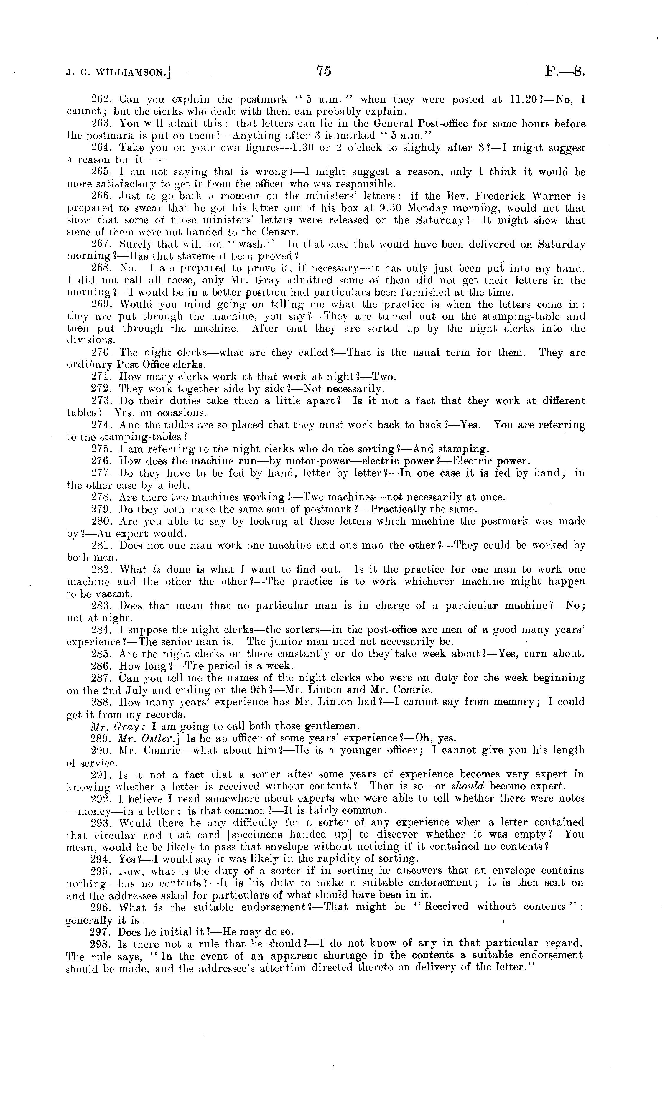 262. Can you explain the postmark "5 a.m." when they were posted at 11.20? —No, I cannot; but the clerks who dealt with them can probably explain. 263. You will admit this : that letters can lie in the General Post-office for some hours before the postmark is put on them? —Anything after 3 is marked " 5 a.m." 264. Take you on your own figures —1.30 or 2 o'clock to slightly after 3? —I might suggest a reason for it 265. I am not saying that is wrong?—l might suggest a reason, only 1 think it would be more satisfactory to get it from the officer who was responsible. 266. Just to go back a moment on the ministers' letters : if the Rev. Frederick Warner is prepared to swear that he got his letter out of his box at 9.30 Monday morning, would not that show that some of those ministers' letters were released on the Saturday?—lt might show that some of them were not handed to the Censor. 267. Surely that will not " wash." In (hat case that would have been delivered on Saturday morning ? —Has that statement been proved ? 268. No. lam prepared to prove it, if necessary —it has only just been put into my hand. I did not call all these, only Mr. Gray admitted some of them did not get their letters in the morning?—l would be in a better position had particulars been furnished at the time. 269. Would you mind going on telling me what the practice is when the letters come in : they are put through the machine, you say?— They arc turned out on the stamping-table and then put through the machine. After that they are sorted up by the night clerks into the divisions. 270. The night clerks—what are they called?— That is the usual term for them. They are ordinary Post Office clerks. 271. How many clerks work at that work at night?— Two. 272. They work together side by side?— Not necessarily. 273. Do their duties take them a little apart? Is it not a fact that they work at different tables?— Yes, on occasions. 274. And the tables are so placed that they must work back to back? —Yes. You are referring to the stamping-tables ? 275. 1 am referring to the night clerks who do the sorting?— And stamping. 276. How does the machine run —by motor-power —electric power?— Electric power. 277. Do they have to be fed by hand, letter by letter? —In one case it is fed by hand; in the other case by a belt. 278. Are there two machines working? —Two machines —not necessarily at once. 279. Do they both make the same sort of postmark?— Practically the same. 280. Are you able to say by looking at these letters which machine the postmark was made by?—An expert would. 281. Does not one man work one machine and one man the other? —They could be worked by both men. 282. What is done is what I want to find out. Is it the practice for one man to work one machine and the other the other ?—The practice is to work whichever machine might happen to be vacant. 283. Does that mean that no particular man is in charge of a particular machine? —No; not at night. 284. 1 suppose the night clerks —the sorters—in the post-office are men of a good many years' experience? —The senior man is. The junior man need not necessarily be. 285. Are the night clerks on there constantly or do they take week about? —Yes, turn about. 286. How long?— The period is a week. 287. Can you tell me the names of the night clerks wdio were on duty for the week beginning on the 2nd July and ending on the 9th? —Mr. Linton and Mr. Comrie. 288. How many years' experience has Mr. Linton had?—l cannot say from memory; I could get it from my records. Mr. Gray: I am going to call both those gentlemen. 289. Mr. Ostler.] Is he an officer of some years' experience?—Oh, yes. 290. Mr. Comrie —what about him?—He is a, younger officer; I cannot give you his length of service. 291. Is it not a fact that a sorter after some years of experience becomes very expert in knowing whether a letter is received without contents ?—That is so —or shoii/ld, become expert. 292. 1 believe I read somewhere about experts who were able to tell whether there were notes —money —in a letter : is that common? —It is fairly common. 293. Would there be any difficulty for a sorter of any experience when a letter contained that circular and that card [specimens handed up] to discover whether it was empty?— You mean, would he be likely to pass that envelope without noticing if it contained no contents? 294. Yes?—l would say it was likely in the rapidity of sorting. 295. isow, what is the duty of a sorter if in sorting he discovers that an envelope contains nothing—has no contents?—lt is his duty to make a suitable endorsement; it is then sent on and the addressee asked for particulars of what should have been in it. 296. What is the suitable endorsement? —That might be "Received without contents": generally it is. i 297. Does he initial it? —He may do so. 298. Is there not a rule that he should? —I do not know of any in that particular regard. The rule says, " In the event of an apparent shortage in the contents a suitable endorsement should be made, and the addressee's attention directed thereto on delivery of the letter."