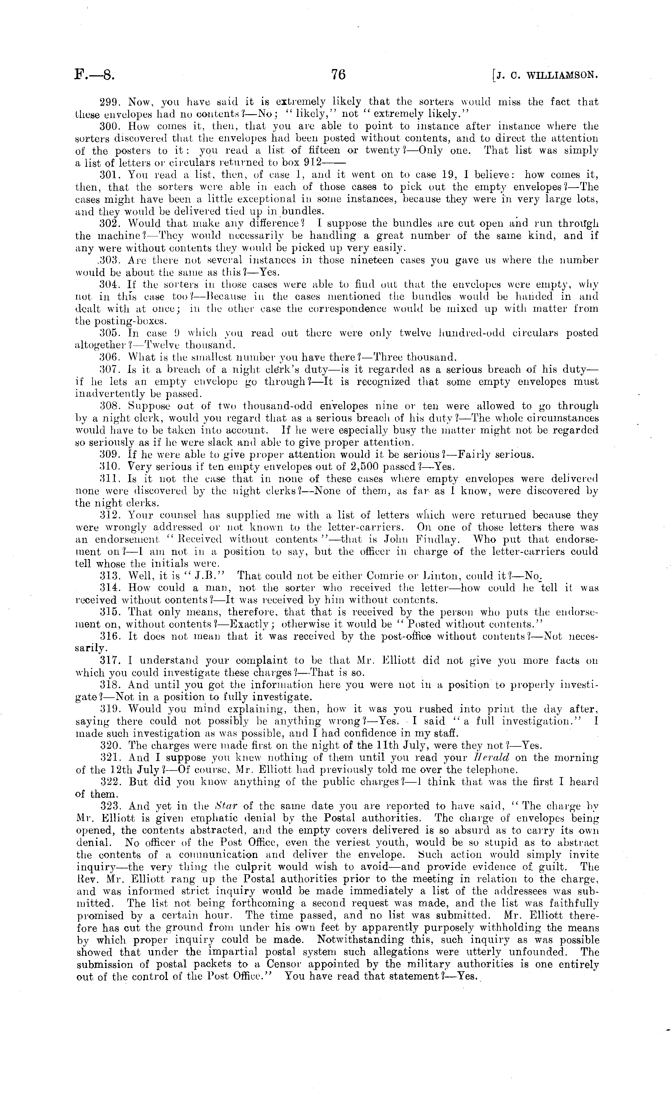 299. Now, you have said it is extremely likely that the sorters would miss the fact that these envelopes had no contents? —No; " likely," not " extremely likely." 300. How comes it, then, that you are able to point to instance after instance where the sorters discovered that the envelopes had been posted without contents, and to direct the attention of the posters to it: yon read a list of fifteen or twenty?— Only one. That list was simply a list of letters or circulars returned to box 912 301. You read a list, then, of ease 1, and it went on to ease 19, I believe: how comes it, then, that the sorters were able in each of those cases to pick, out the empty envelopes?— The cases might have been a little exceptional in some instances, because they were in very large lots, and they would be delivered tied up in bundles. 302. Would that make any difference? I suppose the bundles are cut open and run through the machine? —They would necessarily be handling a great number of the same kind, and if any were without contents they would be picked up very easily. .303. Arc there not several instances in those nineteen cases you gave us where the number would be about the same as this ?—Yes. 304. If the sorters in those cases were able to find out that the envelopes were empty, why not in this case too?— Because in the cases mentioned the bundles would be handed in and dealt with at once; in the other case the correspondence would be mixed up with matter from the posting-boxes. 305. In case 9 which you read out there were only twelve hundred-odd circulars posted altogether ? —Twelve thousand. 306. What is tin; smallest number you have there?— Three thousand. 307. Is it a breach of a night clerk's duty —is it regarded as a serious breach of his duty — if he lets an empty envelope go through?—lt is recognized that some empty envelopes must inadvertently be passed. 308. Suppose out of two thousand-odd envelopes nine or ten were allowed to go through by a night clerk, would you regard that as a serious breach of his duty? —The whole circumstances would have to be taken into account. If he were especially busy the matter might not be regarded so seriously as if he were slack and able to give proper attention. 309. If he were able to give proper attention would it be serious? —Fairly serious. 310. Very serious if ten empty envelopes out of 2,500 passed?— Yes. 311. Is it not the case that, in none of these cases where empty envelopes were delivered none were discovered by the night clerks?— None of them, as far as I know, were discovered by the night clerks. 312. Your counsel has supplied me with a list of letters which were returned because they were wrongly addressed or not known to the letter-carriers. On one of those letters there was an endorsement " Received without contents " —that is John Findlay. Who put that endorsement on?—I am not, in a position to say, but the officer in charge of the letter-carriers could tell whose the initials were. 313. Well, it is " J. 8." That could not be either Comrie or Linton, could it?—No : 314. How could a man, not the sorter who received the letter—how could he tell il was received without contents?—lt was received by him without contents. 315. That only means, therefore, that that is received by the person who puts the endorsement on, without contents? —Exactly; otherwise it would be " Posted without contents." 316. It does not mean that it was received by the post-office without contents?— Not necessarily. 317. I understand your complaint to be that Mr. Elliott did not give you more facts on which you could investigate these charges I —That is so. 318. And until you got the information here you were not in a position to properly investigate?— Not in a position to fully investigate. 319. Would you mind explaining, then, how it. was you rushed into print the day after, saying there could not possibly be anything wrong?— Yes. 1 said "a full investigation." 1 made such investigation as was possible, and I had confidence in my staff. 320. The charges were made first on the night of the 11th July, were they not ?—Yes. 321. And I suppose you knew nothing of them until you read your Herald on the morning of the 12th July? —Of course, Mr. Elliott had previously told me over the telephone. 322. But did you know anything of the public charges?—l think that was the first I heard of them. 323. And yet in the Star of the same date you are reported to have said, " The charge by Mr. Elliott is given emphatic denial by the Postal authorities. The charge of envelopes being opened, the contents abstracted, and the empty covers delivered is so absurd as to carry its own denial. No officer of the Post Office, even the veriest youth, would be so stupid as to abstract the contents of a communication and deliver the envelope. Such action would simply invite inquiry—the very thing the culprit would wish to avoid—and provide evidence of, guilt. The Rev. Mr. Elliott rang up the Postal authorities prior to the meeting in relation to the charge, and was informed strict inquiry would be made immediately a list of the addressees was submitted. The list, not being forthcoming a second request was made, and the list was faithfully promised by a certain hour. The time passed, and no list was submitted. Mr. Elliott therefore has cut the ground from under his own feet by apparently purposely withholding the means by which proper inquiry could be made. Notwithstanding this, such inquiry as was possible showed that under the impartial postal system such allegations were utterly unfounded. The submission of postal packets to a Censor appointed by the military authorities is one entirely out of the control of the Post Office." You have read that statement?— Yes.