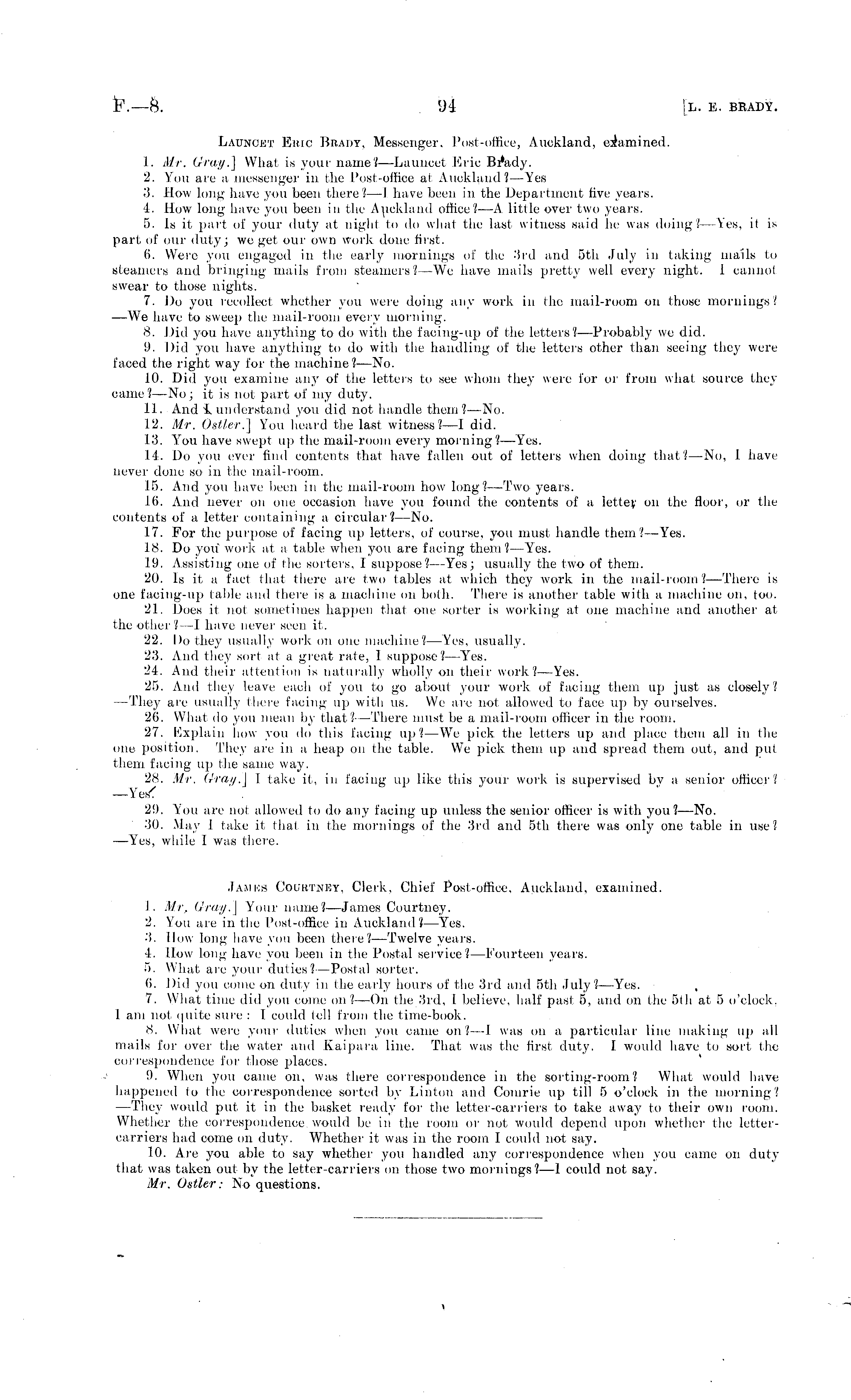 Launoet Eric Brady, Messenger. Post-office, Auckland, examined. 1. Mr. Gray.] What is your name?—Launcet Eric B)*ady. 2. You are a messenger in the Post-office al Auckland?— Yes 3. How long have you been there?—I have been in the Department five years. 4. How long have you been in the Auckland office?—A little over two years. 5. Is it part of your duty at night to do what the last witness said he was doing.'—Yes, it is part of our duty; we get our own Work done first. 6. Were you engaged in the early mornings of the 3rd and sth July in taking mails to steamers and bringing mails from steamers?—We have mails pretty well every night. I cannot swear to those nights. 7. Do you recollect whether you were doing any work in the mail-room on those mornings ! —We have to sweep the mail-room every morning. 8. Did you have anything to do with the facing-up of the letters?— Probably we did. 9. Did you have anything to do with the handling of the letters other than seeing they were faced the right way for the machine?— No. 10. Did you examine any of the letters to see whom they were for or from what source they came ?—No; it is not part of my duty. 11. And i, understand you did not handle them ?—No. 12. Mr. Ostler.] You heard the last witness?—I did. 13. You have swept up the mail-room every morning?—" Yes. 14. Do you ever find contents that have fallen out of letters when doing thai?—No, I have never done so in the mail-room. 15. And you have been in the mail-room how long?— Two years. 16. And never on one occasion have you found the contents of a letter, on the floor, or the contents of a letter containing a circular?— No. 17. For the purpose of facing up letters, of course, you must handle them?—Yes. 18. Do you work at a table when you are facing them ?—Yes. 19. Assisting one of Ihe sorters, I suppose?— Yes; usually the two of them. 20. Is it a fact that there are two tables at which they work in the mail-room?—There is one facing-up (able and there is a machine on both. There is another table with a machine on, too. 21. Does it nol sometimes happen that one sorter is working at one machine and another at the other ?—I have never seen it. 22. Do they usually work on one machine?—Yes, usually. 23. And they sort at a great rate, I suppose?— Yes. 24. And their attention is naturally wholly on their work?— Yes. 25. And they leave each of you to go about your work of facing them up just as closely? —They are usually there facing up with us. We are not allowed to face up by ourselves. 26. What do you mean by that?-—There must be a mail-room officer in the room. 27. Explain bow you do this facing up?—We pick the letters up and place them all in (he one position. They arc in a heap on the table. We pick them up and spread them out, and put them facing up the same way. 28. Mr. Gray.] I take if, in facing up like this your work is supervised by a senior officer/ —Yes-f 29. You are not allowed to do any facing up unless the senior officer is with you?— No. 30. May 1 lake it that in the mornings of the 3rd and sth there was only one table in use? —Yes, while I was there. James Couktney, Clerk, Chief Post-office, Auckland, examined. 1. Mr, Gray.] Your name?— James Courtney. 2. You are in the Post-office in Auckland?— Yes. 3. How long have you been there?— Twelve years. 4. How long have you been in the Postal service?—Fourteen years. 5. What are your duties?—Postal sorter. 6. Did you come on duty in the early hours of the 3rd and sth July?— Yes. 7. What time did you come on?—On the 3rd, I believe, half past 5, and on Ihe sth at 5 o'clock. lam not quite sure : I could toil from the time-book. 8. What were your duties when you came on?— 1 was on a, particular line making up all mails for over the water and Kaipara, line. That was the first duty. I would have to sort the correspondence for those places. 9. When you came on, was there correspondence in the sorting-room? What would have happened to Hie correspondence sorted by Linton and Comrie up till 5 o'clock in the morning? —They would put it in the basket ready for the letter-carriers to take away to their own room. Whether the correspondence would be in the room or mil would depend upon whether the lettercarriers had come on duty. Whether it was in the room I could not say. 10. Are you able to say whether you handled any correspondence when you came on duty that was taken out by the letter-carriers on those two mornings?—l could not say. Mr. Ostler: No questions.