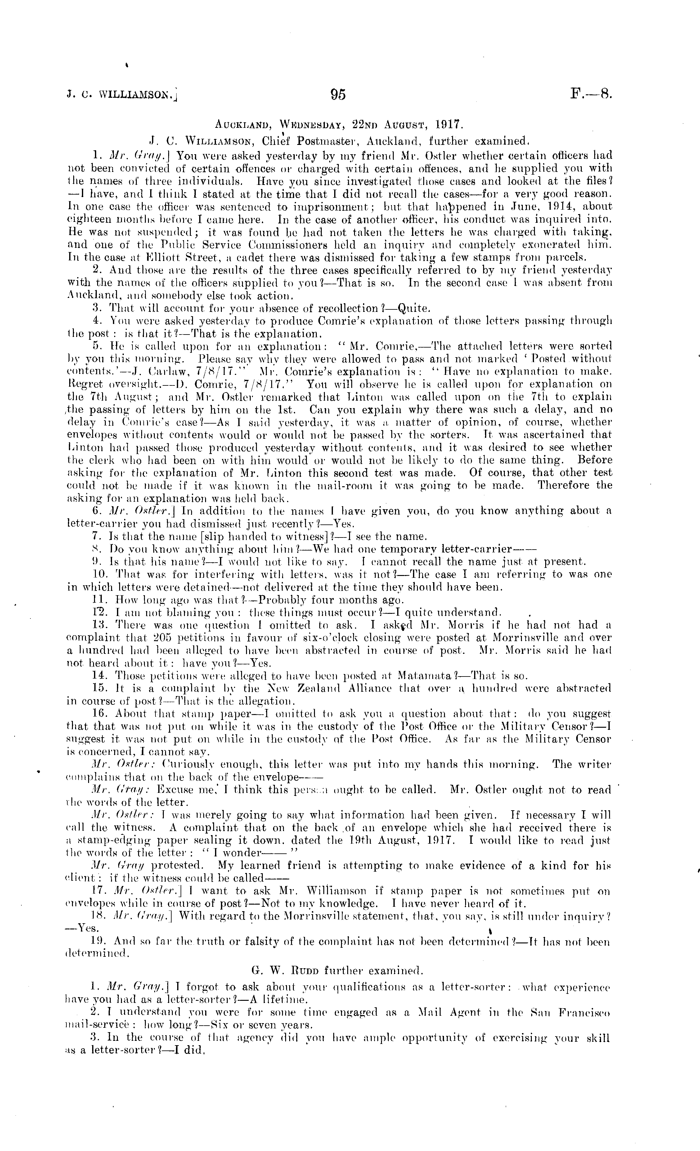 Auckland, Wednesday, 22nd August, 1917. J. C. Williamson, Chief Postmaster, Auckland, further examined, 1. Mr, Gray.] You were asked yesterday by my friend Mr. Ostler whether certain officers had not been convicted of certain offences or charged with certain offences, and he supplied you with the names of three individuals. Have you since investigated those eases and looked at the files? — 1 have, and I think I stated at the time that I did not recall the cases —for a very good reason. In one case the officer was sentenced to imprisonment; but that happened in June, HIM, about eighteen months before I came here. In the case of another officer, his conduct was inquired into. He was not suspended; it was found he had not taken the letters he was charged with taking, and one of the Public Service Commissioners held an inquiry and completely exonerated him. In the case at Elliott Street, a cadet there was dismissed for taking a few stamps from parcels. 2. And those are the results of the three cases specifically referred to by my friend yesterday with the names of the officers supplied to you?— That is so. In the second case I was absent from Auckland, and somebody else took action. 3. That will account for your absence of recollection?— Quite. 4. You were asked yesterday to produce Oomric's explanation of those letters passing through the post : is that it?— That is the explanation. 5. He is called upon for an explanation: "Mr. Comrie, —The attached letters were sorted by you this morning. Please say why they were allowed to pass and not marked ' Posted without contents.'—J. Carlaw, 7/8/17." Mr. Comrie's explanation is: " Have no explanation lo make. Regret oversight.—l). Comrie, 7/8/17." You will observe he is called upon for explanation on the 7th August; and Mr. Ostler remarked that Linton was called upon on the 7th to explain ,the passing of letters by him on the Ist. Can you explain why there was such a delay, and no delay in ('oniric's case?—As I said yesterday, it was a matter of opinion, of course, whether envelopes without contents would or would not be passed by the sorters. It was ascertained that Linton had passed those produced yesterday without contents, and it was desired to see whether the clerk who had been on with him would or would not be likely to do the same thing. Before asking for the explanation of Mr. Linton this second test was made. Of course, that other test oould not be made if it was known in the mail-room it was going to be made. Therefore the asking for an explanation was held back. 6. Mr. Ostler.] In addition lo I he names I have given you, do you know anything about a letter-carrier you had dismissed just recently? —Yes. 7. Is that the name [slip handed lo witness]? —I see the name. 8. Do you know anything about him ! —We had one temporary letter-carrier— 9. Is that his name?—l would not like to say. I cannot recall the name just at present. 10. That was for interfering with letters, was it not?— The case I am referring to was one in which letters were detained —mil delivered at the time they should have been. 11. How long ago was that?— Probably four months ago. 1"2. lam not blaming you : these things must occur?—l quite understand. 13. There was one question I omitted lo ask. I asked Mr. Morris if he had not had a complaint, that 205 petitions in favour of six-o'clock closing were posted at Morrinsville and over a hundred had been alleged to have been abstracted in course of post. Mr. Morris said he hail not heard about it: have you? —Yes. 14. Those petitions were alleged to have been posted at Matamata ?—That is so. 15. It is a complaint by the New Zealand Alliance that over a hundred were abstracted in course of post?— That is the allegation. 16. About that stamp paper —I omitted lo ask you a question about that: do you suggest that that was not put on while it was in the custody of the Post Office or the Military Censor? —I suggest it was not put on while in the custody of the Post Office. As far as the Military Censor is concerned, I cannot say. Mr. Ostler: Curiously enough, this letter was put into my hands this morning. The writer complains that on the back of the envelope Mr. Oray: Excuse me.' 1 think this person ought to be called. Mr. Ostler ought not to read the words of the letter. Mr. Ostler: I was merely going to say what information had been given. If necessary I will call the witness. A complaint that on the back .of an envelope which she had received (here is a stamp-edging paper sealing it down, dated the 19th August, 1917. I would like to read just the words of the letter : " I wonder " Mr. Gray protested. My learned friend is attempting to make evidence of a kind for his client : if the witness could be called 17. Mr. Ostler.] 1 want to ask Mr. Williamson if stamp paper is not sometimes put on envelopes while in course of post?— Not to my knowledge. I have never heard of it. 18. Mr. Graii.] With regard to the Morrinsville statement, that, you say, is still under inquiry? —Yes. ' y 19. And so far the truth or falsity of Ihe complaint has not been determined?—lt has no! been determined, G. W. BuDD further examined. 1. Mr. Gray.] I forgot to ask about your qualifications as a tetter-sorter: what experience have you had as a letter-sorter? —A lifetime. 2. I understand you were for some lime engaged as a Mail Agenl in the San Francisco mail-service : how long? Six or seven years. 3. In the course of thai agency did you have ample opportunity of exercising your skill as a letter-sorter?—l did.