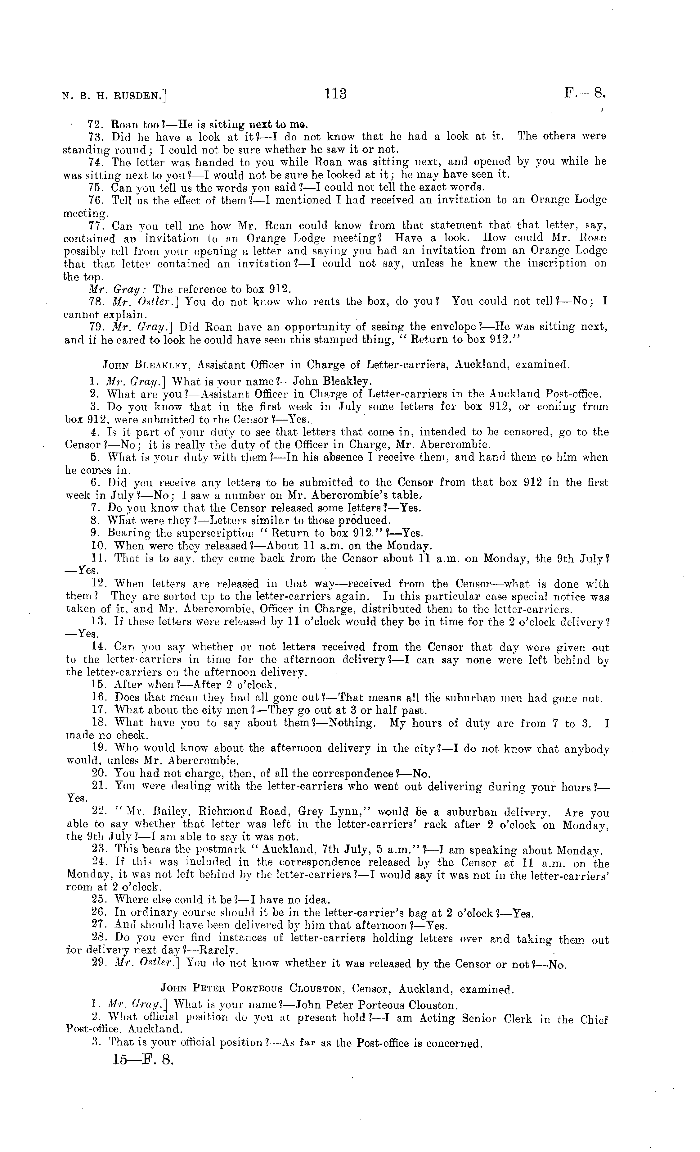 72. Roan too?—He is sitting next to me. 73. Did he have a look at it? —I do not know that he had a look at it. The others were standing round; I could not be sure whether he saw it or not. 74. The letter was handed to you while Roan was sitting next, and opened by you while he was sitting next to you ?—I would not be sure he looked at it; he may have seen it. 75. Can you tell us the words you said ? —I could, not tell the exact words. 76. Tell us the effect of them?—l mentioned I had received an invitation to an Orange Lodge meeting. 77. Can you tell me how Mr. Roan could know from that statement that that letter, say, contained an invitation to an Orange Lodge meeting? Have a look. How could Mr. Roan possibly tell from your opening a letter and saying you had an invitation from an Orange Lodge that that letter contained an invitation ? —I could not say, unless he knew the inscription on the top. Mr. Gray: The reference to box 912. 78. Mr. Ostler.] You do not know who rents the box, do you? You could not tell?—No; I cannot explain. 79. Mr. Gray.] Did Roan have an opportunity of seeing the envelope?—He was sitting next, and if he cared to look he could have seen this stamped thing, " Return to box 912." John Bleakley, Assistant Officer in Charge of Letter-carriers, Auckland, examined. 1. Mr. Gray.] What is your name?— John Bleakley. 2. What are you? —Assistant Officer in Charge of Letter-carriers in the Auckland Post-office. 3. Do you know that in the first week in July some letters for box 912, or coming from box 912, were submitted to the Censor?— Yes. 4. Is it part of your duty to see that letters that come in, intended to be censored, go to the Censor?—No; it is really the duty of the Officer in Charge, Mr. Abercrombie. 5. What is your duty with them?—ln his absence I receive them, and hand them to him when he comes in. 6. Did you receive any letters to be submitted to the Censor from that box 912 in the first week in July? —No; I saw a number on Mr. Abercrombie's table, 7. Do you know that the Censor released some letters? —Yes. 8. What were they?— Letters similar to those produced. 9. Bearing the superscription " Return to box 912"?— Yes. 10. When were they released ?—About 11 a.m. on the Monday. 11. That is to say, they came back from the Censor about 11 a.m. on Monday, the 9th July? —Yes. 12. When letters are released in that way—received from the Censor—what is done with them?— They are sorted up to the letter-carriers again. In this particular case special notice was taken of it, and Mr. Abercrombie, Officer in Charge, distributed them to the letter-carriers. 13. If these letters were released by 11 o'clock would they be in time for the 2 o'clock delivery? —Yes. 14. Can you say whether or not letters received from the Censor that day were given out to the letter-carriers in time for the afternoon delivery?—l can say none were left behind by the letter-carriers on the afternoon delivery. 15. After when? —After 2 o'clock. 16. Does that mean-they had all gone out?— That means all the suburban men had gone out. 17. What about the city men ?—They go out at 3 or half past. 18. What have you to say about them? —Nothing. My hours of duty are from 7 to 3. I made no check. 19. Who would know about the afternoon delivery in the city?—l do not know that anybody would, unless Mr. Abercrombie. 20. You had not charge, then, of all the correspondence?— No. 21. You were dealing with the letter-carriers who went out delivering during your hours?— Yes. 22. " Mr. Bailey, Richmond Road, Grey Lynn," would be a suburban delivery. Are you able to say whether that letter was left in the letter-carriers' rack after 2 o'clock on Monday, the 9th July ?—I am able to say it was not. 23. This bears the postmark " Auckland, 7th July, 5 a.m." I—l am speaking about Monday. 24. If this was included in the correspondence released by the Censor at 11 a.m. on the Monday, it was not left behind by the letter-carriers ?—I would say it was not in the letter-carriers' room at 2 o'clock. 25. Where else could it be? —I have no idea. 26. In ordinary course should it be in the letter-carrier's bag at 2 o'clock?— Yes. 27. And should have been delivered by him that afternoon?— Yes. 28. Do you ever find instances of letter-carriers holding letters over and taking them out for delivery next day?— Rarely. 29. Mr. Ostler.] You do not know whether it was released by the Censor or not?— No. John Peter Porteous Clouston, Censor, Auckland, examined. 1. Mr. Gray.] What is your name? —John Peter Porteous Clouston. 2. W T hat official position do you at present hold? —I am Acting Senior Clerk in the Chief Post-office, Auckland. 3. That is your official position? —As far as the Post-office is concerned.