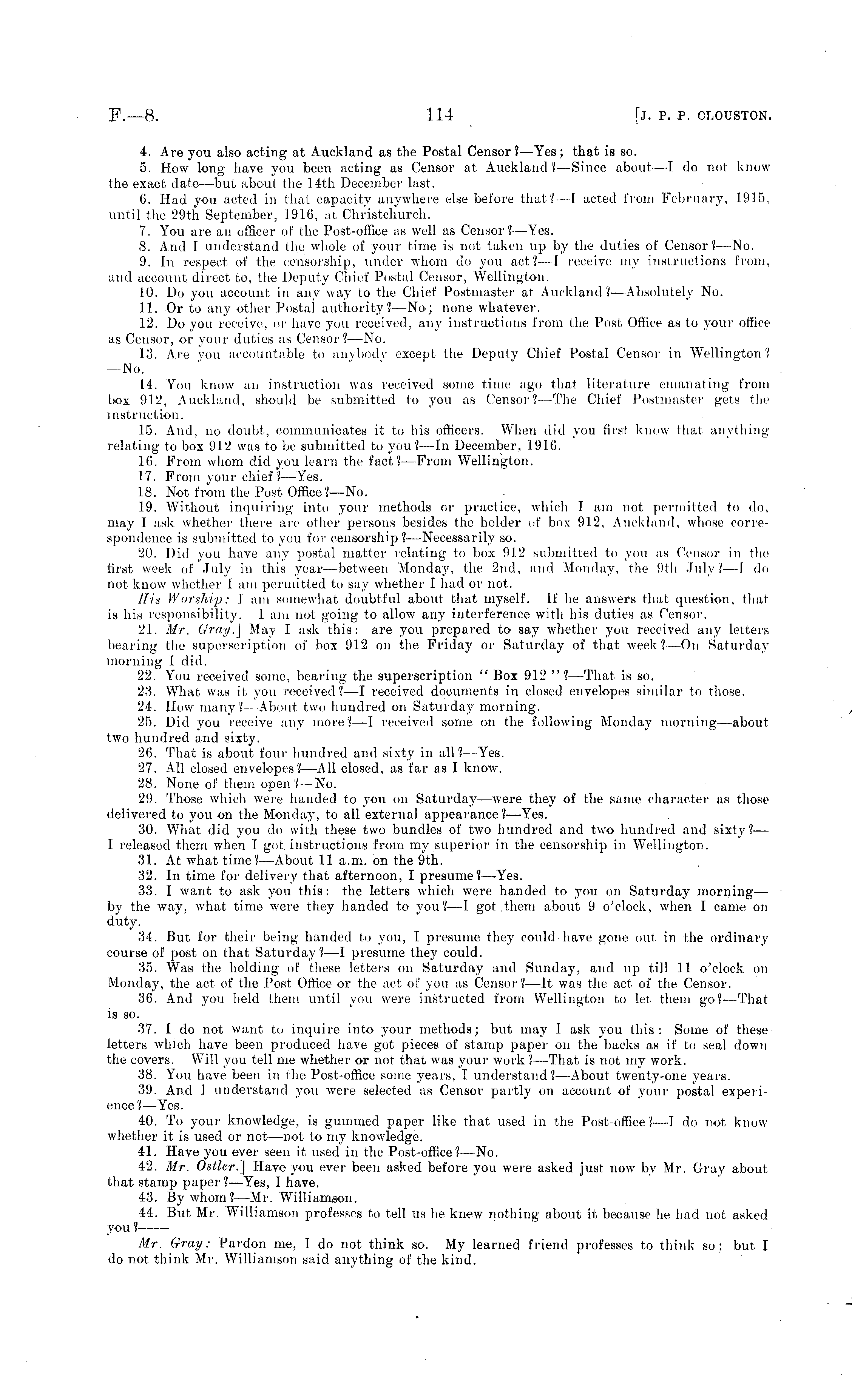 4. Are you also acting at Auckland as the Postal Censor? —Yes; that is so. 5. How long have you been acting as Censor at Auckland? —Since about—l do not know the exact date—but about the 14th December last. 6. Had you acted in that capacity anywhere else before that? —I acted from February, 1915, until the 29th September, 1916, at Christchurch. 7. You are an officer of the Post-office as well as Censor? —Yes. 8. And I understand the whole of your time is not taken up by the duties of Censor? —No. 9. In respect of the censorship, under whom do you act?—l receive my instructions from, and account direct to, the Deputy Chief Postal Censor, Wellington. 10. Do you account in any way to the Chief Postmaster at Auckland? —Absolutely No. 11. Or to any other Postal authority?—No; none whatever. 12. Do you receive, or have you received, any instructions from the Post Olfice as to your office as Censor, or your duties as Censor? —No. 13. Are you accountable to anybody except the Deputy Chief Postal Censor in Wellington ? — No. 14. You know an instruction was received some time ago that literature emanating from box 912, Auckland, should be submitted to you as Censor?— The Chief Postmaster gets the instruction. 15. And, no doubt, communicates it to his officers. When did you lirsl know that anything relating to box 91.2 was to be submitted to you? —In December, 1916, 16. From whom did you learn the fact? —From Wellington. 17. From your chief? —Yes. 18. Not from the Post Office?— No. 19. Without inquiring into your methods or practice, which I am not permitted to do, may I ask whether there arc other persons besides the holder of box 912, Auckland, whose correspondence is submitted to you. for censorship?— Necessarily so. 20. Did you have any postal matter relating to box 912 submitted to you as Censor in the first week of July in this year —between Monda)', the 2nd, and Monday, the 9th July?—l do not know whether I am permitted to say whether I had or not. His Worship: lam somewhat doubtful about that myself. If he answers that question, that is his responsibility. lam not going to allow any interference with his duties as Censor. 21. Mr. Gray.] May I ask this: are you prepared to say whether you received any letters bearing the superscription of box 912 on the Friday or Saturday of that week?—On Saturday morning I did. 22. You received some, bearing the superscription " Box 912 " ?—That is so. 23. What was it you received?—l received documents in closed envelopes similar to those. 24. How many ?— -About two hundred on Saturday morning. 25. Did you receive any more?—l received some on the following Monday morning—about two hundred and sixty. 26. That is about four hundred and sixty in all? —Yes. 27. All closed envelopes?— All closed, as far as I know. 28. None of them open?— No. 29. Those which were handed to you on Saturday—were they of the same character as those delivered to you on the Monday, to all external appearance?— Yes. 30. What did you do with these two bundles of two hundred and two hundred and sixty?— I released them when I got instructions from my superior in the censorship in Wellington. 31. At what time?— About 11 a.m. on the 9th. 32. In time for delivery that afternoon, I presume? —Yes. 33. I want to ask you this: the letters which were handed to you on Saturday morning— by the way, what time were they handed to you?—l got them about, 9 o'clock, when I came on duty. 34. But for their being handed to you, I presume they could have gone oul in the ordinary course of post on that Saturday?—l presume they could. 35. Was the holding of these letters on Saturday and Sunday, and up till 11 o'clock on Monday, the act of the Post Office or the act of you as Censor?—lt was the act of the Censor. 36. And you held them until you were instructed from Wellington to let them go?— That is so. 37. I do not want to inquire into your methods; but may 1 ask you this: Some of these letters which have been produced have got pieces of stamp paper on the backs as if to seal down the covers. Will you tell me whether or not that was your work ? —That is not my work. 38. You have been in the Post-office some years, I understand? —About twenty-one years. 39. And I understand you were selected as Censor partly on account of your postal experience?— Yes. 40. To your knowledge, is gummed paper like that used in the Post-office?—l do not know whether it is used or not —not to my knowledge. 41. Have you ever seen it used in the Post-office?— No. 42. Mr. Ostler.] Have you ever been asked before you were asked just now by Mr. Gray about that stamp paper?— Yes, I have. 43. By whom?— Mr. Williamson. 44. But Mr. Williamson professes to tell us he knew nothing about it because he had not asked you ? Mr. Gray: Pardon me, 1 do not think so. My learned friend professes to think so; but I do not think Mr. Williamson said anything of the kind.
