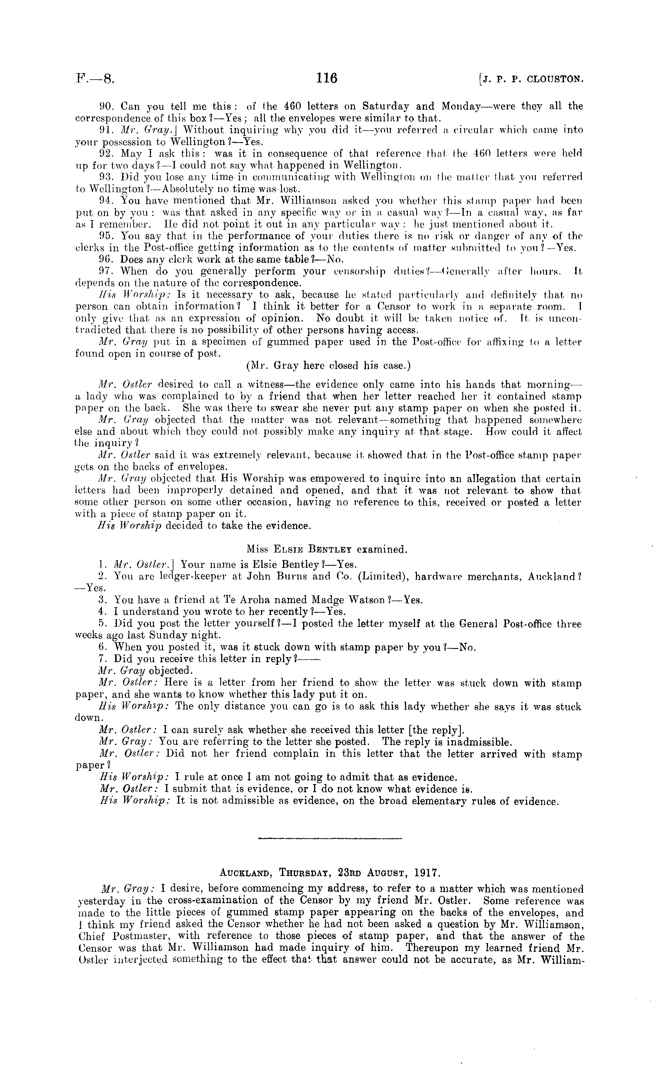 Auckland, Thursday, 23rd August, 1917. Mr. Gray: I desire, before commencing my address, to refer to a matter which was mentioned yesterday in the cross-examination of the Censor by my friend Mr. Ostler. Some reference was made to the little pieces of gummed stamp paper appearing on the backs of the envelopes, and I think my friend asked the Censor whether he had not been asked a question by Mr. Williamson, Chief Postmaster, with reference to those pieces of stamp paper, and that the answer of the Censor was that Mr. Williamson had made inquiry of him. Thereupon my learned friend Mr. Ostler interjected something to the effect that that answer could not be accurate, as Mr. William-