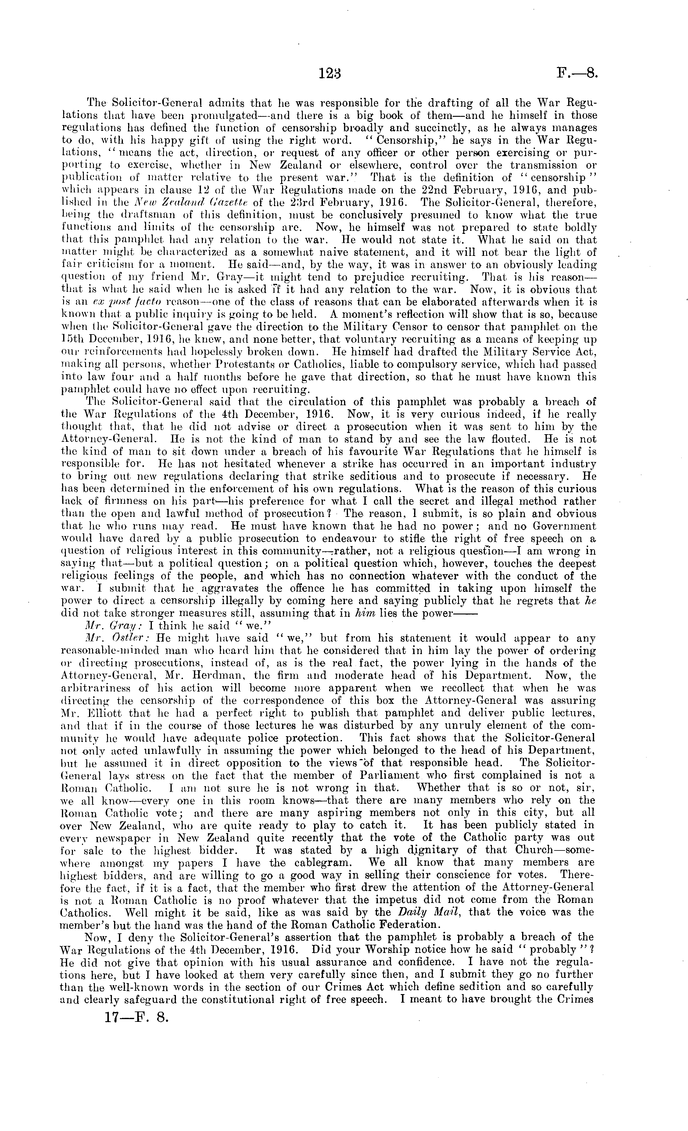 The Solicitor-General admits that he was responsible for the drafting of all the War Regulations that have been promulgated—and there is a big book of them —and he himself in those regulations has defined the function of censorship broadly and succinctly, as he always manages to do, with his happy gift of using the right word. " Censorship," he says in the War Regulations, "means the act, direction, or request of any officer or other person exercising or purporting to exercise, whether in New Zealand or elsewhere, control over the transmission or publication of matter relative to the present war." That is the definition of "censorship" which appears in clause 12 of the War Regulations made on the 22nd February, 1916, and published in the New Zealand Gazette of the 23rd February, 1916. The Solicitor-General, therefore, being the draftsman of this definition, must be conclusively presumed to know what the true functions and limits of the censorship are. Now, he himself was not prepared to state boldly that this pamphlet had any relation to the war. He would not state it. What he said on that matter might be characterized as a somewhat naive statement, and it will not bear the light of fair criticism for a moment. He said —and, by the way, it was in answer to an obviously leading question of my friend Mr. Gray—it might tend to prejudice recruiting. That is his reason— that is what he said when ho is asked Tf it had any relation to the war. Now, it, is obvious that is an ex post facto reason—one of the class of reasons that can be elaborated afterwards when it is known that a public inquiry is going to be held. A moment's reflection will show that is so, because when the Solicitor-General gave the direction to the Military Censor to censor that pamphlet on the 15th December, 1916, he knew, and none better, that voluntary recruiting as a means of keeping up our reinforcements had hopelessly broken down. He himself had drafted the Military Service Act, making all persons, whether Protestants or Catholics, liable to compulsory service, which had passed into law four and a half months before he gave that direction, so that he must have known this pamphlet could have no effect upon recruiting. The Solicitor-General said that the circulation of this pamphlet was probably a breach of the War Regulations of the 4th December, 1916. Now, it is very curious indeed, if he really thought, that, that he did not advise or direct, a prosecution when it was sent to him by the Attorney-General. He is not the kind of man to stand by and see the law flouted. He is not the kind of man to sit down under a breach of his favourite War Regulations that he himself is responsible for. He has not hesitated whenever a strike has occurred in an important industry to bring out new regulations declaring that strike seditious and to prosecute if necessary. He has been determined in the enforcement of his own regulations. What is the reason of this curious lack of firmness on his part' —his preference for what I call the secret and illegal method rather than the open and lawful method of prosecution? The reason, 1 submit, is so plain and obvious that he who runs may read. He must have known that he had no power; and no Government would have dared by a public prosecution to endeavour to stifle the right of free speech on a question of religious interest in this community—rrather, not a religious question—l am wrong in saying that—but a political question; on a political question which, however, touches the deepest, religious feelings of the people, and which has no connection whatever with the conduct of the war. I submit that he aggravates the offence he has committed in taking upon himself the power to direct a, censorship illegally by coming here and saying publicly that he regrets that he, did not take stronger measures still, assuming that in him lies the power Mr. Gray: I think he said "we." Mr. Ostler: He might have said "we," but from his statement it would appear to any reasonable-minded man who heard him that he considered that in him lay the power of ordering or directing prosecutions, instead of, as is the real fact, the power lying in the hands of the Attorney-General, Mr. Herdman, the firm and moderate head of his Department. Now, the arbitrariness of his action will become more apparent when we recollect that when he was directing the censorship of the correspondence of this box the Attorney-General was assuring Mr. Elliott that he had a perfect right to publish that pamphlet and deliver public lectures, and that if in the course of those lectures he was disturbed by any unruly element of the community he would have adequate police protection. This fact shows that the Solicitor-General not only acted unlawfully in assuming the power which belonged to the head of his Department, but he assumed it in direct opposition to the views "of that, responsible head. The SolicitorGeneral lays stress on the fact, that the member of Parliament who first complained is not a Roman Catholic. lam not sure he is not wrong in that. Whether that is so or not, sir, we all know —every one in this room knows—that there are many members who rely on the Roman Catholic vote; and there are many aspiring members not only in this city, but all over New Zealand, who are quite ready to play to catch it. It has been publicly stated in every newspaper in New Zealand quite recently that the vote of the Catholic party was out for sale to the highest bidder. It was stated by a high dignitary of that Church—somewhere amongst my papers I have the cablegram. We all know that many members are highest bidders, and are willing to go a good way in selling their conscience for votes. Therefore the fact, if it is a fact, that the member who first drew the attention of the Attorney-General is not a Roman Catholic is no proof whatever that the impetus did not come from the Roman Catholics. Well might it be said, like as was said by