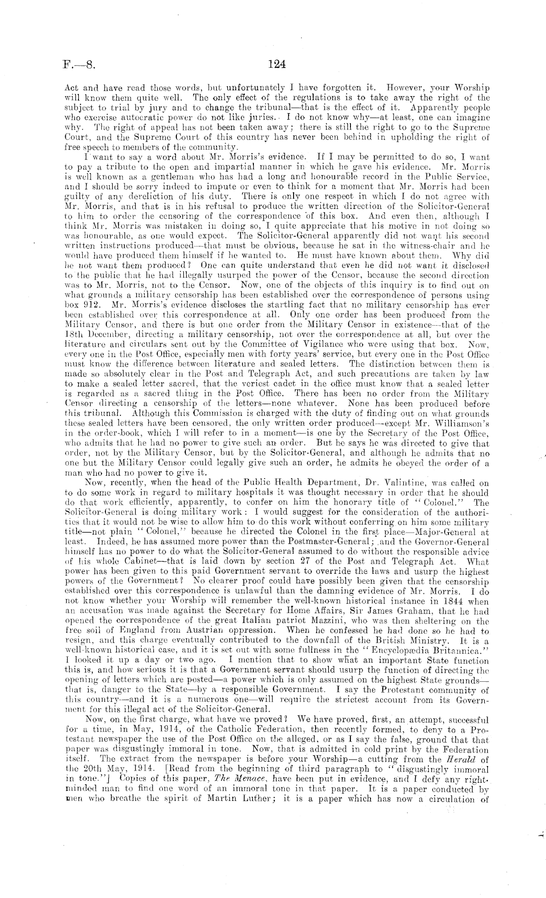 Act and have read those words, but unfortunately I have forgotten it. However, your Worship will know them quite well. The only effect of the regulations is to take away the right of the subject to trial by jury and to change the tribunal—that is the effect of it. Apparently people who exercise autocratic power do not like juries. •I do not know why—at least, one can imagine why. The right of appeal has not been taken away; there is still the right to go to the Supreme Court, and the Supreme Court of this country has never been behind in upholding the right of free speech to members of the community. I'want to say a word about Mr. Morris's evidence. If I may be permitted to do so, I want to pay a tribute to the open and impartial manner in which he gave his evidence. Mr. Morris is well known as a gentleman who has had a long and honourable record in the Public Service, and I should be sorry indeed to impute or even to think for a moment that Mr. Morris had been guilty of any dereliction of his duty. There is only one respect in which I do not agree with Mr. Morris, and that is in his refusal to produce the written direction of the Solicitor-General to him to order the censoring of the correspondence 'of this box. And even then, although I think Mr. Morris was mistaken in doing so, I quite appreciate that his motive in not doing so was honourable, as one would expect. The Solicitor-General apparently did not want his second written instructions produced—that must be obvious, because he sat in the witness-chair and he would have produced them himself if he wanted to. He must have known about them. Why did he not want them produced ? One can quite understand that even he did not want, it disclosed to the public that he had illegally usurped the power of the Censor, because the second direction was to Mr. Morris, not to the Censor. Now, one of the objects of this inquiry is to find out on what grounds a military censorship has been established over the correspondence of persons using box 912. Mr. Morris's evidence discloses the startling fact that no military censorship has ever been established over this correspondence at all. Only one order has been produced from the Military Censor, and there is but one order from the Military Censor in existence—that of the 18th December, directing a military censorship, not over the correspondence at all, but over the literature and circulars sent out by the Committee of Vigilance who were using that box. Now, every one in the Post Office, especially men with forty years' service, but every one in the Post Office must know the difference between literature and sealed letters. The distinction between them is , made so absolutely clear in the Post and Telegraph Act, and such precautions are taken by law to make a sealed letter sacred, that the veriest cadet in the office must know that a sealed letter is regarded as a sacred thing in the Post Office. There has been no order from the Military Censor directing a censorship of the letters—none whatever. None has been produced before this tribunal. Although this Commission is charged with the duty of finding out on what grounds these sealed letters have been censored, the only written order produced—except Mr. Williamson's in the order-book, which I will refer to in a moment —is one by the Secretary of the Post Office, who admits that he had no power to give such an order. But he says he was directed to give that order, not by the Military Censor, but by the Solicitor-General, and although he admits that no one but the Military Censor could legally give such an order, he admits he obeyed the order of a man who had no power to give it. Now, recently, when the head of the Public Health Department, Dr. Valiutine, was called on to do some work in regard to military hospitals it was thought necessary in order that he should do that work efficiently, apparently, to confer on him the honorary title of " Colonel." The Solicitor-General is doing military work : I would suggest for the consideration of the authorities that it would not be wise to allow him to do this work without conferring on him some military title—not plain " Colonel," because he directed the Colonel in the first; place—Major-General at least. Indeed, he has assumed more power than the Postmaster-General; .and the Governor-General himself has no power to do what the Solicitor-General assumed to do without the responsible advice of his whole Cabinet—that is laid down by section 27 of the Post and Telegraph Act. What power has been given to this paid Government servant to override the laws and usurp the highest powers of the Government? No clearer proof could have possibly been given that the censorship established over this correspondence is unlawful than the damning evidence of Mr. Morris. Idp not know whether your Worship will remember the well-known historical instance in 1844 when an accusation was made against the Secretary for Home Affairs, Sir James Graham, that he had opened the correspondence of the great Italian patriot Mazzini, who was then sheltering on the free soil of England from Austrian oppression. When he confessed he had done so he had to resign, and this charge eventually contributed to the downfall of the British Ministry. It is a well-known historical case, and it is set out with some fullness in the " Encyclopaedia Britannica." I looked it up a day or two ago. I mention that to show what an important State function this is, and how serious it is that a Government servant, should usurp the function of directing the opening of letters which are posted—a power which is only assumed on the highest State grounds— that is, danger to the State—by a responsible Government. I say the Protestant community of this country —and it is a numerous one —will require the strictest account from its Government for this illegal act of the Solicitor-General. Now, on the first charge, what have we proved? We have prov