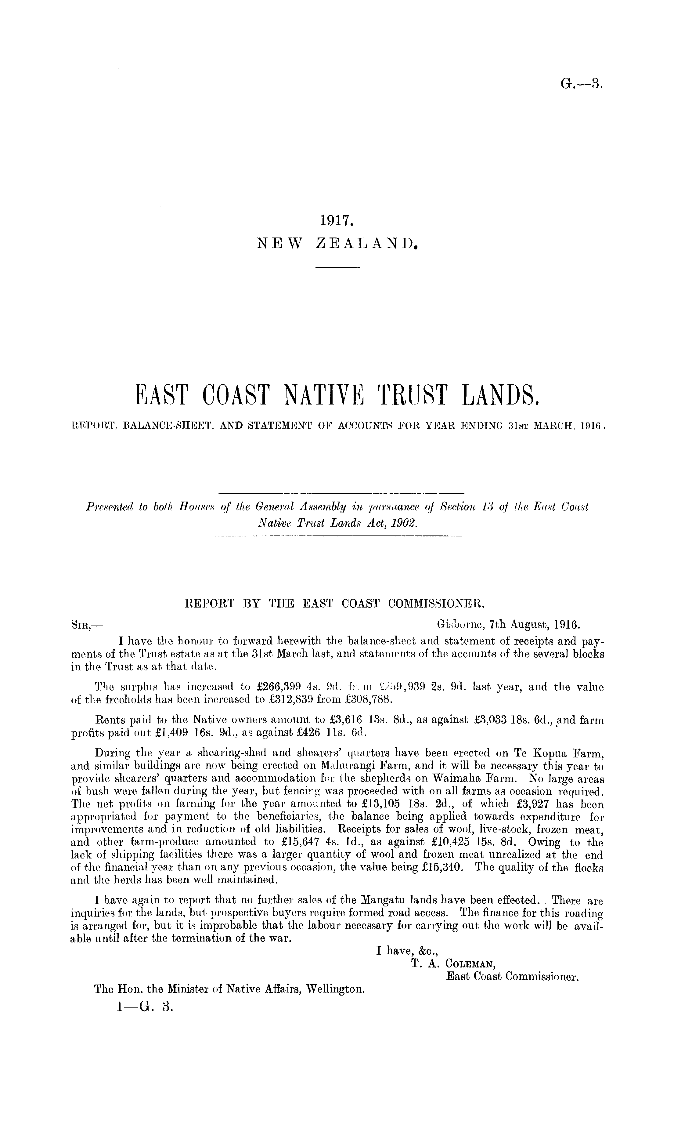 EAST COAST NATIVE TRUST LANDS. REPORT, BALANCE-SHEET, AND STATEMENT OF ACCOUNTS FOR YEAR ENDING 31st MARCH, 1916.
