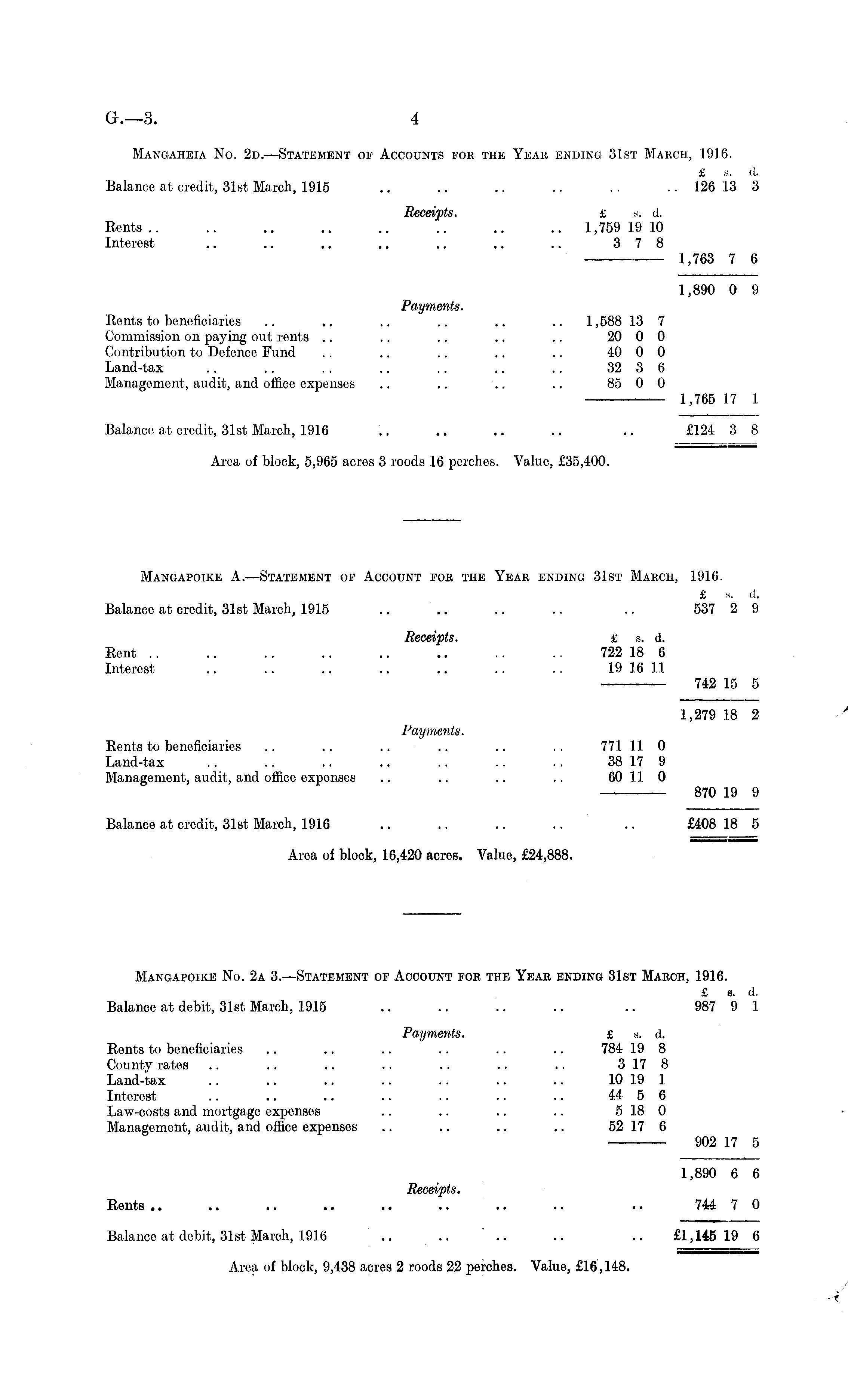 Mangaheia No. 2d.—Statement of Accounts for the Year ending 31st March, 1916. £ s. d. Balance at credit, 31st March, 1915 .. .. .. .. .. .. 126 13 3 Receipts. £ s. .4 Rents .. .. .. .. .. .. .. .. 1,759 19 10 Interest .. .. .. .. .. .. .. 378 1,763 7 6 1,890 0 9 Payments. Rents to beneficiaries .. .. .. .. .. .. 1,588 13 7 Commission on paying out rents ., .. .. .. .. 20 0 0 Contribution to Defence Fund .. .. .. .. .. 40 0 0 Land-tax .. .. .. .. .. .. .. 32 3 6 Management, audit, and office expenses .. .. .. .. 85 0 0 1,765 17 1 Balance at credit, 31st March, 1916 .. .. .. .. .. £124 3 8 Area of block, 5,965 acres 3 roods 16 perches. Value, £35,400. Mangapoike A.—Statement of Account for the Year ending 31st March, 1916. £ s. d. Balance at credit, 31st March, 1915 .. .. .. .. .. 537 2 9 Receipts. £ s. d. Rent .. .. .. .. .. .. .. .. 722 18 6 Interest .. .. .. .. .. .. .. 19 16 11 — 742 15 5 1,279 18 2 Payments. Rents to beneficiaries .. .. .. .. .. .. 771 11 0 Land-tax .. .. .. .. .. .. .. 38 17 9 Management, audit, and office expenses .. .. .. .. 60 11 0 870 19 9 Balance at credit, 31st March, 1916 .. .. .. .. .. £408 18 5 Area of block, 16,420 acres. Value, £24,888. Mangapoike No. 2a 3. —Statement of Account for the Year ending 31st March, 1916. £ s. d. Balance at debit, 31st March, 1915 .. .. .. .. .. 987 9 1 Payments. £ s. d. Rents to beneficiaries .. .. .. .. .. .. 784 19 8 County rates .. .. .. .. .. .. .. 3 17 8 Land-tax .. .. .. .. .. .. .. 10 19 1 Interest .. .. .. .. .. .. .. 44 5 6 Law-costs and mortgage expenses .. .. .. .. 5 18 0 Management, audit, and office expenses .. .. .. .. 52 17 6 902 17 5 1,890 6 6 Receipts. Rents .. .. .. .. .. .. .. .. .. 744 7 0 Balance at debit, 31st March, 1916 .. .. .. .. .. £1,145 19 6 Area of block, 9,438 acres 2 roods 22 perches. Value, £16,148.