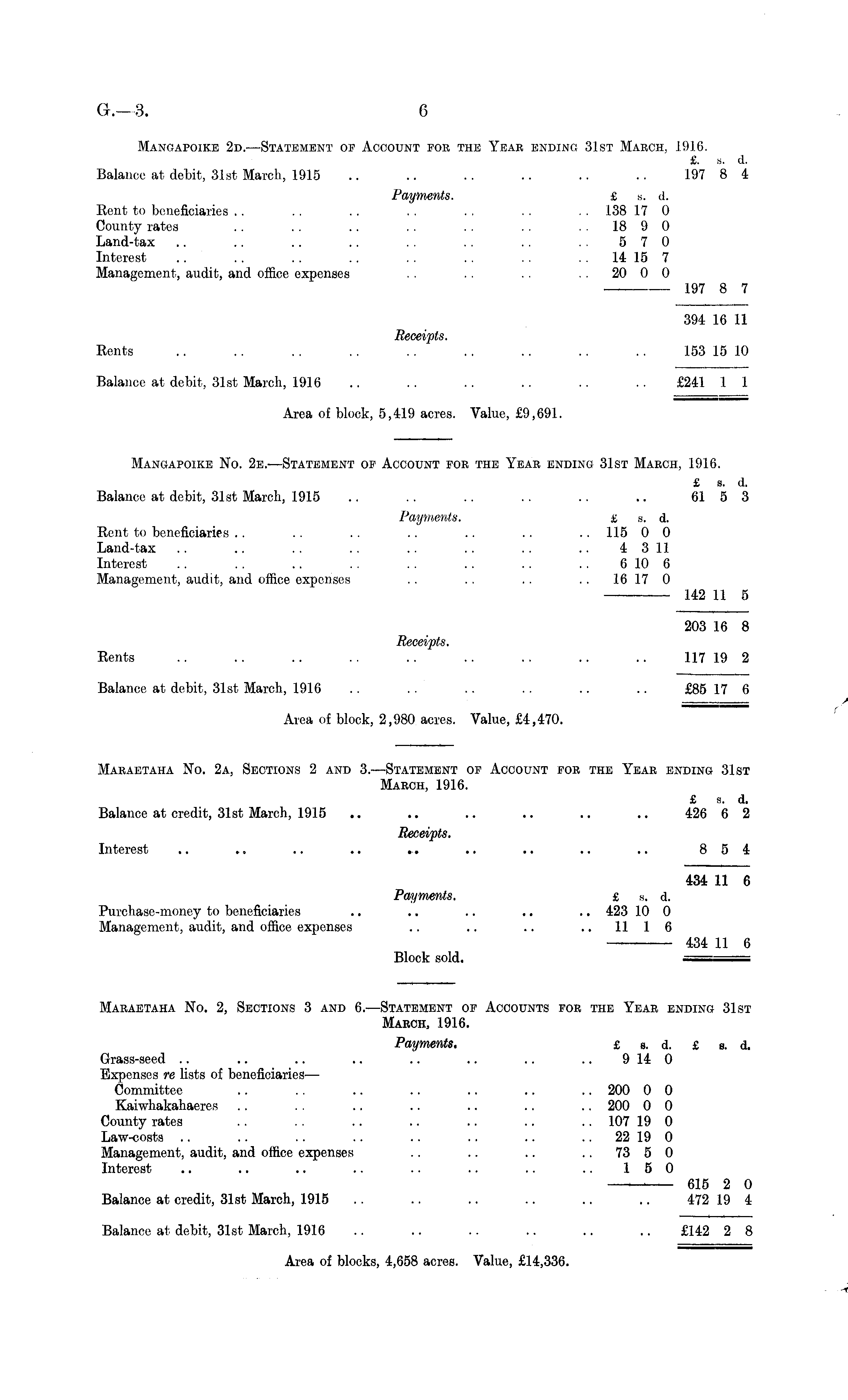 Mangapoike 2d.- —Statement of Account for the Year ending 31st March, 1.91.6. £. s. d. Balance at debit, 31st March, 1915 .. .. .. .. .. .. 197 8 4 Payments. £ s. d. Rent to beneficiaries .. .. .. .. .. .. 138 17 0 County rates .. .. .. .. .. .. 18 9 0 Land-tax .. .. .. .. .. .. .. .. 570 Interest .. .. .. .. .. .. .. 14 15 7 Management, audit, and office expenses .. .. 20 0 0 ■ — 197 8 7 394 16 11 Receipts. Rents .. .. .. .. .. .. .. .. .. 153 15 10 Balance at debit, 31st March, 1916 .. .. .. .. .. .. £241 1 1 Area of block, 5,419 acres. Value, £9,691. Mangapoike No. 2b. —Statement of Account for the Year ending 31st March, 1916. £ s. d. Balance at debit, 31st March, 1915 .. .. .. .. .. .. 61 5 3 Payments. £ s. d. Rent to beneficiaries .. .. .. .. .. .. .. 115 0 0 Land-tax .. .. .. .. .. .. .. .. 4 311 Interest .. . . .. .. . . .. .. .. 610 6 Management, audit, and office expenses .. .. .. 16 17 0 142 11 5 203 16 8 Receipts. Rents .. .. .. .. .. .. .. .. 117 19 2 Balance at debit, 31st March, 1916 .. .. .. .. .. .. £85 17 6 Area of block, 2,980 acres. Value, £4,470. Maraetaha No. 2a, Sections 2 and 3. —Statement of Account for the Year ending 31st March, 1916. £ s. d. Balance at credit, 31st March, 1915 .. .. .. .. .. .. 426 6 2 Receipts. Interest .. .. .. .. .. .. .. .. .. 854 434 11 6 Payments. £ s. d. Purchase-money to beneficiaries .. .. .. .. .. 423 10 0 Management, audit, and office expenses .. .. .. .. 1116 434 11 6 Block sold. - Maraetaha No. 2, Sections 3 and 6.—Statement of Accounts for the Year ending 31st March, 1916. Payments. £ B . d. £ s. d. Grass-seed .. .. .. .. .. .. .. .. 9 14 0 Expenses re lists of beneficiaries— Committee .. . . .. .. .. .. .. 200 0 0 Kaiwhakahaeres .. .. .. .. .. .. .. 200 0 0 County rates .. .. .. .. .. .. .. 107 19 0 Law-costs .. .. .. .. .. .. .. 22 19 0 Management, audit, and office expenses .. .. .. 73 5 0 Interest .. .. .. .. .. .. .. .. 150 — 615 2 0 Balance at credit, 31st March, 1915 .. .. .. .. .. .. 472 19 4 Balance at debit, 31st March, 1916 .. .. ... .. .. .. £142 2 8 Area of blocks, 4,658 acres. Value, £14,336.