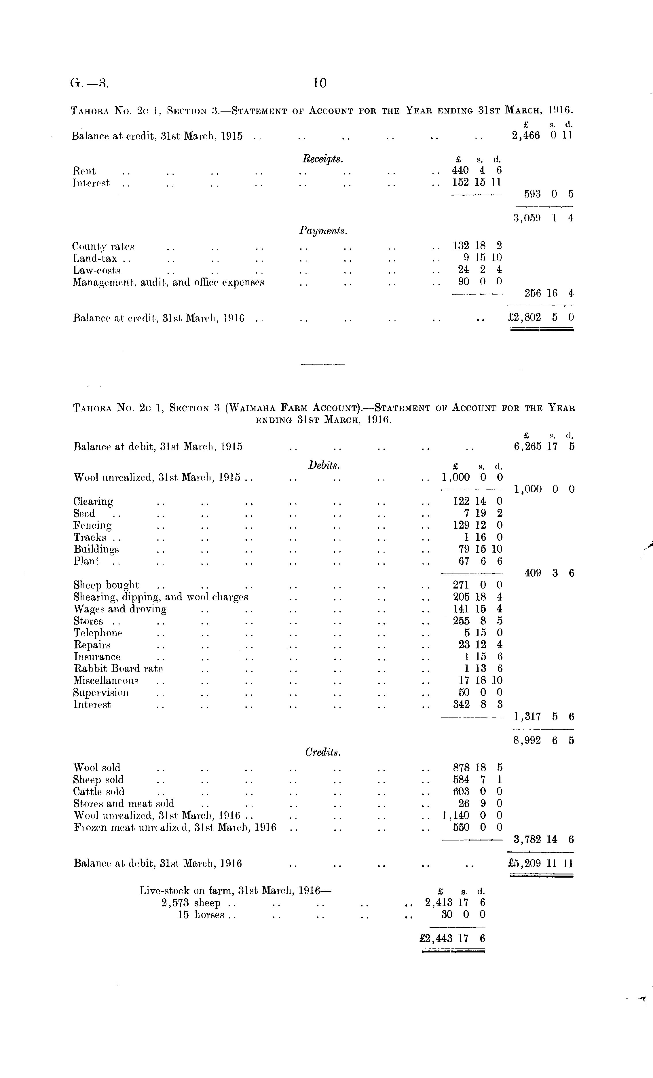 Tahora No. 2c 1, Section 3.—Statement of Account for the Year ending 31st March, 1916. £ s. d. Balance at credit, 31st March, 1915 .. .. .. .. .. 2,466 Oil Receipts. £ s. d. Rent .. .. .. .. .. .. .. .. 440 4 6 Interest .. .. .. .. .. .. .. .. 152 15 11 593 0 5 3,05! I I 4 Payments. County rates .. .. .. .. .. .. .. 132 18 2 Land-tax .. .. .. .. .. .. .. .. 9 15 10 Law-costs .. .. .. .. .. .. 24 2 4 Management, audit, and office expenses .. .. .. 90 0 0 • 256 16 4 Balance at credit, 31st March, 1916 .. .. .. .. .. .. £2,802 5 0 Tahora No. 2c 1, Section 3 (Waimaha Farm Account). —Statement of Account for the Year ending 31st March, 1916. £ e. d. Balance at debit, 31st March, 1915 .. .. .. .. .. 6,265 17 5 Debits. £ s. d. Wool unrealized, 31st March, 1915 .. .. .. .. .. 1,000 0 0 1 ( ot)() 0 0 Clearing .. .. .. .. .. .. .. 122 14 0 Seed .. . . . . . . .. . . .. .. 7 19 2 Fencing .. .. .. .. .. .. .. 129 12 0 Tracks .. .. .. .. .. .. .. .. 1 16 0 Buildings .. .. .. .. .. .. .. 79 15 10 Plant .. . . . . .. .. .. .. . . 67 6 6 409 3 6 Sheep bought .. .. .. .. .. .. .. 271 0 0 Shearing, dipping, and wool charges .. .. . . .. 205 18 4 Wages and droving . . .. .. .. .. .. 141 15 4 Stores .. .. .. .. .. .. .. .. 255 8 5 Telephone . . . . . . . . . . . . . . 5 15 0 Repairs .. .. .. ... • .. .. .. 23 12 4 Insurance . . .. . . . . .. .. .. 1 15 6 Rabbit Board rate .. .. .. . . .. .. 113 6 Miscellaneous .. .. .. .. .. .. .. 17 18 10 Supervision .. .. .. .. .. .. .. 5000 Interest .. . . . . .. .. .. .. 342 8 3 • —■ 1,317 5 6 8,992 6 5 Credits. Wool sold .. .. .. .. .. .. .. 878 18 5 Sheep sold .. .. .. . . .. .. .. 584 7 1 Cattle sold .. .. .. .. .. .. .. 603 0 0 Stores and meat sold .. .. .. . . .. .. 26 9 0 Wool unrealized, 31st March, 1916 .. .. .. .. .. 1,140 0 0 Frozen meat unrealized, 31st March, 1916 .. .. .. .. 550 0 0 . — 3,782 14 6 Balance at debit, 31st March, 1916 .. .. .. .. .. £5,209 1111 Live-stock on farm, 31st March, 1916 — £ s. d. 2,573 sheep .. .. .. .. .. 2,413 17 6 15 horses . . .. .. .. .. 30 0 0 £2,443 17 6