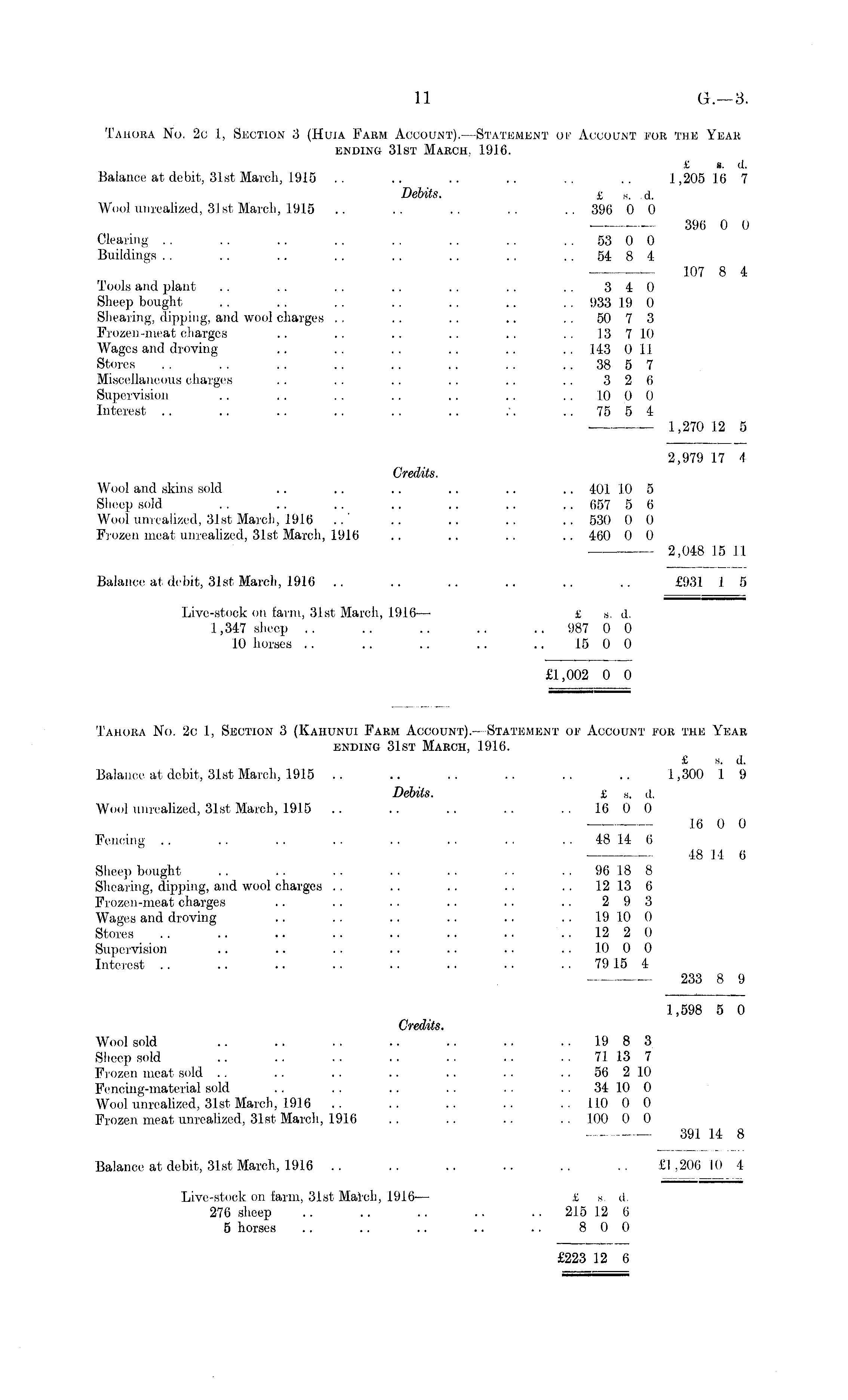 Tahora No. 2c 1, Section 3 (Huia Farm Account). —Statement of Account for the Year ending 31st March. 1916. £ s. d. Balance at debit, 31st March, 1915 .. .. .. .. .. .. 1,205 16 7 Debits. £ s. d. Wool unrealized, 31st March, 191.5 .. .. .. .. . . 396 0 0 . 396 0 0 Clearing .. . . .. .. . . . . . . 53 0 0 Buildings . . .. .. . . . . .. . , 54 8 4 107 8 4 Tools and plant . . .. . . .. .. . . . . 3 4 0 Sheep bought . . .. .. .. .. .. .. 933 19 0 Shearing, dipping, and wool charges .. .. .. .. 50 7 3 Frozen-meat charges . . .. .. .. .. 13 710 Wages and droving .. .. .. .. .. .. 143 011 Stores . . .. .. .. .. .. .. 38 5 7 Miscellaneous charges .. .. .. .. .. .. 3 2 6 Supervision .. .. .. .. .. .. ..1000 Interest .. .. .. . . . . .. .*. ..7554 1,270 12 5 2,979 17 4 Credits. Wool and skins sold .. .. .. .. .. .. 40.1 10 5 Slice]) sold .. . . .. .. .. .. .. 657 5 6 Wool unrealized, 31st March, 1916 ..' .. .. .. .. 530 0 0 Frozen meat unrealized, 31st March, 1916 .. .. .. .. 460 0 0 — 2,048 15 11 Balance at debit, 31st March, 1916 .. .. .. .. .. .. £931 I 5 Live-stock on farm, 31st March, 1916— £ s. d. 1,347 sheep .. .. .. .. .. 987 0 0 10 horses .. .. .. .. .. 15 0 0 £1,002 0 0 Tahora No. 2c 1, Section 3 (Kahunui Farm Account).- Statement of Account for the Year ending 31st March, 1916. £ s. d. Balance at debit, 31st March, 1915 .. .. .. .. .. .. 1,300 1 9 Debits. £ s. d. Wool unrealized, 31st March, 1915 .. .. .. . . ..1600 — 16 0 0 Fencing .. .. .. . . .. .. .. 48 14 6 48 14 6 Sheep bought .. .. .. .. .. .. .. 96 18 8 Shearing, dipping, and wool charges .. .. .. .. 12 13 6 Frozen-meat charges .. .. . . .. .. .. 2 9 3 Wages and droving .. .. .. .. . . 19 10 0 Stores .. 12 2 0 Supervision .. .. .. .. .. .. .. 10 0 0 Interest .. .. .. .. .. .. • • 7915 4 233 8 9 1,598 5 0 Credits. Wool sold .. .. .. .. .. .. 19 8 3 Sheep sold .. .. .. .. .. .. .. 71 13 7 Frozen meat sold . . .. .. .. .. .. 56 2 10 Fencing-material sold .. .. .. .. . . 34 10 0 Wool unrealized, 31st March, 1916 .. .. .. .. .. 110 0 0 Frozen meat unrealized, 31st March, 1916 .. .. .. .. 100 0 0 39.1 1.4 8 Balance at debit, 31st March, 1916 .. .. .. .. .. .. £1,206 10 4 Live-stock on farm, 31st Match, 1916- — £ a. d. 276 sheep .. .. .. .. 215 12 6 5 horses .. .. .. .. .. 8 0 0 £223 12 6