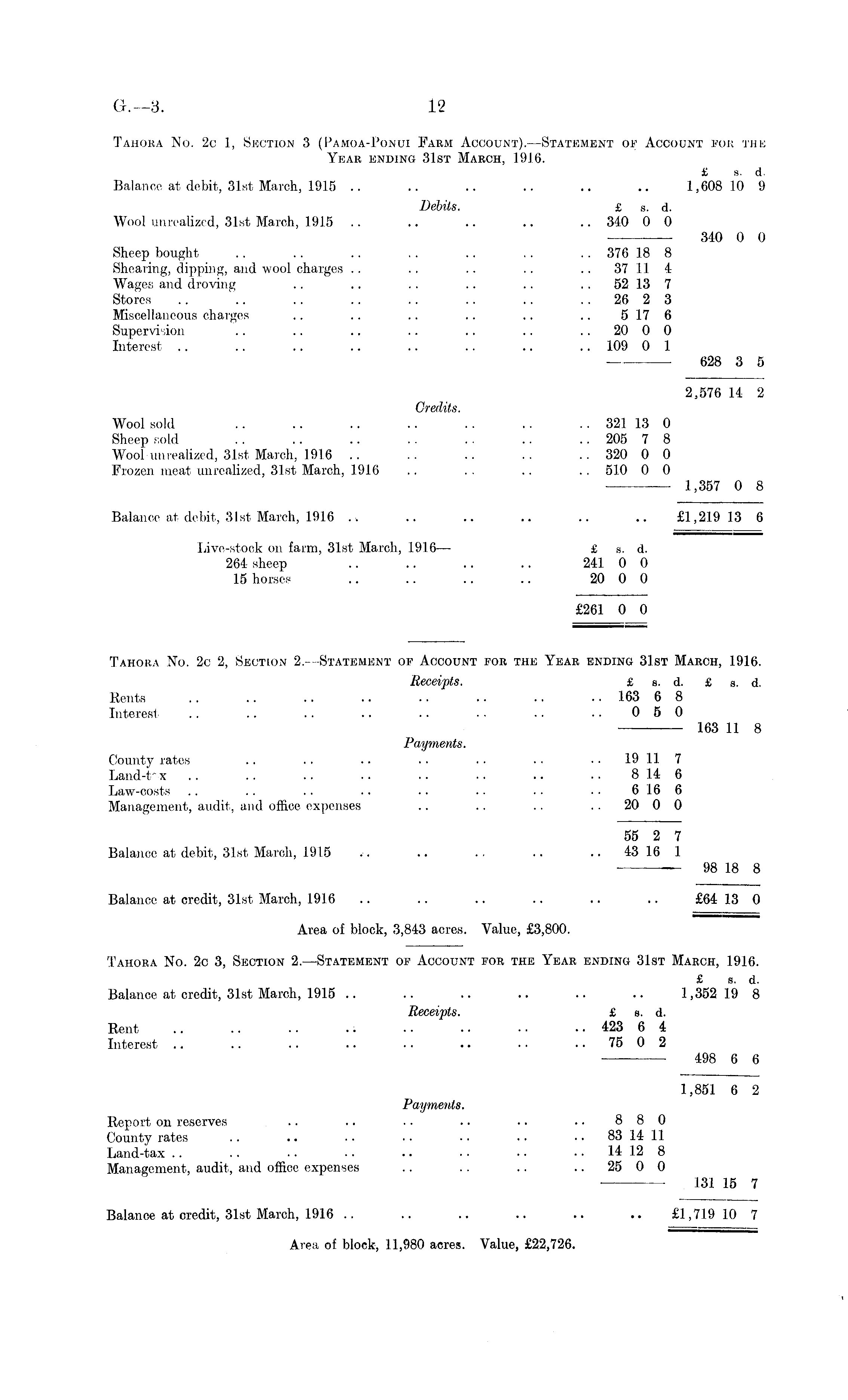 Tahora No. 2c 1, Section 3 (Pamoa-Ponui Farm Account). —Statement of Account for this Year ending 31st March, 1916. £ s. d. Balance at debit, 31st March, 1915 .. .. .. .. .. .. 1,608 10 9 Debits. £ s. d. Wool unrealized, 31st March, 1915 .. .. .. .. .. 340 0 0 340 0 0 Sheep bought .. .. .. .. .. .. .. 376 18 8 Shearing, dipping, and wool charges .. . . .. .. 37 11 4 Wages and droving .. .. . . .. .. 52 13 7 Stores .. .. .. .. .. .. .. .. 26 2 3 Miscellaneous charges .. .. .. .. .. .. 5 17 6 Supervision .. .. .. .. .. .. 20 0 0 Interest .. .. .. .. .. .. .. .. 109 0 1 628 3 5 2,576 14 2 Credits. Wool sold .. .. .. .. .. .. .. 321 13 0 Sheep sold .. .. .. .. .. .. .. 205 7 8 Wool unrealized, 31st March, 1916 .. .. .. .. .. 320 0 0 Frozen meat unrealized, 31st March, 1916 .. . , .. .. 510 0 0 1,357 0 8 Balance at debit, 31st March, 1916 .. .. .. .. .. .. £1,219 13 6 Live-stock on farm, 31st March, 1916 — £ s. d. 264 sheep .. .. .. .. 241 0 0 15 horses .. .. .. .. 20 0 0 £261 0 0 Tahora No. 2c 2, Section 2.- -Statement of Account for the Year ending 31st March, 1916. Receipts. £ s. d. £ s. d. Rents .. .. .. .. •. .. .. .. 163 6 8 Interest .. .. .. .. .. .. .. .. 050 163 11 8 Payments. County rates .. .. .. .'. .. .. 19 11 7 Land-t-x .. .. .. .. .. .. .. .. 8 14 6 Law-costs .. .. .. .. .. .. .. ■ . 6 16 6 Management, audit, and office expenses .. .. .. 20 0 0 55 2 7 Balance at debit, 31st March, 1915 j. .. .. .. .. 43 16 1 — 98 18 8 Balance at credit, 31st March, 1916 .. .. .. .. .. .. £64 13 0 Area of block, 3,843 acres. Value, £3,800. Tahora No. 2c 3, Section 2.—Statement of Account for the Year ending 31st March, 1916. £ s. d. Balance at credit, 31st March, 1915 .. .. .. .. .. .. 1,352 19 8 Receipts. £ s. d. Rent i 423 6 4 Interest .. .. .. .. .. .. •• .. 75 0 2 — 498 6 6 1,851 6 2 Payments. Report on reserves .. .. .. .. .. •• 880 County rates .. .. .. .. .. .. .. 83 14 11 Land-tax .. .. . • • • ■ • • • • • .. 14 12 8 Management, audit, and office expenses .. .. .. 25 0 0 131 15 7 Balance at credit, 31st March, 1916 .. .. .. .. .. .. £1,719 10 7 Area of block, 11,980 acres. Value, £22,726.