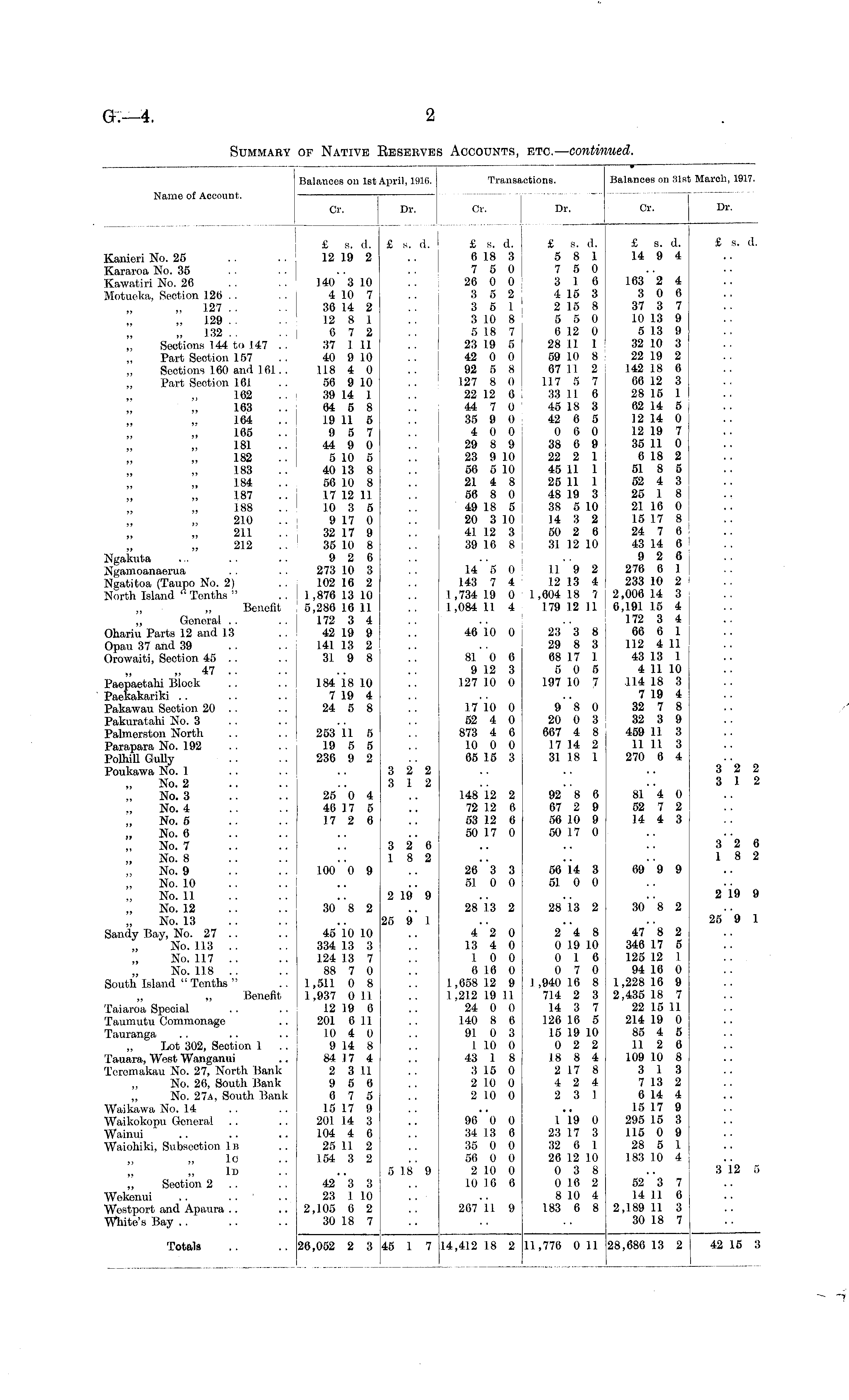 Balances on 1st April, 1916. Name of Account. Cr. Dr. Transi ■ctions. » Balances on illst March, 1917. Cr. Dr. Cr. Dr. Dr. Dr. £ s. d. £ s. d. Kanieri No. 25 . . .. 12 19 2 Kararoa No. 35 Kawatiri No. 26 .. .. 140 3 10 Motueka, Section 126 . . . . 4 10 7 127 .. 36 14 2 „ 129 . . .. 12 8 1 132 .. .. | 6 7 2 Sections 144 to 147 .. 37 1 11 Part Section 157 .. 40 9 10 Sections 160 and 101 . . 118 4 0 Part Section 16J . . 56 9 10 162 .. 39 14 1 163 ... 64 5 8 164 19 11 5 165 9 5 7 181 44 9 0 182 5 10 5 183 .. 40 13 8 1.84 . . 56 10 8 187 .. i 17 12 11 188 .. 10 3 5 210 .. i 9 17 0 211 .. ; 32 17 9 212 .. 35 10 8 Ngakuta ... .. .. 9 2 6 Ngamoanaerua .. .. 273 10 3 Ngatitoa (Taupo No. 2) ... 102 16 2 North Island " Tenths " ... 1 ,876 13 10 Benefit 5,286 16 11 General .. .. 172 3 4 Ohariu Parts 12 and 13 .. 42 19 9 Opau 37 and 39 . . .. 141 13 2 Orowaiti, Section 45 .. .. 31 9 8 „ 47 .. Paepaetahi Block .. .. 1841810 Paekakariki .. .. .. 7 19 4 Pakawau Section 20 . . .. 24 5 8 Pakuratahi No. 3 Palmerston North .. .. 253 11 5 Parapara No. 192 .. .. 19 5 5 Polhill Gully .. .. 236 9 2 Poukawa No. 1 . . .. .. 3 2 2 No. 2 .. .. .. 3 12 No. 3 .. .. 25 0 4 No. 4 .. .. 46 17 5 No. 5 . . . . 17 2 6 No. 6 No. 7 .. .. .. 3 2 6 No. 8 .. .. .. 18 2 No. 9 .. .. 100 0 9 No. 10 No. 11 .. .. .. 2 19 9 No. 12 .. .. 30 8 2 No. 13 .. . . .. 25 9 1 Sandy Bay, No. 27 .. .. 45 10 10 No. 113 .. .. 334 13 3 No. 117 .. . . 124 13 7 No. 118 .. .. 88 7 0 South Island " Tenths" .. 1,511 0 8 Benefit 1,937 0 11 Taiaroa Special .. .. 12 19 6 Taumutu Commonage . . 201 6 1.1 Tauranga .. .. .. 10 4 0 Lot 302, Section 1 .. 9 14 8 Tauara, West Wanganui .. 84 17 4 Teremakau No. 27, North Bank 2 3 11 No. 26, South Bank 9 5 6 No. 27a, South Bank 6 7 5 Waikawa No. 14 . . .. 15 17 9 Waikokopu General .. . . 201 14 3 Wainui .. .. .. 104 4 6 Waiohiki, Subsection In .. 25 11 2 Io .. 154 3 2 Id .. .. 5 18 9 Section 2 .. . . 42 3 3 Wekenui .. .. ■ ... 23 1 10 Wostport and Apaura .. .. 2,105 6 2 White's Bay.:. .. .. 30 18 7 £ s. d. £ s. d. £ s. tl. 6 18 3 5 8 1 7 5 0 7 5 0 26 0 0 3 1 6 3 5 2 4 15 3 3 6 1 2 15 8 3 10 8 5 5 0 5 18 7' 6 12 0 23 19 5 ! 28 11 1 42 0 0 59 10 8 92 5 8 67 11 2 127 8 0 117 5 7 22 12 6 , 33 11 6 44 7 0 45 18 3 35 9 0 42 6 5 4 0 0 0 6 0 29 8 9 38 6 9 23 9 10 22 2 1 56 5 10 45 11 1 | 21 4 8 25 11 1 ' 56 8 0 48 19 3 49 18 5 38 5 10 20 3 10 14 3 2 41 12 3 50 2 6 | 39 16 8 31 12 10 £ s. d. 14 9 4 163 2 4 3 0 6 37 3 7 10 13 9 5 13 9 32 10 3 22 19 2 142 18 6 66 12 3 28 15 1 62 14 5 12 14 0 12 19 7 35 11 0 6 18 2 51 8 5 52 4 3 25 1 8 21 16 0 15 17 8 24 7 6 43 14 6 9 2 6 276 6 1 233 10 2 2,006 14 3 6,191 15 4 172 3 4 66 6 1 112 4 11 43 13 1 4 11 10 114 18 3 7 19 4 32 7 8 32 3 9 459 11 3 11 11 3 270 6 4 £ s. d. 14 5 0 119 2 143 7 4 12 13 4 ! 1,734 19 0 1,604 18 7 1,084 II 4 179 12 11 46 10 0 23 3 8 29 8 3 81 0 6 68 17 1 9 12 3 5 0 5 .127 JO 0 1.97 10 7 17 10 0 9 8 0 52 4 0 20 0 3 873 4 6 667 4 8 10 0 0 17 14 2 j 65 15 3 31 18 1 3 2 2 3 1 2 3~'2 2 3 1 2 148 12 2 92 8 6 72 12 6 67 2 9 | 53 12 6 56 10 9 j 50 17 0 50 17 0 81 4 0 52 7 2 14 4 3 3 2 6 1 8 2 3 2 6 1 8 2 26 3 3 56 14 3 5.1 0 0 51 0 0 69' 9 9 2 19 9 2 19 9 28* 1.3 2 28 13 2 30' 8 2 25 9 1 25 9 1 4 2 0 2 4 8 13 4 0 0 19 10 10 0 0 16 6 16 0 0 7 0 1,658 12 9 J ,940 16 8 1.212 19 11 714 2 3 24 0 0 14 3 7 140 8 6 126 16 5 91 0 3 15 19 10 1 10 0 0 2 2 43 1 8 18 8 4 3 15 0 2 17 8 2 10 0 4 2 4 2 10 0 2 3 1 47 8 2 346 17 5 125 12 1 94 16 0 1,228 16 9 2,435 18 7 22 15 11 214 19 0 85 4 5 11 2 6 109 10 8 3 1 3 7 13 2 6 14 4 15 17 9 295 15 3 115 0 9 28 5 1 183 10 4 5 18 9 96 0 0 I 19 0 34 13 6 23 17 3 35 0 0 32 6 1 56 0 0 26 1.2 10 2 10 0 0 3 8 10 10 6 0 16 2 8 10 4 267 11 9 183 6 8 312 5 52 3 7 14 11 6 2,189 11 3 30 18 7 Totals .. .. 26,052 2 3 45 1 7 26,052 2 3 45 1 7 14,412 18 2 jll ,776 0 11 28,686 13 2 42 15 3