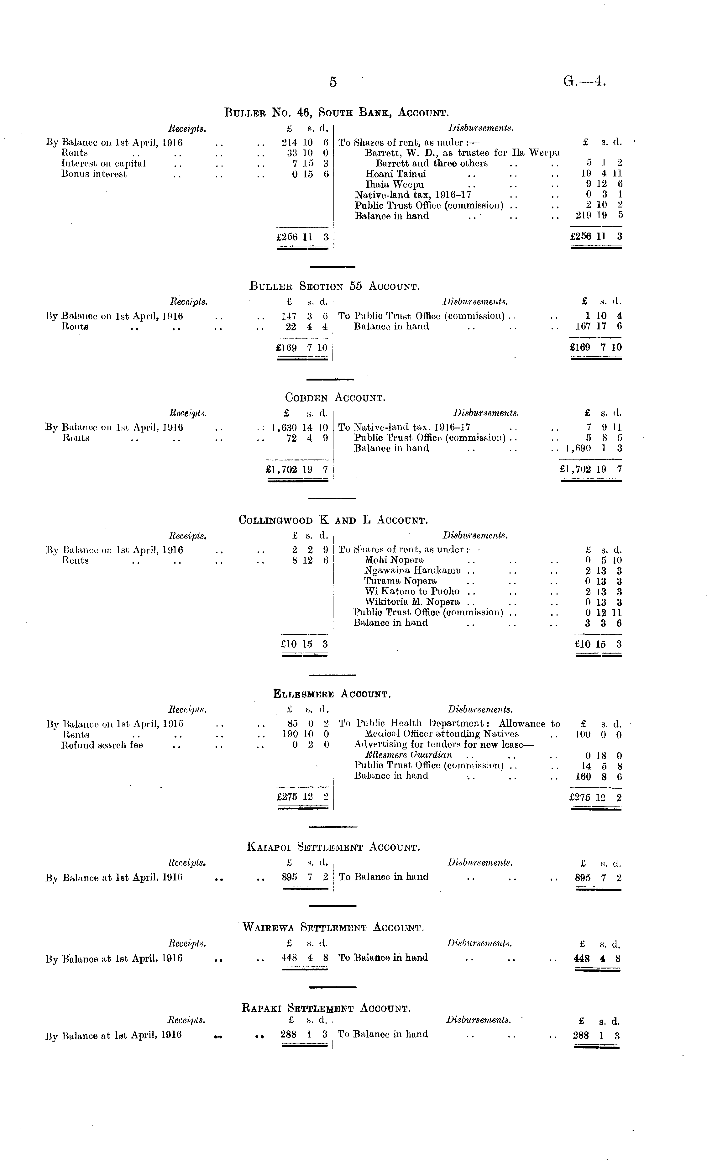 Buller No. 46, South Bank, Account. Receipts. £ s. <l. Disbursements. By Balance on 1st April, 1916 .. .. 21.4 10 6 To Shares of rent, as under:— £ s. d. Rents .. .. .. .. 33 10 0 Barrett, W. D., as trustee for 11a Weepu Interest on capital .. . . .. 7 15 3 Barrett and three others .. .. 5 12 Bonus interest .. .. .. 0 15 0 Hoani Tainui .. .. •• 19 4 11 Ihaia Weepu .. .. .. 9 12 6 Native-land tax, 1916-17 .. .. 0 3 1 Public Trust Office (commission) .. .. 2 10 2 Balance in hand .. .. .. 2.1.9 19 5 £256 11 3 £256 II 3 Buller Section 55 Account. Receipts. £ s. d. Disbursements. £ s. d. liy Balance on. 1st April, .1916 .. .. 147 3 6 To Public Trust Office (commission) . . .. 1 10 4 Rents .. .. .. .. 22 4 4 Balance in hand .. .. .. .167 17 6 £169 7 10 £169 7 10 Cobden Account. Receipts. £ g. d. I Disbursements. £ s. d. By Balance on 1st April, 1910 .. .: 1,630 14 10 To Native-land tax, 1916-17 .. .. 7 9 11 Rents .. .. .. .. 72 4 I) Public Trust Office, (commission) . . .. 5 8 5 Balance in hand .. .. .. 1,690 1 3 £1,702 19 7 j £1,702 19 7 Collingwood K and L Account. Receipts. £ s. d. Disbursements. By Balance on Jst April, 1916 .. .. 2 2 9 To Shares of rent, as under: — £ g. d. Rents .. .. .. .. 8 12 6 Mohi Nopera .. .. .. 0 5 10 Ngawaina Hanikauui . . .. . . 2 13 3 Turama Nopera .. .. .. 0 13 3 Wi Katonc to Puoho .. .. .. 2 13 3 Wikitoria M. Nopera .. . . .. 0 13 3 Public Trust Office (commission) .. .. 0 12 11 Balance in hand .. . . . . 3 3 6 £10 15 3 £10 15 3 EiiLBSmerb Account. Receipts. £ s. d.. Disbursements. By Balance on 1st April, 1915 .. .. 80 0 2 To Public Health Department: Allowance to £ s. d. Bents .. .. .. ■■ 190 10 0 Medical Officer attending Natives .. 100 0 0 Refund search fee .. .. .. 0 2 0 Advertising for tenders for new lease— EUesmere Guardian .. .. . . 0 1.8 0 Public Trust Office (commission) . . .. 14 5 8 Balance in hand .. .. .. 160 8 6 £275 12 2 £275 12 2 Kaiapoi Settlement Account. Receipts. £ s. d. , Disbursements. £ s. d. By Balance at 1st April, 1910 ... .. 895 7 2 I To Balanoo in hand .. .. .. 895 7 2 Wairewa Settlement Account. Receipts. £ s. d. Disbursements. £ g. d, By Balance at 1st April, 1916 ... .. 448 4 8 To Balance in hand .. .. .. 448 4 8 Eapaki Settlement Account. Receipts. £ s. d. Disbursements. £ s. d. By Balance at 1st April, 1916 ... .. 288 1 3 To Balance in hand .. .. 288 1 3