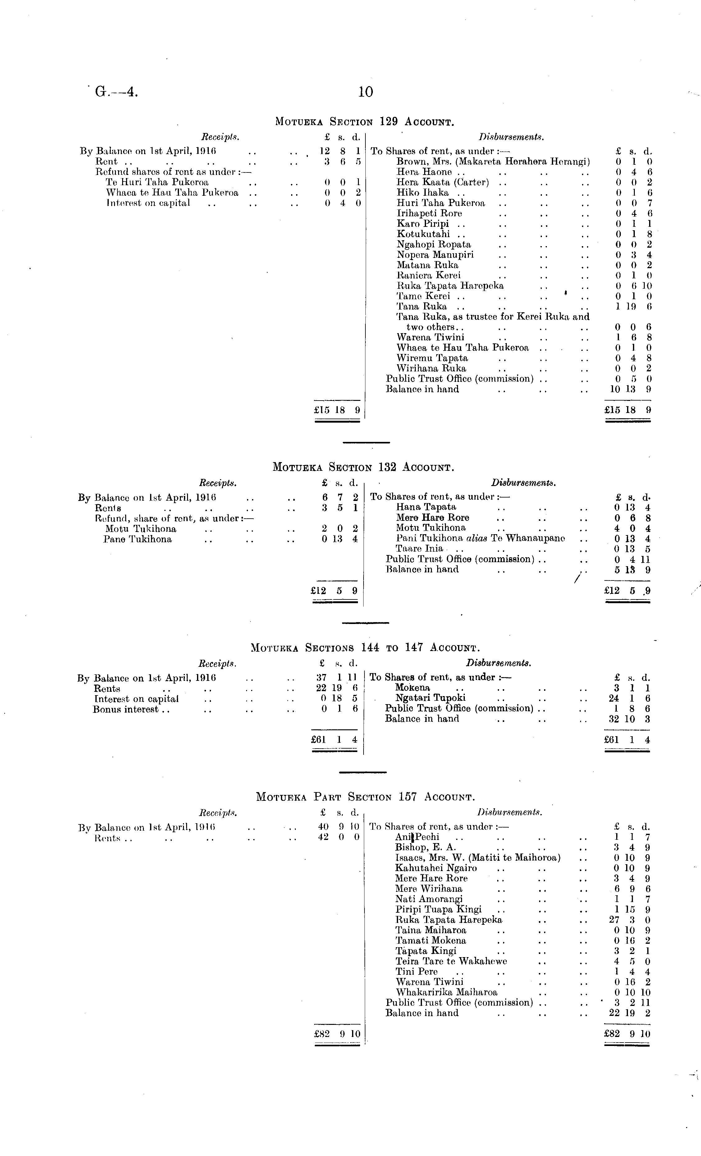 Motueka Section 129 Account. Receipts. £ s. d. Disbursements. By Balance on Ist April, 1916 .. .. _ 12 8 I To Shares of rent, as under: — £ s. d. Rent .. .. .. .. .. 3 6 5 Brown, Mrs. (Makareta Herahera Hcrangi) 0 I 0 Refund shares of rent as under:— Hera Haone .. .. .. .. 0 4 6 To Huri Taha Pukeroa .. .. 0 0 1 Hera Kaata (Carter) .. . . . . 0 0 2 Whaea te Hau Taha Pukeroa .. .. 0 0 2 Hiko Ihaka . . . . .. . . 0 16 Interest on capital .. .. .. 0 4 0 Huri Taha Pukeroa .. .. . . 0 0 7 Irihapeti Rore .. .. . . 0 4 (i Karo Piripi . . .. .. . . Oil Kotukutahi .. . . .. .. 0 18 Ngahopi Ropata .. .. .. 0 0 2 Nopera Mann pi ri .. .. .. 0 3 4 Matana Ruka .. .. .. 0 0 2 Raniera Kerei .. .. . . 0 10 Ruka Tapata Harcpeka . . .. 0 010 Tame Kerei . . . . * ~ 0 10 Tana Ruka .. .. .. .. 1 19 6 Tana Ruka, as trustee for Kerei Ruka and two others.. . . . . .. 0 0 6 Warena Tiwini . . .. . . 16 8 Whaea te Hau Taha Pukeroa 0 10 Wiremu Tapata . . .. . . 0 4 8 Wirihana Ruka .. . . .. 0 0 2 Public Trust Office (commission) . . .. 0 5 0 Balance in hand .. .. .. 10 13 9 £15 18 9 £15 18 9 Motueka Section 132 Account. Receipts. £ s. d. Disbursements. By Balance on Ist April, 1916 .. .. 6 7 2 To Shares of rent, as under: — £ s. eh Rents .. .. .. .. 3 5 1 Hana Tapata .. .. .. 0 13 4 Refund, share of rent, as under: — Mere Hare Rore .. .. .. 0 6 8 Motu Tuldhona .. .. .. 2 0 2 Motu Tukihona .. .. .. 4 0 4 Pane Tukihona .. .', .. 013 4 Pani Tukihona alias Te Whanaupane .. 013 4 Taare Inia . . . . .. .. 0 13 5 Public Trust Office (commission) .. .. 0 4 II Balance in hand .. .. 5 IS 9 £12 5 9 £12 5 .9 Motueka Sections 144 to 147 Account. Receipts. £ s. cl. Disbursements. By Balance on Ist April, 1916 .. .. 37 1 11 To Shares of rent, as under : — £ s. d. Rents .. .. . . 22 19 6 Mcikena .. .. .. .. 3 11 Interest on oapital .. .. ■• 0 18 5 Ngatari Tupoki .. .. .. 24 1 6 Bonus interest .. .. .. .. 0 16 Public Trust Office (commission) .. .. 18 6 Balance in hand .. .. . . 32 10 3 £61 1 4 £61 J 4 Motueka Part Section 157 Account. Receipts. £ s. d. Disbursements. By Balance on Ist April, 19 Hi .. .. 40 9 10 To Shares of rent, as under: — £ s. d. * Rents . . .. .. .. .. 42 0 0 AniiPeehi . . . . . . .. 117 Bishop, E. A. . . . . .. 3 4 9 Isaacs, Mrs. W. (Matiti te Maihoroa) .. 0 10 9 Kahutahei Ngairo .. .. .. 0 10 9 Mere Hare Rore . . .. .. 3 4 9 Mere Wirihana .. .. .. 0 9 6 Nati Amorangi .. .. .. 117 Piripi Tuapa Kingi .. .. .. 1 15 9 Ruka Tapata Harcpeka .. .. 27 3 0 Taina Maiharoa .. .. .. 010 9 Tainati Mokena .. .. .. 0 16 2 Tapata Kingi . . .. .. 3 2 1 Teira Tare te Wakahcwe .. .. 4 5 0 Tini Pero . . .. .. .. 14 4 Warena Tiwini .. .. .. 0 10 2 Whakaririka Maiharoa .. .. 0 10 10 Public Trust Office (commission) .. .. 3 2 11 Balance in hand . . .. .. 22 19 2 £82 9 10 £82 9 10