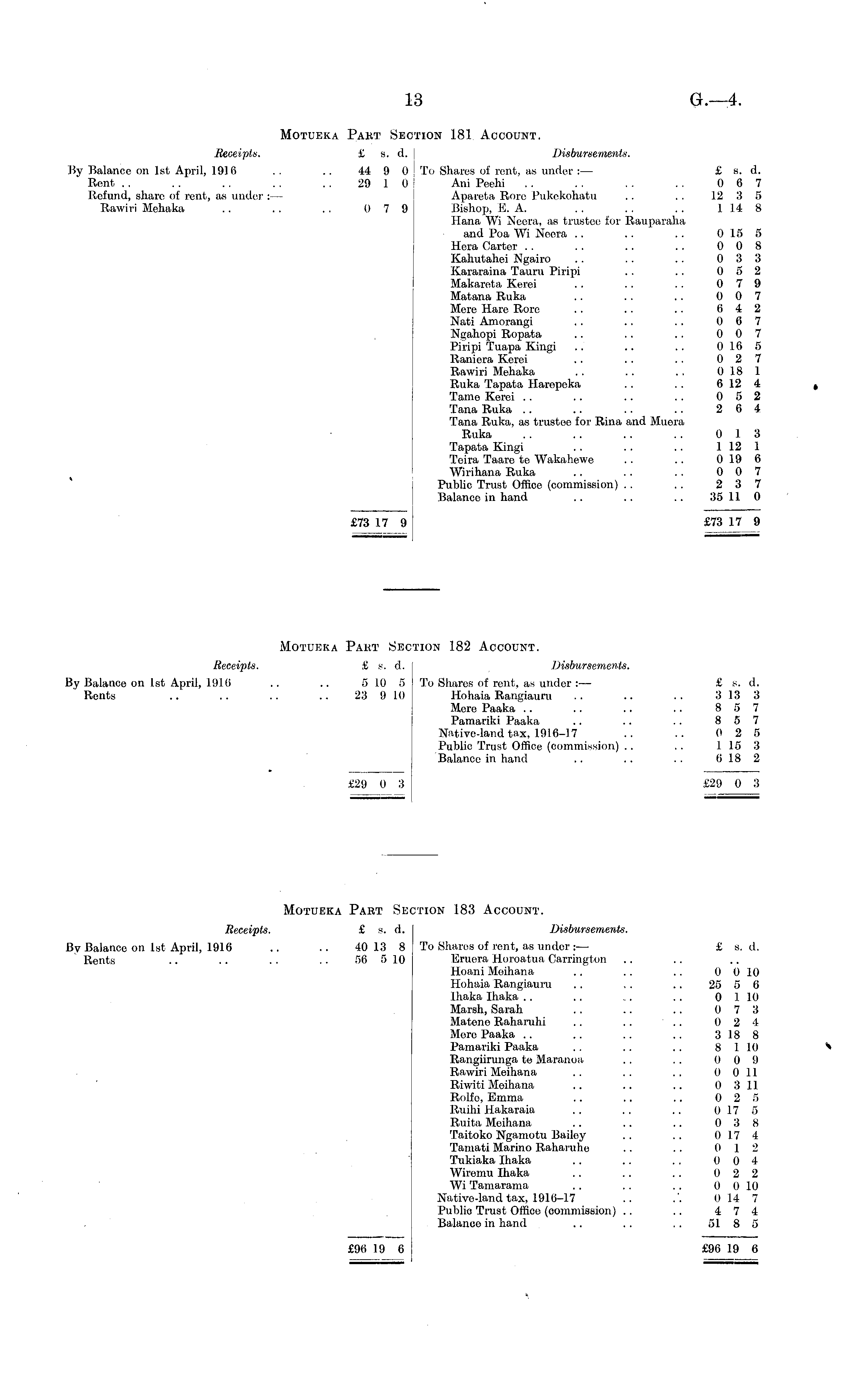 Motueka Part Section 181 Account. Receipts. £ s. d. Disbursements. By Balance on 1st April, 1916 .. .. 44 9 0 To Shares of rent, as under : — £ B. d. Rent .. . . .. . . .. 29 1 0 Ani Peehi .. . . .. . . 0 6 7 Refund, share of rent, as under: — Apareta Rore Pukekohatu .. . . 12 3 5 Rawiri Mehaka .. .. .. 0 7 9 Bishop, E. A. .. . . . . 1 14 8 liana Wi Neora, as trustee for Rauparaha and Poa Wi Neora .. .. .. 0 15 5 Hera Carter . . . . .. . . 0 0 8 Kahutahei Ngairo .. .. .. 0 3 3 Kararaina Tauru Piripi .. .. 0 5 2 Makareta Kerei .. .. .. 0 7 9 Matana Ruka .. . . .. 0 0 7 Mere Hare Rore . . .. .. 6 4 2 Nati Amorangi . . .. . . 0 6 7 Ngahopi Ropata .. .. .. 0 0 7 Piripi Tuapa Kingi .. .. .. 0 16 5 Raniera Kerei .. .. .. 0 2 7 Rawiri Mehaka . . .. .. 0 18 1 Ruka Tapata Harepeka .. . . 6 12 4 Tame Kerei .. .. .. . . 0 5 2 Tana Ruka .. .. .. .. 2 6 4 Tana Ruka, as trustee for Rina and Muora Ruka . . .. .. .. 0 13 Tapata Kingi . . . . .. 1 12 1 Teira Taare te Wakahewe .. .. 0 19 6 Wirihana Ruka .. . . . . 0 0 7 Public Trust Office (commission) . . . . 2 3 7 Balance in hand .. .. .. 35110 £73 17 9 £73 17 9 Motueka Part Section 182 Account. Receipts. £ s. d. Disbursements. By Balance on 1st April, 1916 .. .. 5 10 5 To Shares of rent, as under: — £ s. d. Rents .. .. .. .. 23 9 10 Hohaia Rangiauru .. .. .. 3 13 3 Mere Paaka .. .. .. .. 8 5 7 Pamariki Paaka .. .. .. 8 5 7 Native-land tax, 1916-17 .. .. 0 2 5 Public Trust Office (commission) .. .. 1 15 3 Balance in hand .. .. .. 6 18 2 £29 0 3 £29 0 3 Motueka Part Section 183 Account. Receipts. £ s. d. Disbursements. By Balance on 1st April, 1916 .. .. 40 13 8 To Shares of rent, as under: — £ s. d. Rents .. .. . . .. 56 5 10 Eruera Horoatua Carrington Hoani Meihana .. . . .. 0 0 10 Hohaia Rangiauru .. , . .. 25 5 6 Ihaka Ihaka .. .. .. . . 0 1 10 Marsh, Sarah .. .. .. 0 7 3 Mateno Raharuhi .. .. ' .. 0 2 4 Merc Paaka .. .. .. .. 3 18 8 Pamariki Paaka .. .. . . 8 1 10 Rangiirunga te Maranoa .. .. 0 0 9 Rawiri Meihana .. . . . . 0 0 11 Riwiti Moihana .. .. .. 0 3 11 Rolfo, Emma .. .. .. 0 2 5 Ruihi Hakaraia .. . . .. 0 17 5 Ruita Moihana .. .. .. 0 3 8 Taitoko Ngamotu Bailey .. .. 0 17 4 Tamati Marino Raharuhe .. . . 0 12 Tukiaka Ihaka .. .. .. 0 0 4 Wiremu Ihaka .. .. . . 0 2 2 Wi Tamarama .. .. .. 0 0 10 Nativo-land tax, 1916-17 .. .'. 0 14 7 Public Trust Office (commission) .. .. 4 7 4 Balance in hand .. . . .. 51 8 5 £96 19 6 £96 19 6 i