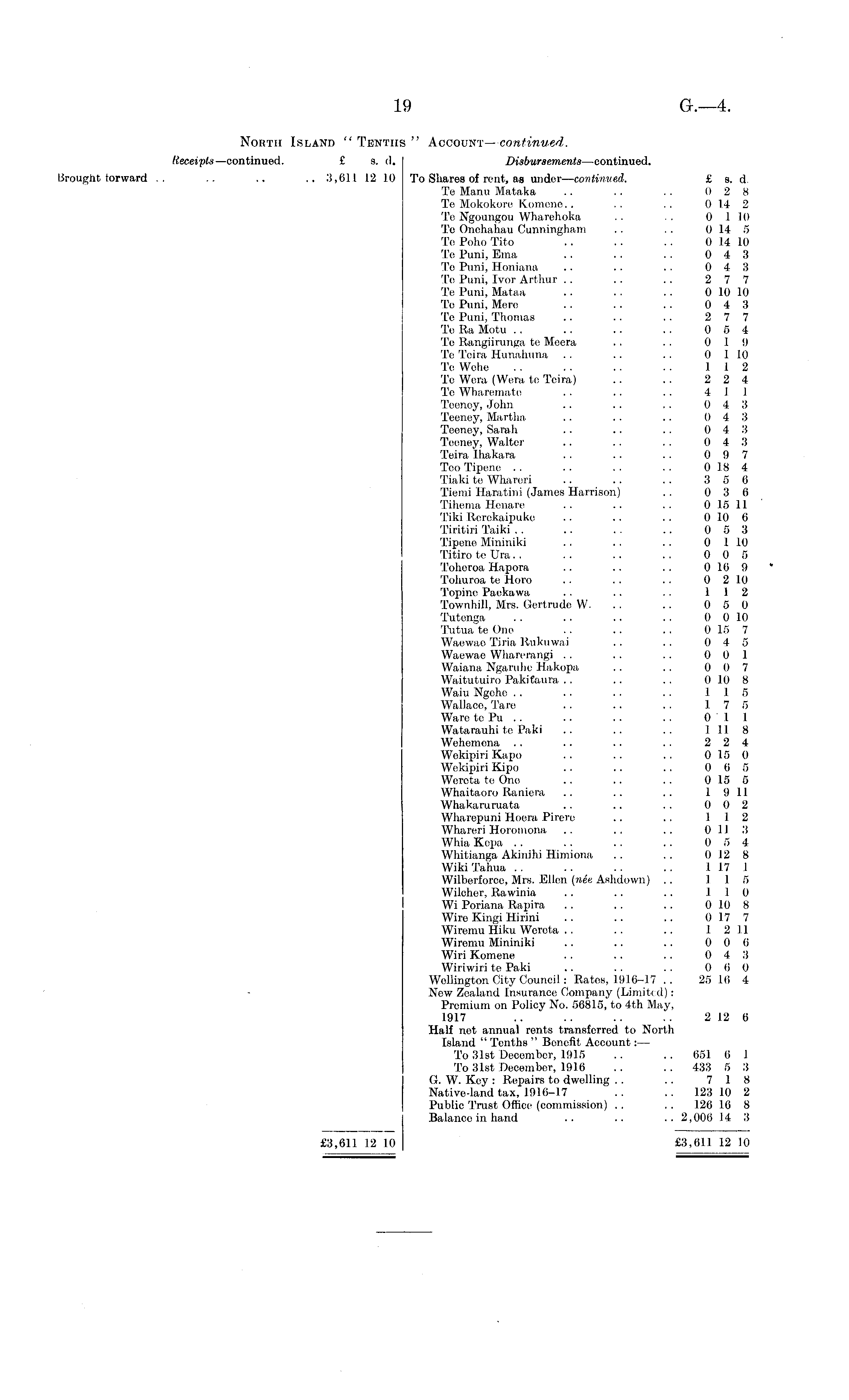 North Island " Tenths " Account— continued. Receipts— continued. £ s. d. Disbursements —continued. Brought forward .. .. .. 3,611 12 10 To Shares of rent, as under — continued. £ s. d, Te Manu Mataka .. .. . . 0 2 8 Te Mokokore Komenc.. .. .. 0 14 2 To Ngoungou Wharehoka . . . . 0 1 10 Tc Onehahau Cunningham .. . . 0 14 5 Te Poho Tito .. . . .. 0 14 10 Te Puni, Etna .. . . . . 0 4 3 Te Puni, Honiana .. .. . . 0 4 3 Te Puni, Ivor Arthur . . . . . . 2 7 7 Te Puni, Mataa .. . . .. 0 10 10 Te Puni, Mere .. .. .. 0 4 3 Te Puni, Thomas .. . . .. 2 7 7 Te Ra Motu . . .. . . .. 0 5 4 Te Rangiirunga te Meera . . . . 0 19 Te Teira Hunahuna .. .. .. 0 1 10 Te Wehe .. .. . . .. 112 Te Wera (Wera te Teira) .. .. 2 2 4 Te Wharematc .. .. . . 4 11 Teenoy, John .. .. . . 0 4 3 Teeney, Martha .. . . .. 0 4 3 Teeney, Sarah .. .. .. 0 4 3 Teeney, Waltor .. .. . . 0 4 3 Teira Ihakara . . .. .. 0 9 7 Too Tipene .. .. .. .. 0184 Tiaki te Wharcri .. .. .. 3 5 6 Tienii Haratini (James Harrison) .. 0 3 6 Tihema Henare .. .. .. 0 15 11 Tiki Rerekaipuke .. . . . . 0 10 6 Tiritiri Taiki . . .. .. .. 0 5 3 Tipene Mininiki . . .. .. 0 1 10 Titiro te Dra. . .. .. . . 0 0 5 Toheroa Hapora .. . . .. 0 16 9 Tohuroa te Horo .. .. .. 0 2 10 Topine Paekawa . . .. . . 112 Townhill, Mrs. Gertrude W. .. . . 0 5 0 Tutenga . . . . .. .. 0 0 10 Tutua te One . . .. .. 0 15 7 Waewao Tiria Ruktiwai .. . . 0 4 5 Waewae Whai'eraiigi . . . . . . 0 0 1 Waiana Ngaruhe Hakopa .. .. 0 0 7 Waitutuiro Paki Can ra . . .. .. 0 10 8 Waiu Ngehe . . . . . . . . 115 Wallace, Tare . . .. . . 17 5 Ware te Pu . . . . . . . . 0 11 Watarauhi te Paki .. . . . . 1118 Wchemena . . . . .. . . 2 2 4 WokipiriKapo .. . . . . 0 15 0 Wekipiri Kipo . . .. . . 0 6 5 Wercta te One .. .. .. 0 15 5 Whaitaoro Raniera .. .. .. 19 11 Whakaruruata .. . . .. 0 0 2 Wharepuni Hocra Pirere .. .. 112 Whareri Horomona . . .. .. 0 11 3 Whia Kcpa . . . . .. .. 0 5 4 Whitianga Akinihi Himiona .. .. 0 12 8 Wiki Tahua .. . . . . .. 117 1 Wilberforcc, Mrs. Ellen (nee Ashdown) . . 115 Wilcher, Rawinia . . .. .. 110 Wi Poriana Rapira . . .. . . 0 10 8 Wire Kingi Hirini . . .. .. 0 17 7 Wiremu Hiku Wereta . . . . .. I 2 11 Wiremu Mininiki .. .. .. 0 0 (i Wiri Komene .. . . .. 0 4 3 Wiiiwiri te Paki .. . . . . 0 6 0 Wellington City Council: Rates, 1916-17 .. 25 16 4 New Zealand Insurance Company (Limiti d): Premium on Policy No. 56815, to 4th May, 1917 .. .. .. .. 2 12 6 Half net annual rents transferred to North Island " Tenths " Benefit Account: — To 31st December, 1915 .. . . 651 6 I To 31st December, 1916 .. .. 433 5 3 G. W. Key : Repairs to dwelling .. .. 7 18 Native-land tax, 1916-17 .. .. 123 10 2 Public Trust Office (commission) . . . . 126 16 8 Balance in hand .. .. .. 2,006 14 3 £3,611 12 10 £3,611 12 10
