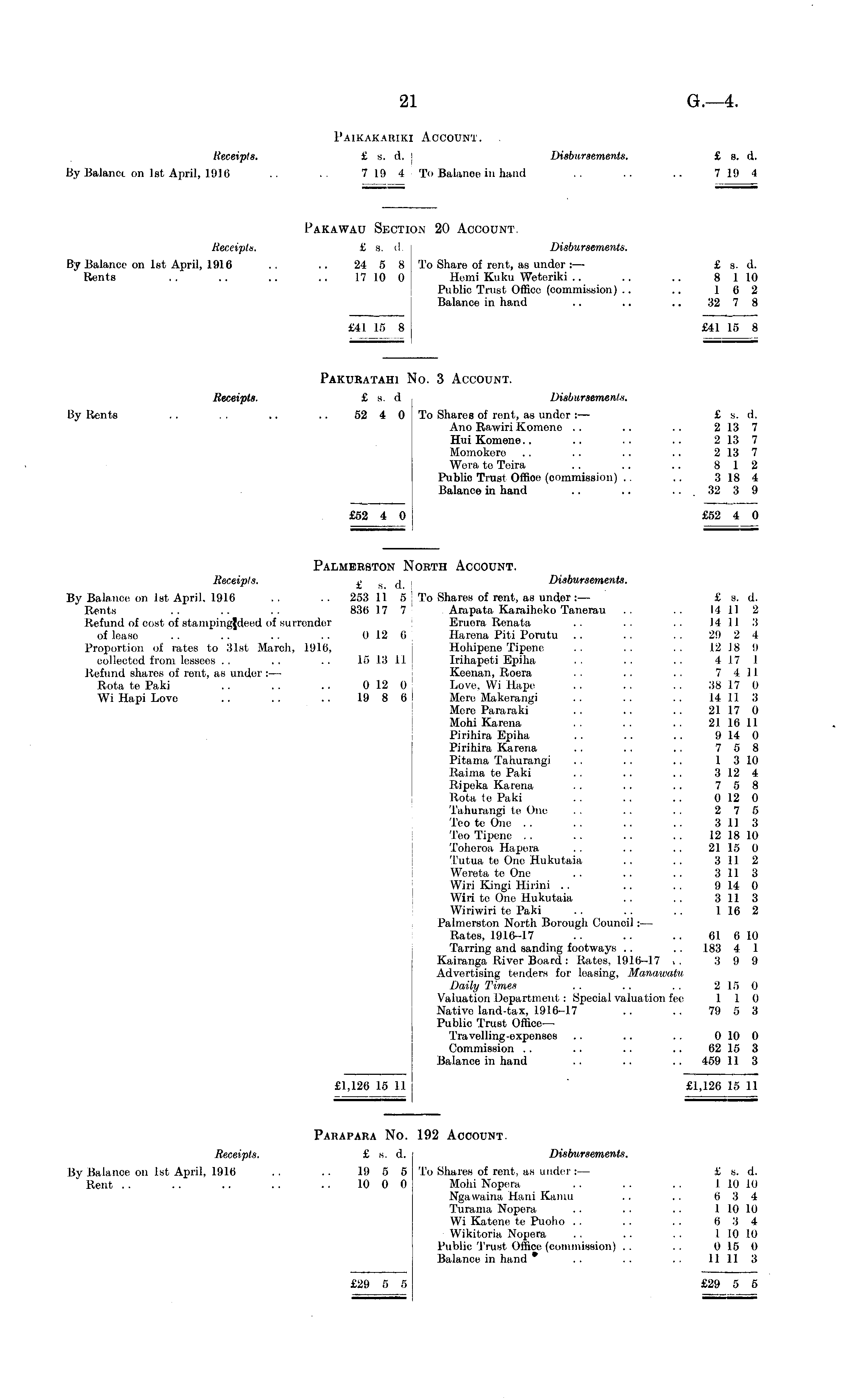 Paikakariki Account. Receipts. £ s. d. Disbursements. £ s. d. By Balance on 1st April, 1916 .. .. 7 19 4 To Balanoe in hand .. .. .. 7 19 4 Pakawau Section 20 Account. Receipts. £ s. d. Disbursements. By Balance on 1st April, 1916 .. .. 24 5 8 To Share of rent, as under: — £ s. d. Rents .. .. .. .. 17 10 0 Hemi Kuku Wcteriki .. .. .. 8 1 10 Public Trust Office (commission) .. .. 16 2 Balance in hand .. .. .. 32 7 8 £41 15 8 £41 15 8 Pakuratahi No. 3 Account. Receipts. £ s. d , Disbursements. By Rents . . . . .. .. 52 4 0 To Shares of rent, as under :— £ s. d, Ano Rawiri Komone .. .. .. 2 13 7 HuiKomene.. .. .. 2 13 7 Momokero .. .. .. .. 2 13 7 Wera te Toira . . .. .. 8 12 Publio Trust Office (commission) .. .. 3 18 4 Balance in hand .. .. ... 32 3 9 £52 4 0 £52 4 0 Palmerston North Account. Receipts. £ s d Disbursements. By Balance on 1st April. 1916 .. .. 253 11 5 To Shares of rent, as under: — £ s. d. Rents .. .. .. 836 17 7 Arapata Karaiheko Tanerau .. .. 14 11 2 Refund of cost of stampingjdeed of surrender Eruera Renata .. .. .. 14 11 3 of lease . . . . . . . . 0 12 6 Harena Piti Porutu .. .. . . 29 2 4 Proportion of rates to 31st March, 1916, Hohipene Tipene . . . . . . 12 18 9 collected from lessees . . . . .. 15 13 11 Irihapeti Epiha . . . . . . 4 17 1 Refund shares of ront, as under: — Keenan, Roera .. .. .. 7 4 11 Rota te Paki .. .. .. 0 12 0 Love. Wi Hape .. .. . . 38 17 0 Wi Hapi Love .. .. .. 19 8 6 More Makerangi .. .. .. 14 11 3 Merc Pararaki . . .. .. 21 17 0 Mohi Karena . . . . . . 21 16 11 Pirihira Epiha .. .. .. 9 14 0 Pirihira Karena . . . . .. 7 5 8 Pitama Tahurangi . . .. .. I 3 10 Raima te Paki . . .. .. 3 12 4 Ripeka Karena . . .. .. 7 5 8 Rota tc Paki . . . . .. 0 12 0 Tahurangi te One .. . . .. 2 7 5 Teo te One .. . . .. .. 3 113 Teo Tipene .. .. .. .. 12 18 10 Toheroa Hapera .. .. .. 21 15 0 Tutua te One Hukutaia .. .. 3 112 Wereta te One , . .. . . 3 11 3 Wiri Kingi Hirini .. .. . . 9 14 0 Wiri te Ono Hukutaia . . .. 3 113 Wiriwiri to Paki .. . . .. 1 16 2 Palmerston North Borough Council: — Rates, 1916-17 .. .. .. 61 6 10 Tarring and sanding footways .. .. 183 4 1 Kairanga River Board : Rates, 1916-17 ■ . 3 9 9 Advertising tenders for leasing, Manawatu Daily Times . . .. . . 2 15 0 Valuation Department: Special valuation fee 110 Native land-tax, 1916-17 .. .. 79 5 3 Public Trust Office— Travelling-expenses .. .. .. 0 10 0 Commission . . .. .. .. 62 15 3 Balance in hand .. .. .. 459 11 3 £1,126 15 11 | £1,126 15 11 I ====-BB Parapara No. 192 Account. Receipts. £ s. d. Disbursements. By Balance on 1st April, 1916 .. .. 19 5 5 To Shares of rent, as under: — £ s. d. Rent .. . . .. .. .. 10 0 0 Mohi Nopera .. .. . . 1 10 10 Ngawaina Hani Kaiitti .. . . 6 3 4 Turama Nopera . . .. . . 1 10 10 Wi Katene te Puoho .. .. .. 6 3 4 Wikitoria Nopera . . .. .. 1 10 10 Public Trust Office (commission) .. .. 0 15 0 Balance in hand * .. .. 11113 £29 5 5 £29 5 5