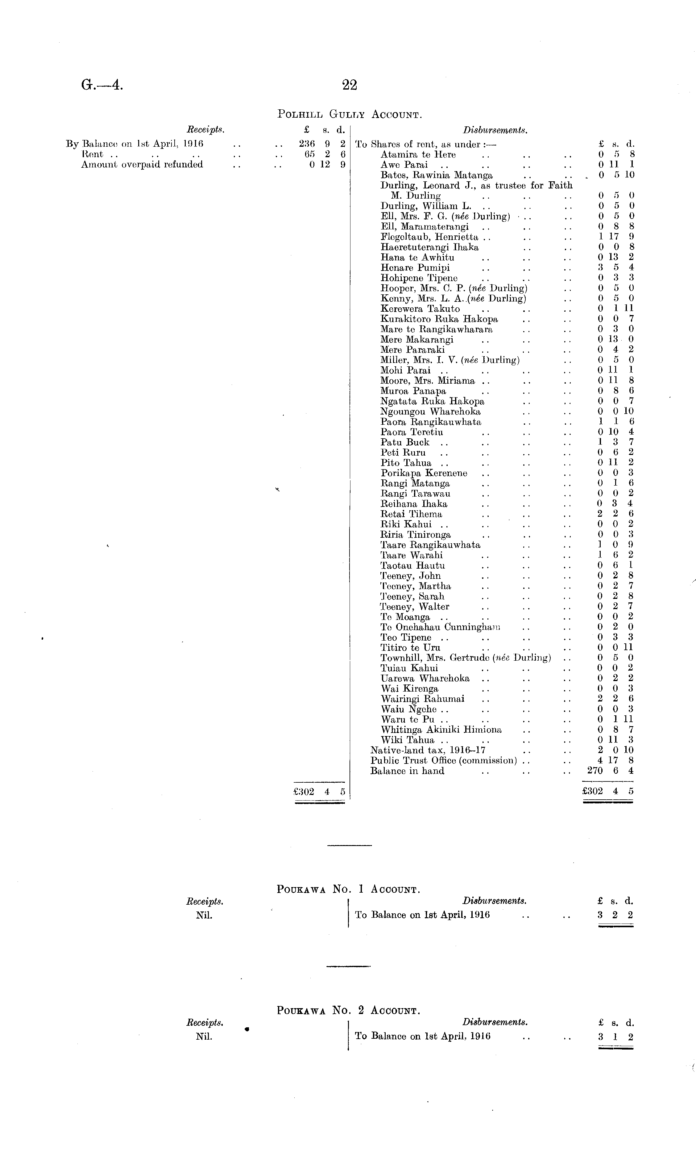 Polhill Gully Account. Receipts. £ s. d. Disbursements. By Balance on 1st April, 1916 .. .. 236 9 2 To Shares of rent, as under: — £ s. d. Rent .. .. . . .. . . 65 2 6 Atamira te Here . . .. .. 0 5 8 Amount overpaid refunded .. .. 0 12 9 Awe Parai .. .. .. .. 0 II I Bates, Rawinia Matanga .. .. . 0 5 10 Durling, Leonard J., as trustee for Faith M. Durling . . . . . . 0 5 0 Durling, William L. .. .. . . 0 5 0 Ell, Mrs. E. G. (nee Durling) • .. . . 0 5 0 Ell, Maramaterangi . . . . . . 0 8 8 Elogcltaub, Henrietta . . .. . . 117 9 Haeretuterangi Ihaka . . . . 0 0 8 Hana te Awhitu .. .. . . 0 13 2 Hcnare Pumipi .. . . . . 3 5 4 Hohipene Tipene . . .. . . 0 3 3 Hoopor, Mrs. C. P. (nee Durling) . . 0 5 0 Kenny, Mrs. L. A..(ne'e Durling) . . 0 5 0 Kcrowera Takuto .. .. . . 0 111 Kurakitoro Ruka Hakopa . . . . 0 0 7 Marc tc Rangikawharara . . . . 0 3 0 Mere Makarangi .. . . . . 0 13 0 Mere Pararaki .. . . . . 0 4 2 Miller, Mrs. I. V. (nee Durling) .. 0 5 0 Mohi Parai .... .. .. 0 11 1 Moore, Mrs. Miriama . . .. . . 0 118 Muroa Panapa .. .. . ■ 0 8 6 Ngatata Ruka Hakopa . . . . 0 0 7 Ngoungou Wharehoka . . .. 0 0 10 Paora Rangikauwhata .. .. 116 Paora Tcretiu . . .. .. 0 10 4 Patu Buck .. . . .. .. 13 7 Peti Ruru . . . . .. . . 0 6 2 Pito Tahua .. .. . . . . 0 11 2 Porikapa Kerenene .. .. . . 0 0 3 Rangi Matanga .. . . . . 0 16 Rangi Tarawau . . . . . . 0 0 2 Reihana Ihaka . . . . . . 0 3 4 Retai Tihema .. .. . . 2 2 6 Riki Kahui . . . . . . . . 0 0 2 Riria Tinironga . . .. .. 0 0 3 - Taare Rangikauwhata . . . . 10 9 Taare Warahi . . . . .. 16 2 Taotau Hautu .. . . . . 0 6 1 Teeney, John . . .. . . 0 2 8 Teeney, Martha . . .. .. 0 2 7 Teeney, Sarah .. . . . . 0 2 8 Teeney, Walter . . . . .. 0 2 7 To Moanga .. . . .. .. 0 0 2 To Onehahau Cunningham .. . . 0 2 0 Teo Tipene . . .. . . .. 0 3 3 Titiro te Uru . . . . .. 0 0 11 Townhill, Mrs. Gertrude (nee Durling) . . 0 5 0 Tuiau Kahui . . .. . . 0 0 2 Uarewa Wharehoka .. .. . . 0 2 2 Wai Kirenga .. . . . . 0 0 3 Wairingi Rahumai .. . . .. 2 2 6 Waiu Ngche .. .. .. .. 0 0 3 Waru to Pu .. .. .. .. 0 111 Whitinga Akiuiki Himiona .. . . 0 8 7 Wiki Tahua .. .. .. .. 0 11 3 Native-land tax, 1916-17 .. . . 2 0 10 Public Trust Office (commission) . . . . 4 17 8 Balance in hand .. . . .. 270 6 4 £302 4 5 £302 4 5 Poukawa No. 1 Account. Receipts. Disbursements. £ s. d. Nil. To Balance on 1st April, 1916 .. .. 3 2 2 Poukawa No. 2 Account. Receipts. Disbursements. £ s. d. Nil. To Balance on 1st April, 1916 .. .. 3 12