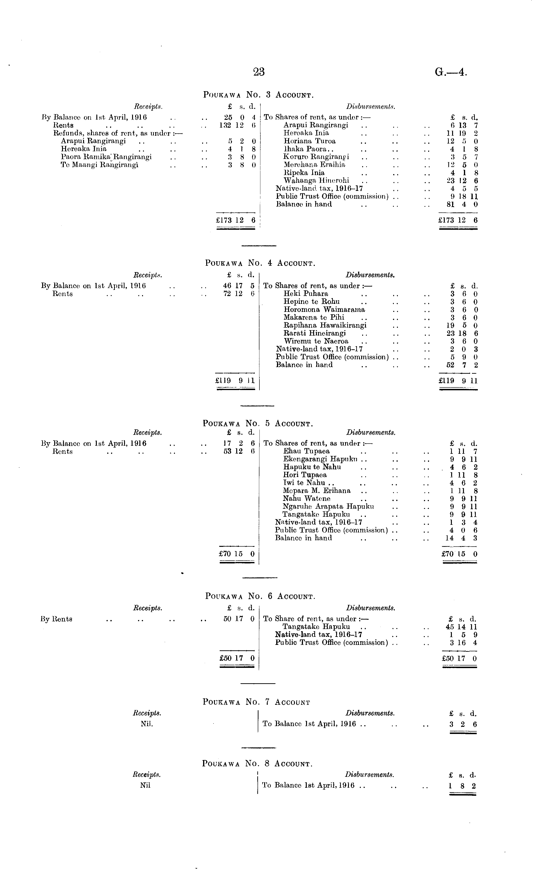 Poukawa No. 3 Account. Receipts. £ s. d. Disbursements. By Balance on 1st April, 1916 .. .. 25 0 4 To Shares of rent, as under: — £ s. d. Rents .. .. .. .. 132 12 6 Arapui Rangirangi .. .. .. 6 13 7 Refunds, shares of rent, as under: —■ Heroaka Inia . . . . .. 1119 2 Arapui Rangirangi .. .. . . 5 2 0 Horiana Turoa .. .. .. 12 5 0 Horeaka Inia .. .. .. 4 18 Ihaka Paora.. .. .. .. 4 18 Paora Ramika; Rangirangi .. .. 3 8 0 Koruro Rangirangi .. .. .. 3 5 7 To Maangi Rangirangi .. .. 3 8 0 Merehana Eraihia .. .. .. 12 5 0 Ripoka Inia .. .. .. 4 18 Wahanga Hinerohi .. .. .. 23 12 6 Native-land tax, 1916-17 .. .. 4 5 5 Public Trust Office (commission) . . .. 9 18 11 Balance in hand . . . . . . 81 4 0 £173 12 6 £173 12 6 Poukawa No. 4 Account. Receipts. £ s. d. Disbursements. By Balance on 1st April, 1916 .. .. 46 17 5 To Shares of rent, as under : — £ s. d. Rents . . .. . . , . 72 12 (i Held Puhara .. .. .. 3 6 0 Hepino te Rohu .. .. .. 3 6 0 Horomona Waimarama .. .. 3 6 0 Makarcna te Pihi .. .. .. 3 6 0 Rapihana Hawaikirangi .. .. 1.9 5 0 Rarati Hineirangi .. .. .. 23 18 6 Wiremu tc Naeroa .. .. .. 3 6 0 Native-land tax, 1916-17 .. .. 2 0 3 Public Trust Office (commission) .. .. 5 9 0 Balance in hand .. .. .. 52 7 2 £119 9 II £119 9 II Poukawa No. 5 Account. Receipts. £ s. d. I Disbursements. By Balance on 1st April, 1916 .. .. 17 2 6 To Shares of rent, as under: — £ s. d. Rents .. .. .. .. 53 12 (i Ehau Tupaea .. .. .. 1 11 7 Ekengarangi Haptiku .. .. .. 9 9 11 Hapuku te Nahu .. .. .. .462 Hori Tupaea . . .. . . 1118 Iwi te Nahu .. .. .. . . 4 6 2 Mcpara M. Erihana .. . . . . 1118 Nahu Watene .. .. .. 9 9 11 Ngaruhe Arapata Hapuku .. .. 9 9 11 Tangatake Hapuku .. .. .. 9 9 11 Native-land tax, 1916-17 .. .. 13 4 Public Trust Office (commission) .. .. 4 0 6 Balanco in hand .. .. .. 14 4 3 £70 15 0 £70 15 0 Poukawa No. 6 Account. Receipts. £ s. d. Disbursements. By Rents .. .. .. .. 50 17 0 To Share of rent, as under:— £ s. d. Tangatake Hapuku .. .. .. 45 14 11 Native-land tax, 1916-17 .. .. 15 9 Public Trust Office (commission) .. .. 3 16 4 £50 17 0 £50 17 0 Poukawa No. 7 Account Receipts. Disbursements. £ s. d. Nil. To Balanco 1st April, 1916 .. . . .. 3 2 6 Poukawa No. 8 Account. Receipts. Disbursements. £ g, d. Nil To Balanco 1st April, 1916 .. .. .. 18 2