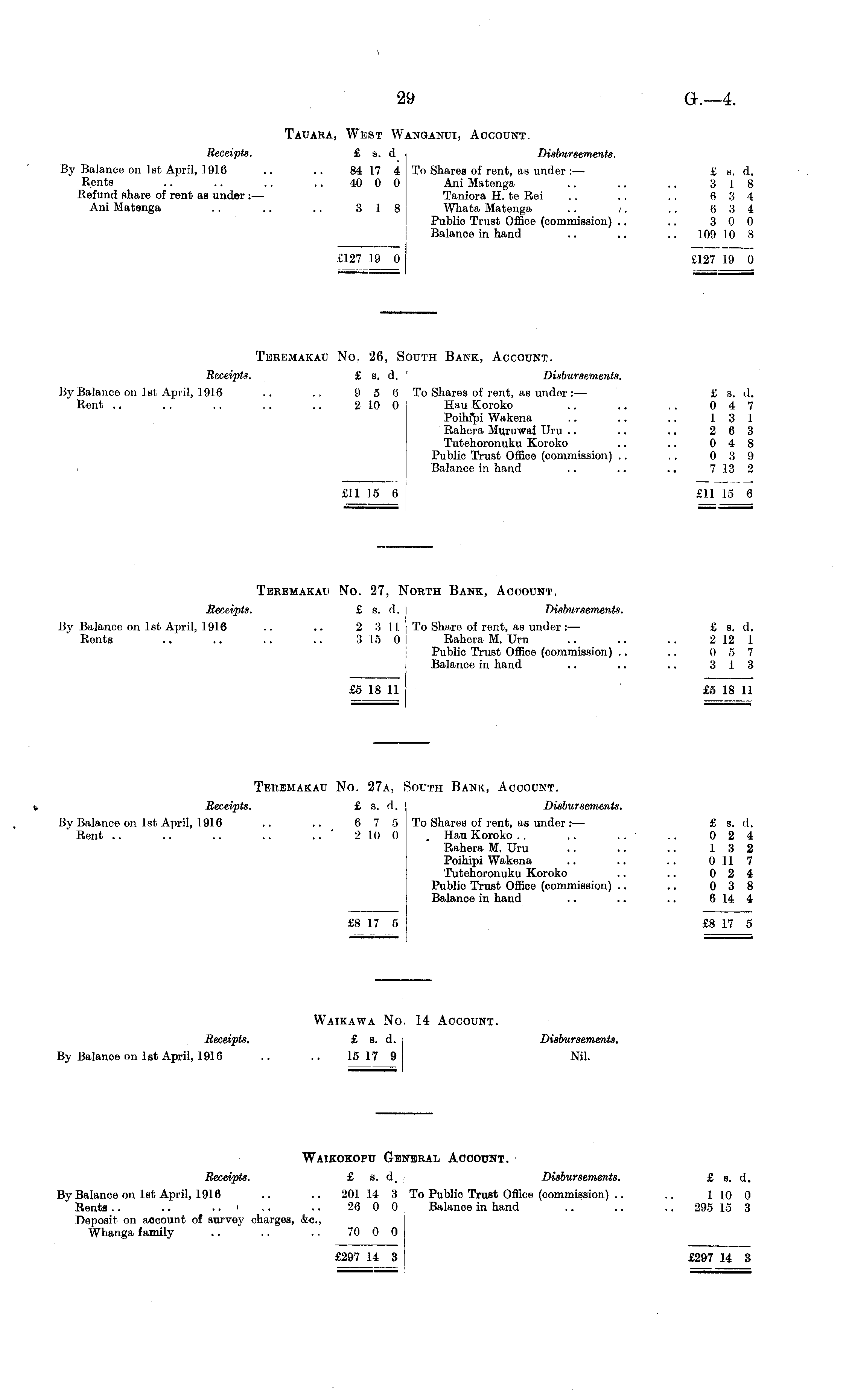 Tauara, West Wanganui, Account. Receipts. £ s. d Disbursements. By Balance on 1st April, 1916 .. .. 84 17 4 To Shares of rent, as under: — £ s. d. Rents .. .. .. .. 40 0 0 Ani Matenga .. .. .. 3 18 Refund share of rent ag under: — Taniora H. te Rei .. .. .. 6 3 4 Ani Matenga .. .. .. 3 18 Whata Matenga .. /. .. 6 3 4 Public Trust Office (commission) .. .. 3 0 0 Balance in hand .. .. .. 109 10 8 £127 19 0 £127 19 0 Teremakau No. 26, South Bank, Account. Receipts. £ s. d. Disbursements. By Balanco on 1st April, 1916 .. .. 9 5 6 To Shares of rent, as under: — £ s. d. Rent .. .. .. .. .. 2 10 0 Hau Koroko .. .. .. 0 4 7 Poihfpi Wakena .. .. .. 13 1 Rahera Muruwai Uru .. .. .. 2 6 3 Tutehoronuku Koroko .. .. 0 4 8 Public Trust Offico (commission) .. .. 0 3 9 Balance in hand .. .. .. 7 13 2 £11 15 6 j £11 15 6 Teremakau No. 27, North Bank, Account. Receipts. £ s. d. Disbursements. By Balanoe on 1st April, 1916 .. .. 2 3 1 I To Share of rent, as under: — £ s. d. Rents .. .. .. .. 3 15 0 Rahera M. Uru .. .. .. 2 12 I Public Trust Offico (commission) .. .. 0 5 7 Balanco in hand .. .. .. 3 13 £5 18 11 £5 18 11 Teremakau No. 27a, South Bank, Account. • Receipts. £ s. d. Disbursements. By Balance on 1st April, 1916 .. .. 6 7 5 To Shares of rent, as under: — £ s. d. Rent .. .. .. .. .. ' 2 10 0 . Hau Koroko .. .. .. .. 024 Rahera M. Uru .. .. .. 13 2 Poihipi Wakena .. .. .. 0 11 7 Tutehoronuku Koroko .. .. 0 2 4 Public Trust Office (commission) .. .. 0 3 8 Balance in hand .. .. .. 6 14 4 £8 17 5 £8 17 5 Waikawa No. 14 Account. Receipts. £ s. d. Disbursements. By Balanoe on 1st April, 1916 .. .. 15 17 9 Nil. Waikokopu General Account. Receipts. £ g. d. Disbursements. £ g. d. By Balance on 1st April, 1916 .. .. 201 14 3 To Public Trust Office (commission) .. .. 1 10 0 Rents.. .. .. i .. .. 26 0 0 Balance in hand .. .. .. 295 15 3 Deposit on aocount of survey charges, &c, Whanga family .. .. .. 70 0 0 £297 14 3 £297 14 3
