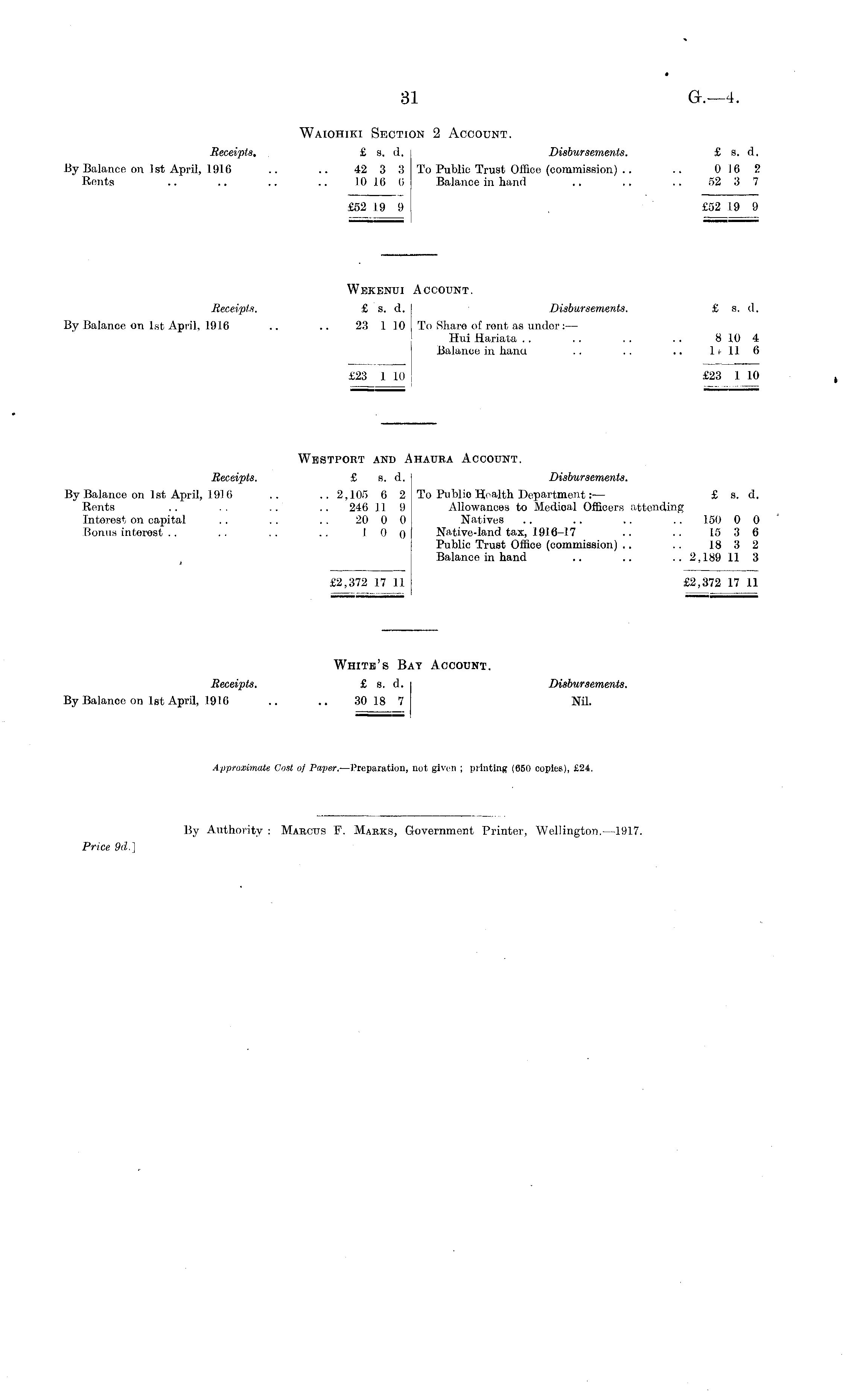 Waiohiki Section 2 Account. Receipts. £ s. d. Disbursements. £ s. d. By Balance on Ist April, 1916 .. .. 42 3 3 To Public Trust Office (commission) .. .. 0 16 2 Rents .. .. .. .. 10 16 6 Balance in hand .. .. .. 52 3 7 £52 19 9 £52 19 9 Wekenui Account. Receipts. £ 's. d. Disbursements. £ s. d. By Balance on Ist April, 1916 .. .. 23 1 10 To Share of rent as undor: — Hui Hariata . . .. . . .. 8 10 4 Balance in hand .. .. .. 11 11 6 £23 1 10 £23 1 10 Westport and Ahaura Account. Receipts. £ s. d. Disbursements. By Balance on Ist April, 1910 .. .. 2,105 6 2 To Publio Health Department:— £ s. d. Rents .. . . .. .. 246 11 9 Allowances to Medical Officers attending Interest on capital .. .. .. 20 0 0 Natives .. .. .. .. 150 0 0 Bonus interest .. .. .. .. 1 0 o Native-land tax, 1916-17 .. .. 15 3 6 Publio Trust Office (commission) .. .. 18 3 2 Balance in hand .. .. .. 2,189 II 3 £2,372 17 11 £2,372 17 11 White's Bat Account. Receipts. £ s. d. Disbursements. By Balance on Ist April, 1916 .. .. 30 1.8 7 Nil.