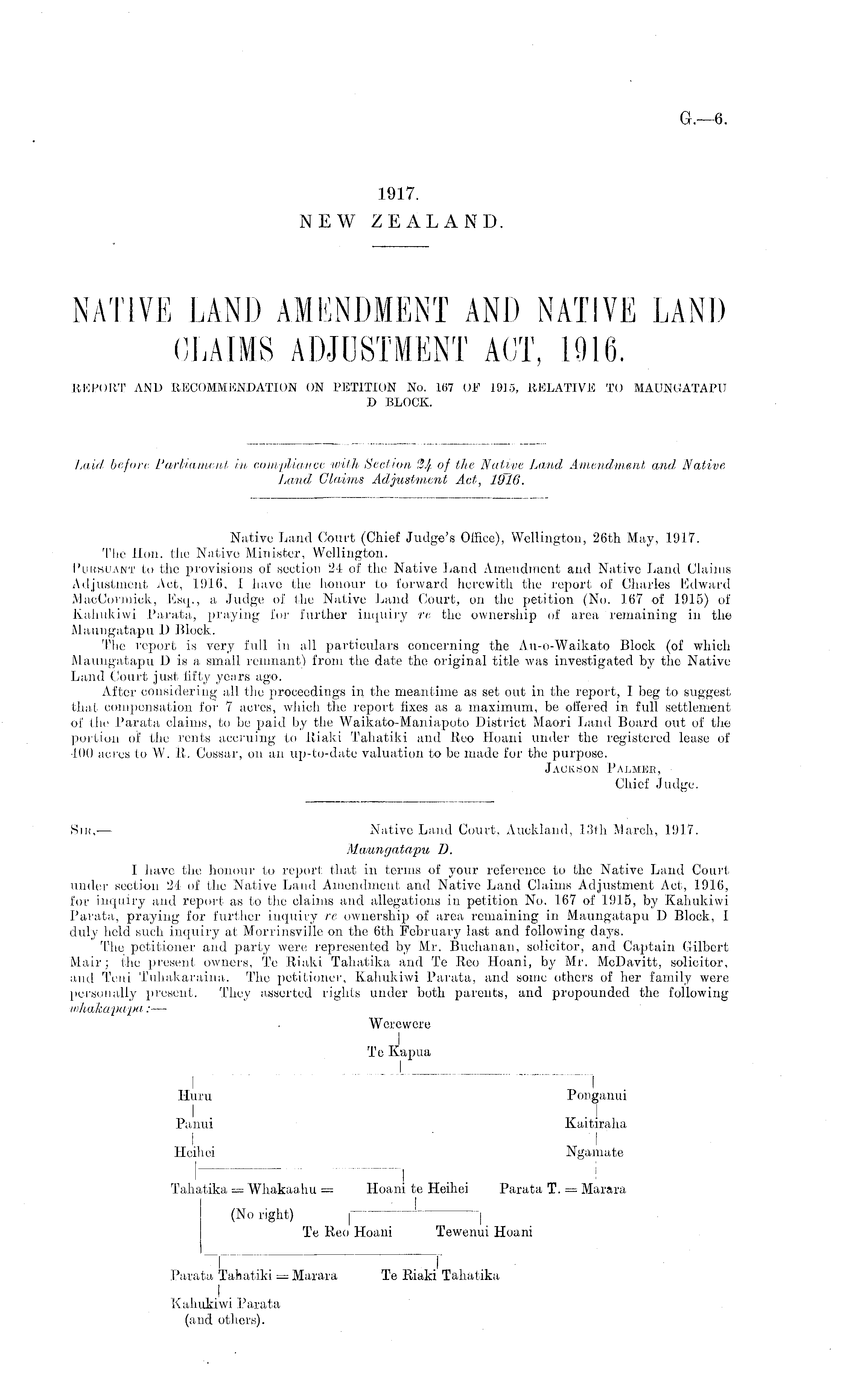 Sir, — Native Land Court, Auckland, 13th March, 1917. Maungatapu D. I have the honour to report that in terms of your reference to the Native Land Court under section 24- of the Native Land Amendment and Native Land Claims Adjustment Act, 1916, for inquiry and report as to the claims and allegations in petition No. 167 of 1915, by Kahukiwi Parata, praying for further inquiry re ownership of area remaining in Maungatapu D Block, I duly held such inquiry at Morrinsville on the 6th February last and following days. The petitioner and party were represented by Mr. Buchanan, solicitor, and Captain Gilbert Mairj the present owners, To Riaki Tahatika and Te Reo Hoani, by Mr. McDavitt, solicitor, and Teni Tuhakaraina. The petitioner, Kahukiwi Parata, and some others of her family were personally present. They asserted rights under both parents, and propounded the following whakapapa: — Wcrewere I Te Kapua ! , r i Huru Ponganui I . ! Panui Kaitiraha I 'I Heihei Ngamate I —! . . I Tahatika = Whakaahu = Hoani te Heihei Parata T. = Marara (No right) — —| _ Te Reo Hoani Tewenui Hoani _ Parata Tahatiki = Marara Te Riaki Tahatika Kahukiwi Parata (and others).