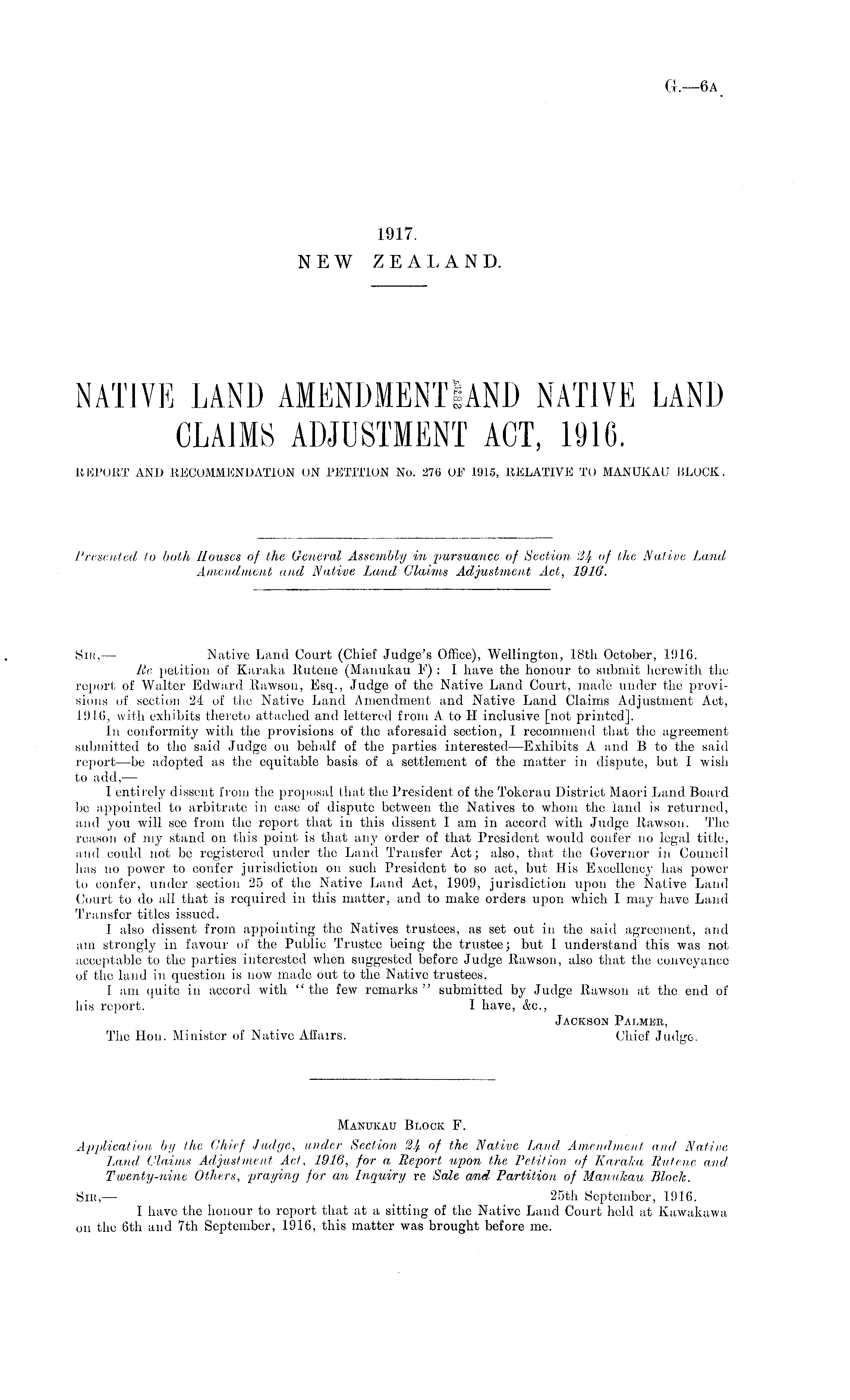 NATIVE LAND AMENDMENT AND NATIVE LAND CLAIMS ADJUSTMENT ACT, 1916. REPORT AND RECOMMENDATION ON PETITION No. 276 OF 1915, RELATIVE TO MANUKAU BLOCK.