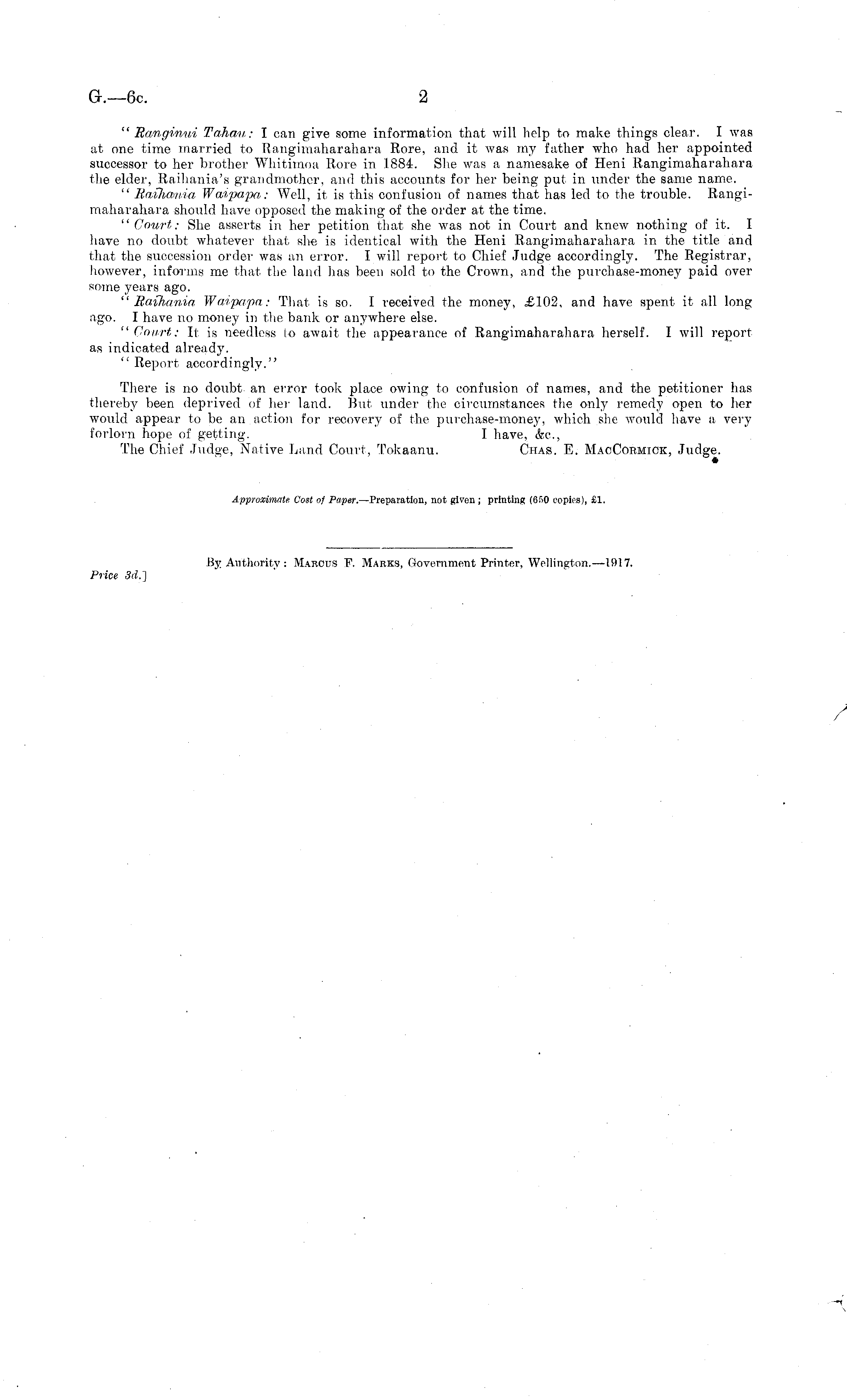 " Ranginui Tahau: I can give some information that will help to make things clear. I was at one time married to Rangimaharahara Rore, and it was my father who had her appointed successor to her brother Whitimoa Rore in 1884. She was a namesake of Heni Rangimaharahara the elder, Raihania's grandmother, and this accounts for her being put in under the same name. " Raihania Waipapa,: Well, it is (his confusion of names that has led to the trouble. Rangimaharahara should have opposed the making of the order at the time. "Court: She asserts in her petition that she was not in Court and knew nothing of it. I have no doubt whatever that she is identical with the Heni Rangimaharahara in the title and that the succession order was an error. T will report to Chief Judge accordingly. The Registrar, however, informs me thai the land has been sold to the Crown, and the purchase-money paid over some years ago. "Raihania Waipapa: That is so. I received the money, £102, and have spent it all long ago. I have no money in the bank or anywhere else. "Court: It is needless lo await the appearance of Rangimaharahara herself. I will report as indicated already. " Report accordingly." There is no doubt an error took place owing to confusion of names, and the petitioner has thereby been deprived of her land. But under the circumstances the only remedy open to her would appear to be an action for recovery of the purchase-money, which, she would have a very forlorn hope of getting. I have, he, The Chief Judge, Native Land Court, Tokaanu. Chas. E. MacCormiok, Judge.