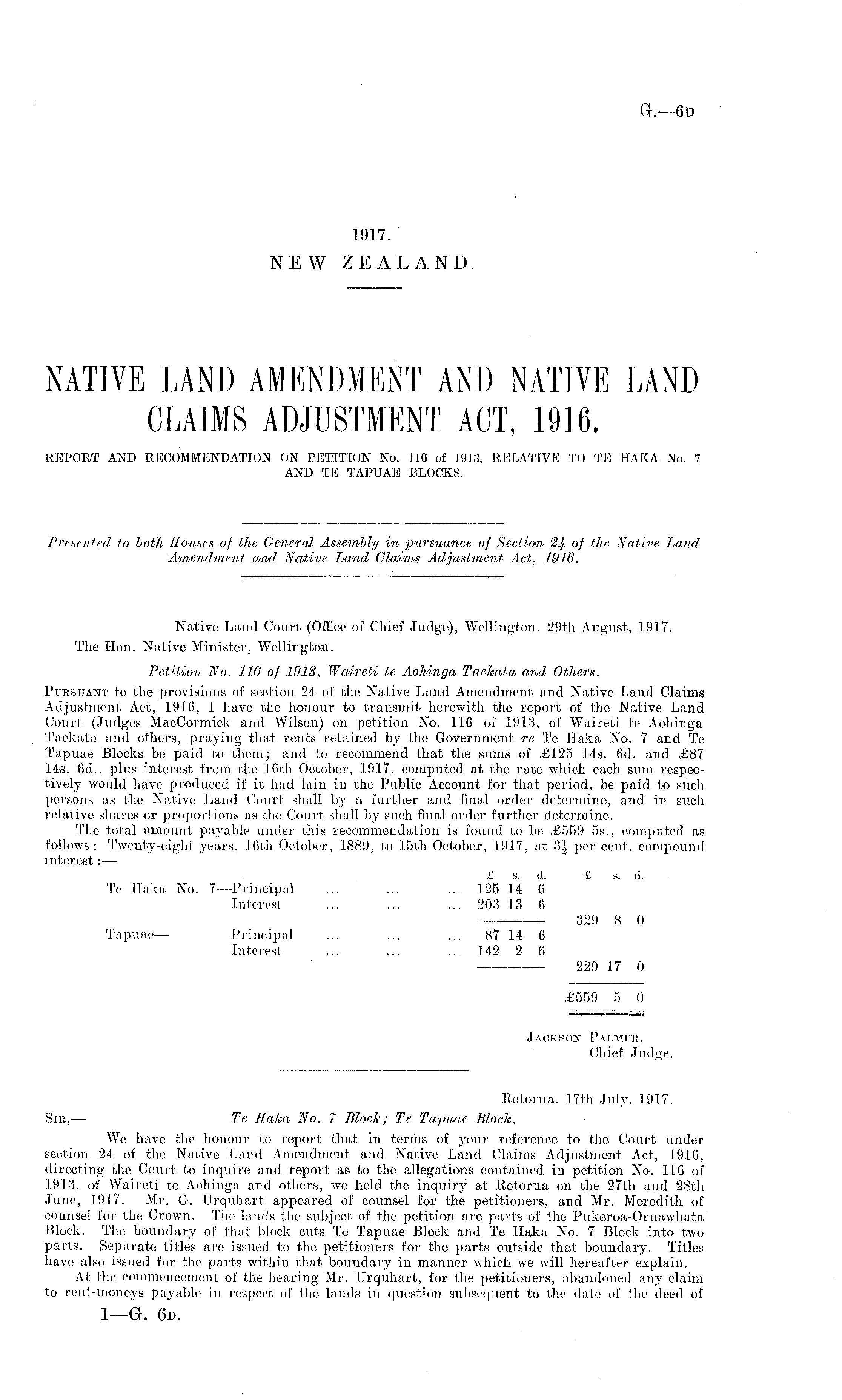 NATIVE LAND AMENDMENT AND NATIVE LAND CLAIMS ADJUSTMENT ACT, 1916. REPORT AND RECOMMENDATION ON PETITION No. 116 of 1913, RELATIVE TO TE HAKA No. 7 AND TE TAPUAE BLOCKS.
