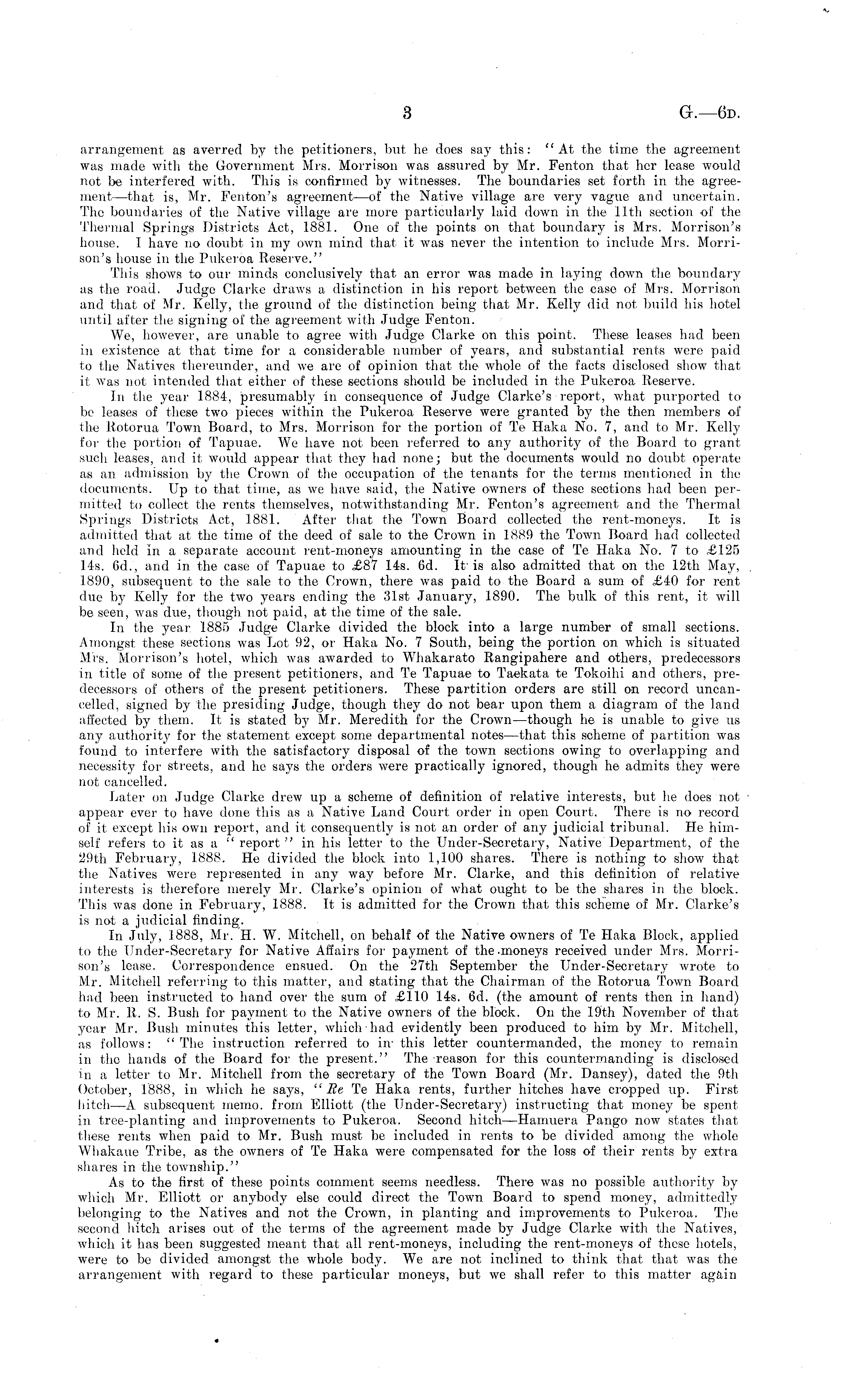 arrangement as averred by the petitioners, but he does say this: "At the time the agreement was made with the Government Mrs. Morrison was assured by Mr. Fenton that her lease would not be interfered with. This is confirmed by witnesses. The boundaries set forth in the agreement —that is, Mr. Fenton's agreement —of the Native village are very vague and uncertain. The boundaries of the Native village are more particularly laid down in the 11th section of the Thermal Springs Districts Act, 1881. One of the points on that boundary is Mrs. Morrison's house. I have no doubt in my own mind that it was never the intention to include Mrs. Morrison's house in the Pukeroa Reserve." This shows to our minds conclusively that an error was made in laying down the boundary as the road. Judge Clarke draws a distinction in his report between the case of Mrs. Morrison and that of Mr. Kelly, the ground of the distinction being that Mr. Kelly did not build his hotel until after the signing of the agreement with Judge Fenton. We, however, are unable to agree with Judge Clarke on this point. These leases had been in existence at that time for a considerable number of years, and substantial rents were paid to the Natives thereunder, and we are of opinion that the whole of the facts disclosed show that it was not intended that either of these sections should be included in the Pukeroa Reserve. In the year 1884, presumably in consequence of Judge Clarke's report, what purported to be leases of these two pieces within the Pukeroa Reserve were granted by the then members of the Rotorua Town Board, to Mrs. Morrison for the portion of To Haka No. 7, and to Mr. Kelly for the portion of Tapuae. We have not been referred to any authority of the Board to grant such leases, and it would appear that they had none; but the documents would no doubt operate as an admission by the Crown of the occupation of the tenants for the terms mentioned in the documents. Up to that time, as we have said, the Native owners of these sections had been permitted to collect the rents themselves, notwithstanding Mr. Fenton's agreement and the Thermal Spring's Districts Act, 1881. After that the Town Board collected the rent-moneys. It is admitted that at the time of the deed of sale to the Crown in 1889 the Town Board had collected and held in a separate account rent-moneys amounting in the case of Te Haka No. 7 to £125 14s. 6d., and in the case of Tapuae to £87 14s. 6d. It is also admitted that on the 12th May, 1890, subsequent to the sale to the Crown, there was paid to the Board a sum of £40 for rent due by Kelly for the two years ending the 31st January, 1890. The bulk of this rent, it will be seen, was due, though not paid, at the time of the sale. In the year. 1885 Judge Clarke divided the block into a large number of small sections. Amongst these sections was Lot 92, or Haka No. 7 South, being the portion on which is situated Mrs. Morrison's hotel, which was awarded to Whakarato Rangipahere and others, predecessors in title of some of the present petitioners, and Te Tapuae to Taekata te Tokoihi and others, predecessors of others of the present petitioners. These partition orders are still on record uncancelled, signed by the presiding Judge, though they do not bear upon them a diagram of the land affected by them. It is stated by Mr. Meredith for the Crown—though he is unable to give us any authority for the statement except some departmental notes—that this scheme of partition was found to interfere with the satisfactory disposal of the town sections owing to overlapping and necessity for streets, and he says the orders were practically ignored, though he admits they were not cancelled. Later on Judge Clarke drew up a scheme of definition of relative interests, but he does not appear ever to have done this as a Native Land Court order in open Court. There is no record of it except his own report, and it consequently is not an order of any judicial tribunal. He himself refers to it as a "report" in his letter to the Under-Secretary, Native Department, of the 29th February, 1888. He divided the block into 1,100 shares. There is nothing to show that the Natives were represented in any way before Mr. Clarke, and this definition of relative interests is therefore merely Mr. Clarke's opinion of what ought to be the shares in the block. This was done in February, 1888. It is admitted for the Crown that this scheme of Mr. Clarke's is not a judicial finding. In July, 1888, Mr. H. W. Mitchell, on behalf of the Native owners of Te Haka Block, applied to the Under-Secretary for Native Affairs for payment of the .moneys received under Mrs. Morrison's lease. Correspondence ensued. On the 27th September the Under-Secretary wrote to Mr. Mitchell referring to this matter, and stating that the Chairman of the Rotorua Town Board had been instructed to hand over the sum of £110 14s. 6d. (the amount of rents then in hand) to Mr. R. S. Bush for payment to the Native owners of the block. On the 19th November of that year Mr. Bush minutes this letter, which had evidently been produced to him by Mr. Mitchell, as follows: "The instruction referred to in this letter countermanded, the money to remain in the hands of the Board for the present." The reason for this countermanding is disclosed in a letter to Mr. Mitchell from the secretary of the Town Board (Mr. Dansey), dated the 9th October, 1888, in which he says, "Re Te Haka rents, further hitches have cropped up. First hitch—A subsequent memo, from Elliott (the Under-Secretary) instructing that money be spent in tree-planting and improvements to Pukeroa. Second hitch—Hamuera Pango now states that these rents when paid to Mr. Bush must be included in rents to be divided among the whole Whakaue Tribe, as the owners of Te Haka were compensated for the loss of their rents by extra shares in the township." As to the first of these points comment seems needless. There was no possible authority by wh