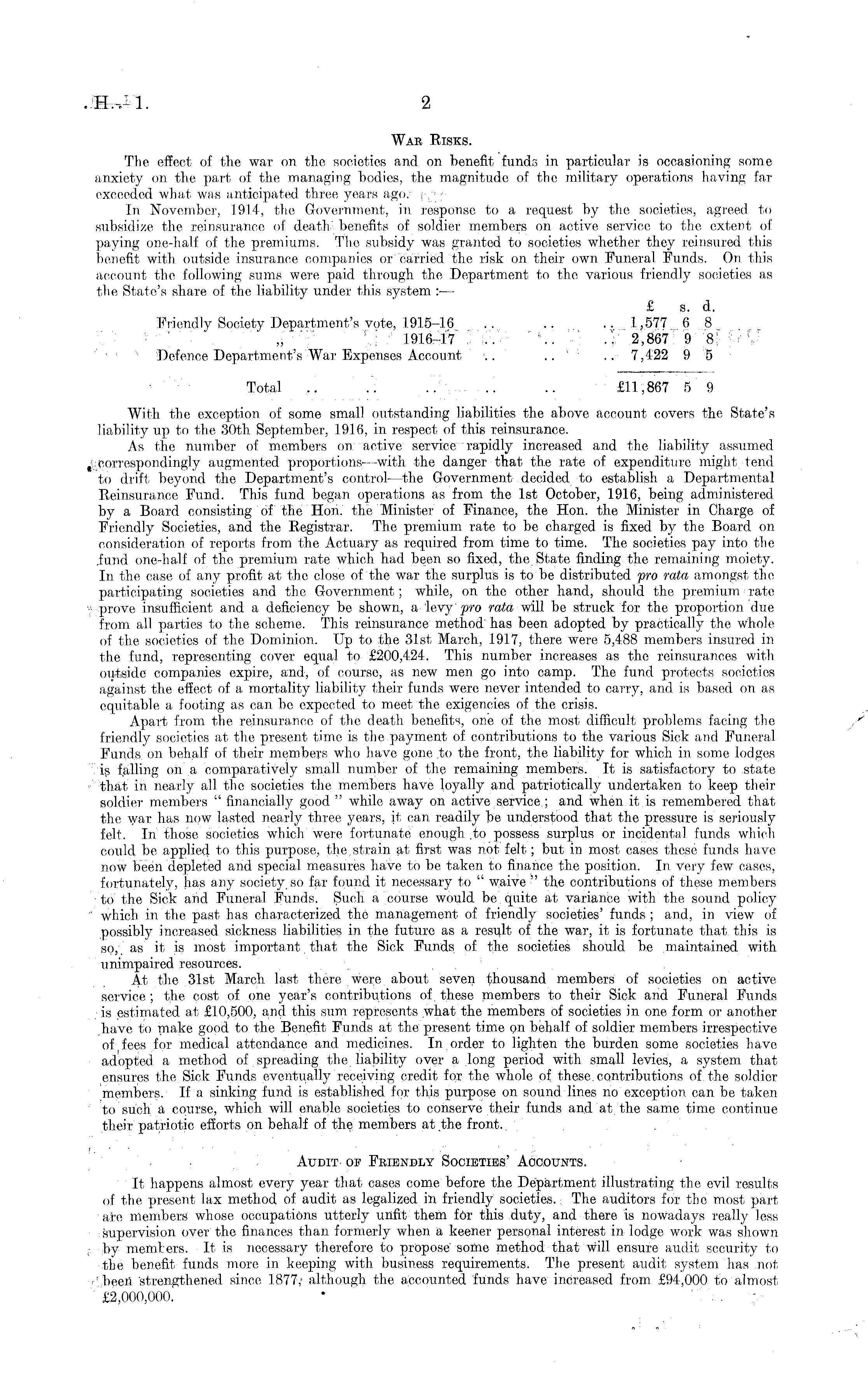 War Risks. The effect of the war on the societies and on benefit funds in particular is occasioning some anxiety on the part of the managing bodies, the magnitude of the military operations having far exceeded what was anticipated three years ago. j , In November, 1914, the Government, in response to a request by the societies, agreed to subsidize the reinsurance of death" benefits of soldier members on active service to the extent of paying one-half of the premiums. The subsidy was granted to societies whether they reinsured this benefit with outside insurance companies or carried the risk on their own Funeral Funds. On. this account the following sums were paid through the Department to the various friendly societies as the State's share of the liability under this system :• — £ s. d. Friendly Society-Department's vote, 1915-16 .. .. .. 1,577 6 8 ') „ ' 1916-17 , ... \. ';■■ .}: 2,867 98! f.il V ; Defence Department's War Expenses Account .. .. ' .. 7,422 9 5 Total .. '.'.'"' .J.: .. .. £11,867 5 9 With the exception of some small outstanding liabilities the above account covers the State's liability up to the 30th September, 1916, in respect of this reinsurance. As the number of members on active service rapidly increased and the liability assumed <:correspondingly augmented proportions- -with the danger that the rate of expenditure might tend to drift beyond the Department's control —-the Government decided to establish a Departmental Reinsurance Fund. This fund began operations as from the Ist October, 1916, being administered by a Board consisting of the Hon. the Minister of Finance, the Hon. the Minister in Charge of Friendly Societies, and the Registrar. The premium rate to be charged is fixed by the Board on consideration of reports from, the Actuary as required from time to time. The societies pay into the iund one-half of the premium rate which had been so fixed, the State finding the remaining moiety. In the case of any profit at the close of the war the surplus is to be distributed pro rata amongst the participating societies and the Government; while, on the other hand, should the premium, rate V prove insufficient and a deficiency be shown, a levy pro rata will be struck for the proportion due from all parties to the scheme. This reinsurance method has been adopted by practically the whole of the societies of the Dominion. Up to the 31st March, 1917, there were 5,488 members insured in the fund, representing cover equal to £200,424. This number increases as the reinsurances with outside companies expire, and, of course, as new men go into camp. The fund protects societies against the effect of a mortality liability their funds were never intended to carry, and is based on as equitable a footing as can be expected to meet the exigencies of the crisis. Apart from the reinsurance of the death benefits, one of the most difficult problems facing the friendly societies at the present time is the payment of contributions to the various Sick and Funeral Funds on behalf of their members who have gone to the front, the liability for which in some lodges '"is falling on a comparatively small number of the remaining members. It is satisfactory to state - that in nearly all the societies the members have loyally and patriotically undertaken to keep their soldier members " financially good " while away on active service ; and when it is remembered that the war has now lasted nearly three years, it can readily be understood that the pressure is seriously felt. In those societies which were fortunate enough .to possess surplus or incidental funds which could be applied to this purpose, the strain at first was not felt; but in roost cases these funds have now been depleted and special measures have to be taken to finance the position. In very few cases, fortunately, has any society, so far found it necessary to " waive " the contributions of these members to the Sick and Funeral Funds. Such a course would be quite at variance with the sound policy which in the past has characterized the management of friendly societies' funds ; and, in view of possibly increased sickness liabilities in the future as a result of the war, it is fortunate that this is so,, as it is most important that the Sick Funds of the societies should be maintained with unimpaired resources. At the 31st March last there were about seven thousand members of societies on active service ; the cost of one year's contributions of these members to their Sick and Funeral Funds is estimated at £10,500, and this sum represents what the members of societies in one form or another have to make good to the Benefit Funds at the present time on behalf of soldier members irrespective of,fees for medical attendance and medicines. In order to lighten the burden some societies have adopted a method of spreading the liability over a long period with small levies, a system that ensures the Sick Funds eventually receiving credit for the whole of these contributions of the soldier members. If a sinking fund is established for this purpose on sound, lines no exception can be taken to such a course, which will enable societies to conserve their funds and at the same time continue their patriotic efforts on behalf of the members at the front. Audit of Friendly Societies' Accounts. It happens almost every year that cases come before the Department illustrating the evil results of the present lax method of audit as legalized in friendly societies.: The auditors for the most part aire members whoso occupations utterly unfit them for this duty, and there is nowadays really less supervision over the finances than formerly when a keener personal interest in lodge work was shown ,by menders. It is necessary therefore to propose some method that will ensure audit security to the benefit- funds more in keeping with, business requirements. The present audit system lias not -■■'.been, strengthened since 1877,' although, the accounted fu