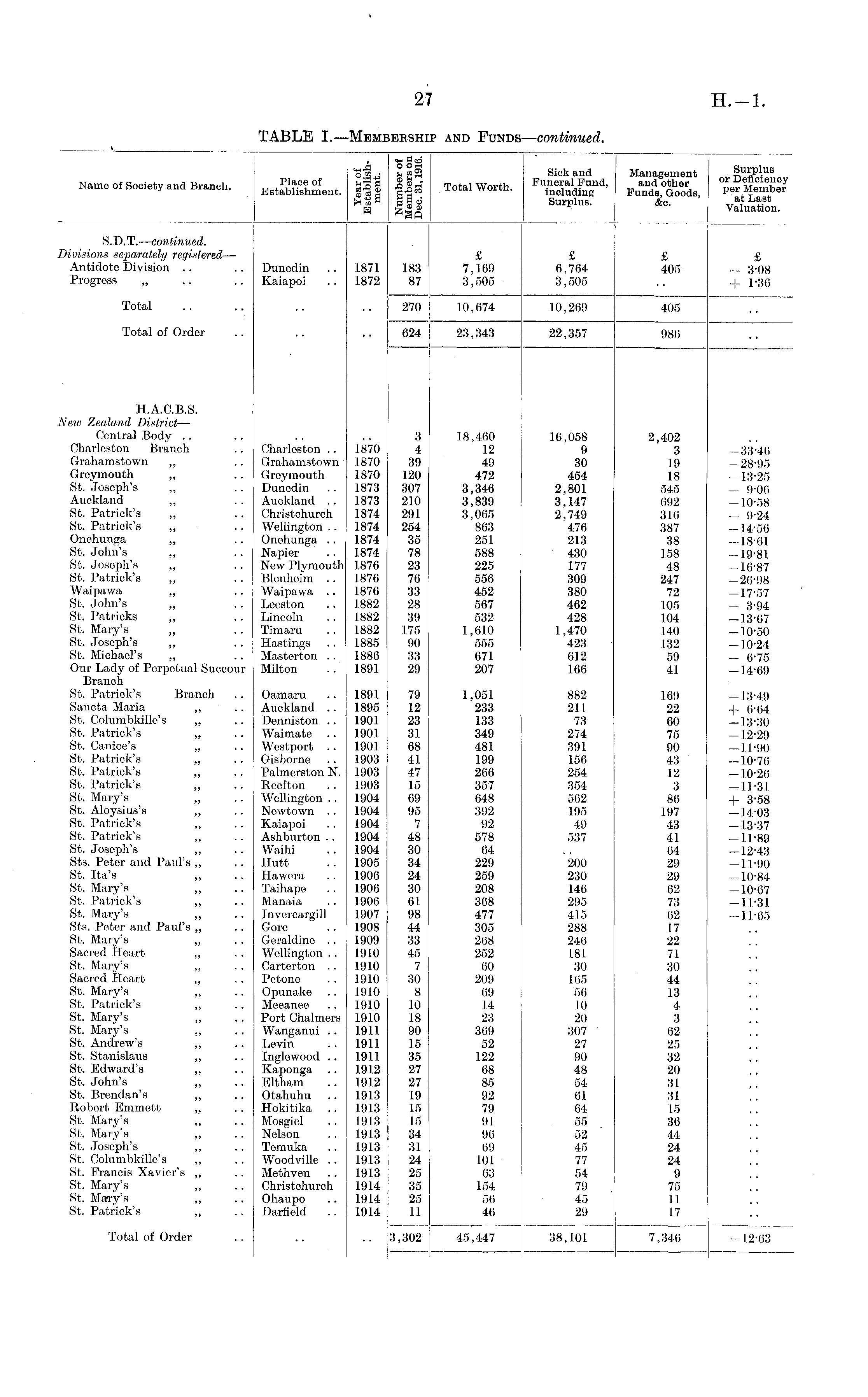 Name of Society and Branch. Place of Establishment. , cr, 3 to S»S Sick and nga .SSSr.' rn.,.., worn, Funeral Fund, g-5 2 IfS Total Woith. including (" » -> fl § g Surplus. H Management and other Funds, Goods, &c. Surplus or Deficiency por Mombor at Last Valuation. S.D. T. — continued. Divisions separately registered — Antidote Division Progress ,, Dunodin Kaiapoi 1871 1872 183 87 £ 7,109 3,505 £ 0.704 3,505 £ 405 £ - 3-08 + 1-38 Total .. . < 270 10,074 10,209 405 Total of Order 024 23,343 22,357 980 H.A.C.B.S. Ve.fi Zealand District — Central Body Charleston Branch Grahamstown „ Greymouth „ St. Joseph's „ Auckland „ St. Patrick's St. Patrick's ,, Onehunga „ St. John's St. Joseph's „ St. Patrick's ,, Waipawa „ St. John's „ St. Patricks „ St. Mary's „ St. Joseph's ,, St. Michael's Our Lady of Perpetual Succour Branoh St. Patrick's Branoh Sancta Maria ,, St. Columbkille's „ St. Patrick's ,, St. Canice's „ St. Patrick's „ St. Patrick's St. Patrick's „ St. Mary's ,, St. Aloysius's „ St. Patrick's St. Patrick's „ St. Joseph's ,, Sts. Peter and Paul's ,, St. Ita's „ St. Mary's St. Patrick's „ St. Mary's „ Sts. Peter and Paul's „ St. Mary's „ Sacred Heart „ St. Mary's „ Sacred Heart ,, St. Mary's St. Patrick's St. Mary's St. Mary's St. Andrew's ,, St. Stanislaus ,, St. Edward's ,, St. John's „ St. Brendan's ,, Robert Emmett ,, St. Mary's St. Mary's St. Joseph's ,, St. Columbkille's ,, St. Francis Xavier's ,, St. Mary's „ St. Mary's St. Patrick's ,, Charleston .. Grahamstown Greymouth Dunodin Auckland . . Christchureh Wellington .. Onehunga .. Napier Now Plymouth Blenheim . . Waipawa .. Leeston Lincoln Timaru Hastings Masterton .. Milton Oamaru Auokland .. Denniston .. Waimate Westport .. Gisborne Palmerston N. Reefton Wellington .. Newtown .. Kaiapoi Ashburton . . Waihi Hutt Hawera Taihapo Manaia InvercargiU Gore Geraldinc .. Wellington .. Carterton .. Petone Opunake Meeanee Port Chalmers Wanganui . . Levin Inglewood .. Kaponga Eltham Otahuhu Hokitika Mosgiel Nelson Temuka Woodville .. Methven Christchureh Ohaupo Darfield .. 1870 1870 1870 1873 1873 1874 1874 1874 1874 1870 1870 1870 1882 1882 1882 1885 1880 1891 1891 1895 1901 1901 1901 1903 1903 1903 1904 1904 1904 1904 1904 1905 1906 1906 1906 1907 1908 1909 1910 1910 1910 1910 1910 1910 1911 1911 19.11 1912 1912 1913 1913 1913 1913 1913 1913 1913 1914 1914 1914 3 4 39 120 307 210 291 254 35 78 23 70 33 28 39 175 90 33 29 79 12 23 31 08 41 47 15 09 95 7 48 30 34 24 30 61 98 44 33 45 7 30 8 10 18 90 15 35 27 27 19 15 15 34 31 24 25 35 25 II 18,400 .12 49 472 3,340 3,839 3,005 803 251 588 225 550 452 507 532 1,010 555 071 207 1,051 233 133 349 481 199 200 357 048 392 92 578 04 229 259 208 368 477 305 208 252 60 209 09 14 23 309 52 122 08 85 92 79 91 90 69 101 03 154 5(5 40 16,058 9 30 454 2,801 3,147 2,749 476 213 430 177 309 380 402 428 1,470 423 612 106 882 211 73 274 391 150 254 354 502 195 49 537 2,402 3 19 18 545 092 310 387 38 158 48 247 72 105 104 140 132 59 41 109 22 00 75 90 43 12 3 80 197 43 41 04 29 2!) 02 73 02 17 22 71 30 44 13 4 3 02 25 32 20 31 31 15 30 44 24 24 9 75 1.1 17 -33-40 -28-95 -13-25 - 9-00 -10-58 - 9-24 -.14-50 -18-01 -19-81 -10-87 -20-98 -17-57 - 3-94 -I3-07 -10-50 -10-24 - 0-75 -14-69 -13-49 -|- 6-64 -13-30 -12-29 -11-90 -10-70 -10-20 -11-31 + 3-58 -14-03 -13-37 - -11-89 -12-43 -11-90 -10-84 -10-07 -11-31 -11-65 200 230 140 295 415 288 240 181 30 105 50 10 20 307 27 90 48 54 61 04 55 52 45 77 54 79 45 29 Total of Order 3,302 45,447 38,101 7,340 -12-03