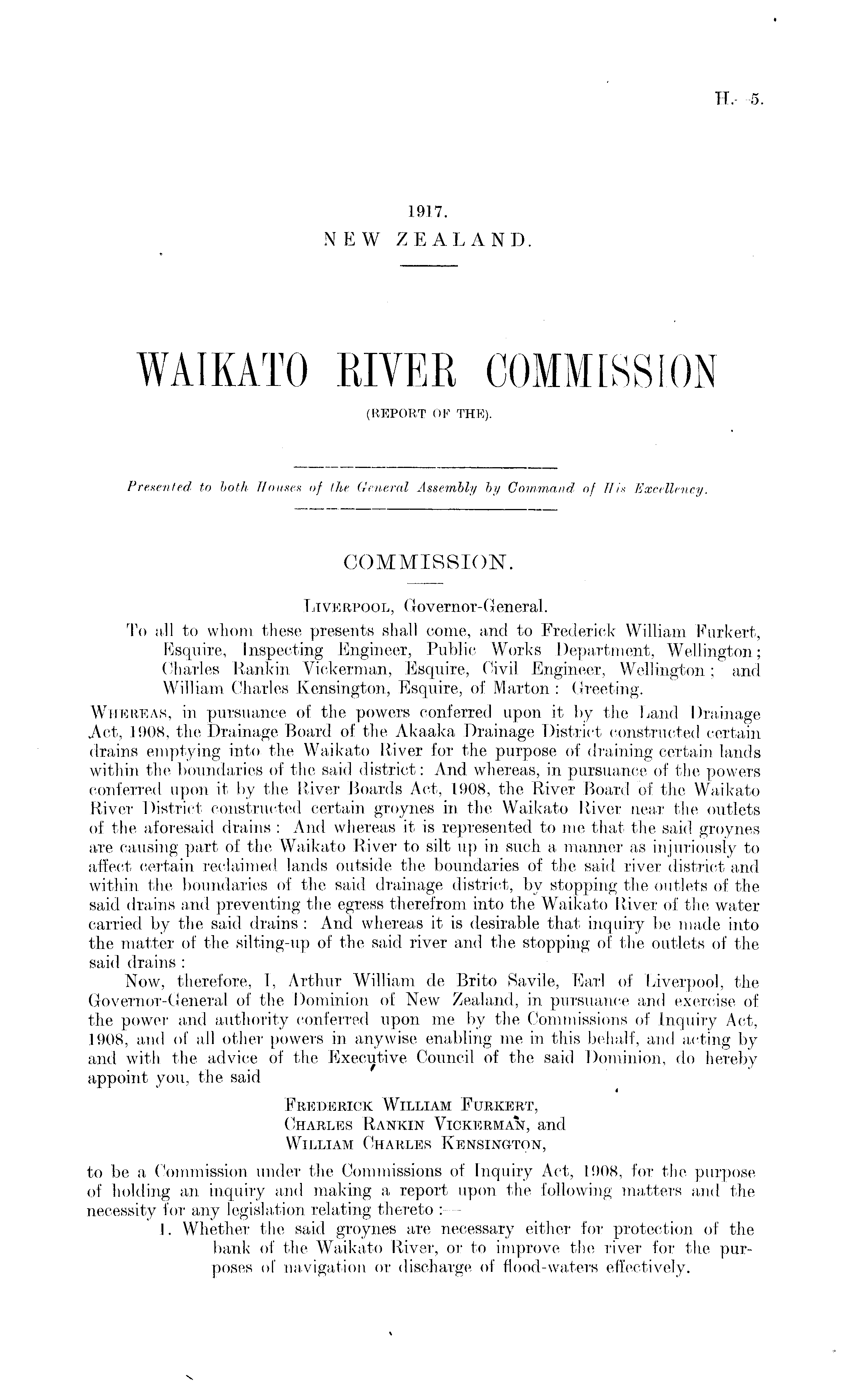 COMMISSION. Liverpool, Governor-General. To all to whom these presents shall come, and to Frederick William Furkert, Esquire, Inspecting Engineer, Public Works Department, Wellington; Charles Rankin Vickerman, Esquire, Civil Engineer, Wellington; and William Charles Kensington, Esquire, of Marton : Greeting. Whereas, in pursuance of the powers conferred upon it by the Land Drainage Act, 1908, the Drainage Board of the Akaaka Drainage District constructed certain drains emptying into the Waikato River for the purpose of draining certain lands within the boundaries of the said district: And whereas, in pursuance of the powers conferred upon it by the River Boards Act, 1908, the River Board of the Waikato River District constructed certain groynes in the Waikato River near the outlets of the aforesaid drains : And whereas it is represented to me that the said groynes are causing part of the Waikato River to silt up in such a manner as injuriously to affect certain reclaimed lands outside the boundaries of the said river district and within the boundaries of the said drainage district, by stopping the outlets of the said drains and preventing the egress therefrom into the Waikato River of the water carried by the said drains : And whereas it is desirable that inquiry be made into the matter of the silting-up of the said river and the stopping of the outlets of the said drains : Now, therefore, 1, Arthur William de Brito Savile, Earl of Liverpool, the Governor-General of the Dominion of New Zealand, in pursuance and exercise of the power and authority conferred upon me by the Commissions of Inquiry Act, 1908, and of all other powers in anywise enabling me in this behalf, and acting by and with the advice of the Executive Council of the said Dominion, do hereby appoint you, the said Frederick William Furkert, Charles Rankin Vickerman, and William Charles Kensington, to be a Commission under the Commissions of Inquiry Act, 1008, for the purpose of holding an inquiry and making a report upon the following matters and the necessity for any legislation relating thereto : - 1. Whether the said groynes are necessary either for protection of the bank of the Waikato River, or to improve the river for the purposes of navigation or discharge of flood-waters effectively.