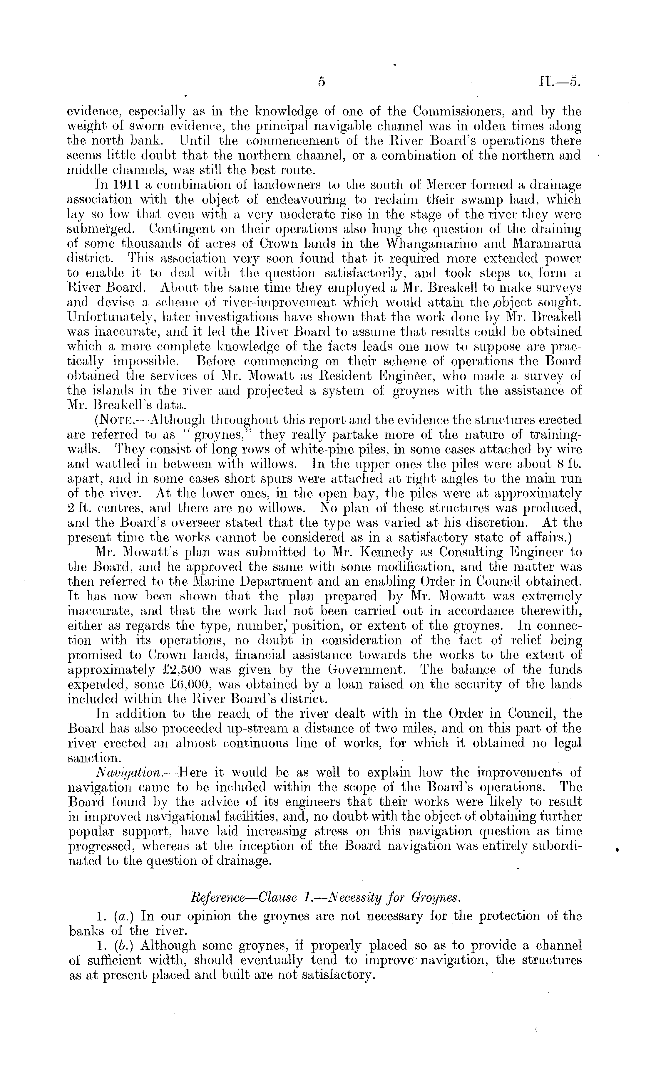 evidence, especially as in the knowledge of one of the Commissioners, and by the weight of sworn evidence, the principal navigable channel was in olden times along the north bank. Until the commencement of the River Board's operations there, seems little doubt that the northern channel, or a combination of the northern and middle channels, was still the best route. In 1911 a combination of landowners to the south of Mercer formed a drainage association with the object of endeavouring to reclaim their swamp land, which lay so low that even with a very moderate rise in. the stage of the river they were submerged. Contingent on their operations also hung the question, of the draining of some thousands of acres of Crown lands in the Wnangamarino and Maramarua district. This association very soon found that it required more extended power to enable it to deal with the question satisfactorily, and took steps to, form a River Board. About the same time they employed a Mr. Break ell to make surveys and devise a scheme of river-improvement which would attain the /object sought. Unfortunately, later investigations have shown that the work done by Mr. Breakell was inaccurate, and it led the River Board to assume that results could be obtained which a more complete knowledge of the facts leads one now to suppose are practically impossible. Before commencing on their scheme of operations the Board obtained the services of Mr. Mowatt as Resident Engineer, who made a survey of the islands in the river and. projected a system of groynes with the assistance of Mr. Breaker's data. (Note. —Although throughout this report and the evidence the structures erected are referred to as " groynes," they really partake more of the nature of trainingwalls. They consist of long rows of white-pine piles, in some cases attached by wire and wattled in between, with willows. In the upper ones the piles were about 8 ft. apart, and in some cases short spurs were attached at right angles to the main run of the river. At the lower ones, in the open bay, the piles were at approximately 2 ft. centres, and there are no willows. No plan of these structures was produced; and the Board's overseer stated that the type was varied at his discretion. At the present time the works cannot be considered as in a satisfactory state of affairs.) Mr. Mowatt's plan was submitted to Mr. Kennedy as Consulting Engineer to the Board, and he approved the same with some modification, and the matter was then referred to the Marine Department and an enabling Order in Council obtained. It has now been shown that the plan prepared by Mr. Mowatt was extremely inaccurate, and that the work had not been carried out in accordance therewith, either as regards the type, number,' position, or extent of the groynes. In connection with its operations, no doubt in consideration of the fact of relief being promised to Crown lands, financial assistance towards the works to the extent of approximately £2,500 was given by the Government. The balance of the funds expended, some £6,000, was obtained by a loan raised on the security of the lands included within the River Board's district. In addition to the reach of the river dealt with in the Order in Council, the Board has also proceeded up-stream a distance of two miles, and on this part of the river erected an almost continuous line of works, for which it obtained no legal sanction. Navigation.- Here it would be as well to explain how the improvements of navigation came to be included within the scope of the Board's operations. The Board found by the advice of its engineers that their works were likely to result in improved navigational facilities, and, no doubt with the object of obtaining further popular support, have laid increasing stress on this navigation question as time progressed, whereas at the inception of the Board navigation was entirely subordinated to the question of drainage. Reference- — Clause 1.—Necessity for Groynes. 1. (a.) In our opinion the groynes are not necessary for the protection of the banks of the river. 1. (b.) Although some groynes, if properly placed so as to provide a channel of sufficient width, should eventually tend to improve • navigation, the structures as at present placed and built are not satisfactory.
