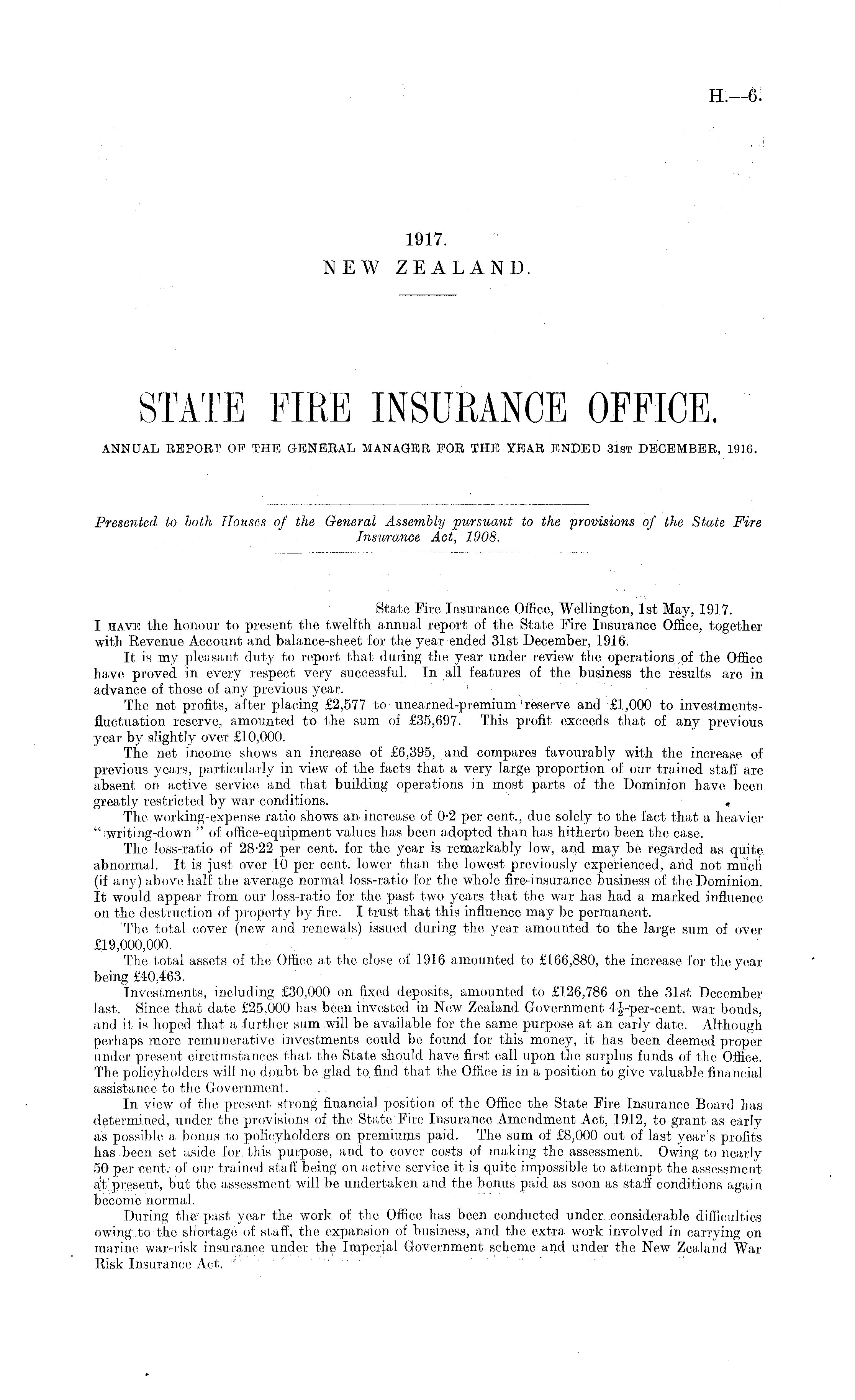 State Fixe Insurance Office, Wellington, Ist May, 1917. I have the honour to present the twelfth annual report of the State Fire Insurance Office, together with Revenue Account and balance-sheet for the year ended 31st December, 1916. It is my pleasant duty to report that during the year under review the operations .of the Office have proved, in every respect very successful. In all features of the business the results are in advance of those of any previous year. The net profits, after placing £2,577 to unearned-premium' reserve and £1,000 to investmentsfluctuation reserve, amounted to the sum of £35,697. This profit exceeds that of any previous year by slightly over £10,000. The net income shows an increase of £6,395, and compares favourably with the increase of previous years, particularly in view of the facts that a very large proportion of our trained staff are absent on active service and that building operations in most parts of the Dominion have been greatly restricted by war conditions. , The working-expense ratio shows an increase of o'2 per cent., due solely to the fact that a heavier " iwriting-down " of office-equipment values has been adopted than has hitherto been the case. The loss-ratio of 28-22 per cent, for the year is remarkably low, and may be regarded as quite abnormal. It is just over 10 per cent, lower than the lowest previously experienced, and not much (if any) above half the average normal loss-ratio for the whole fire-insurance business of the Dominion. It would appear from our loss-ratio for the past two years that the war has had a marked influence on the destruction of property by fire. I trust that this influence may be permanent. The total cover (new and renewals) issued during the year amounted to the large sum of over £19,000,000. The total assets of the Office at the close of 1916 amounted to £166,880, the increase for the year being £40,463. Investments, including £30,000 on fixed deposits, amounted to £126,786 on the 31st December last. Since that date £25,000 has been invested in New Zealand Government 4-J-per-cent. war bonds, and it is hoped that a further sum will fee available for the same purpose at an early date. Although perhaps more remunerative investments could be found for this money, it has been deemed proper under present circumstances that the State should have first call upon the surplus funds of the Office. The policyholders will no doubt be glad to, find that the Office is in a position to give valuable financial assistance to the Government. In view of the present strong financial position of the Office the State Fire Insurance Board has determined, under the provisions of the State Fire Insurance Amendment Act, 1912, to grant as early as possible a bonus to policyholders on premiums paid. The sum of £8,000 out of last year's profits has been set aside for this purpose, and to cover costs of making the assessment. Owing to nearly ,50 per cent, of our trained staff being on active service it is quite impossible to attempt the assessment atpresent, but the assessment will be undertaken and the bonus paid as soon as staff conditions again become normal. During the past year the work of the Office has been conducted under considerable difficulties owing to the shortage of staff, the expansion of business, and the extra work involved in carrying on marine war-risk insurance under the Imperial Government.scheme and under the New Zealand War Risk Insurance Act. '