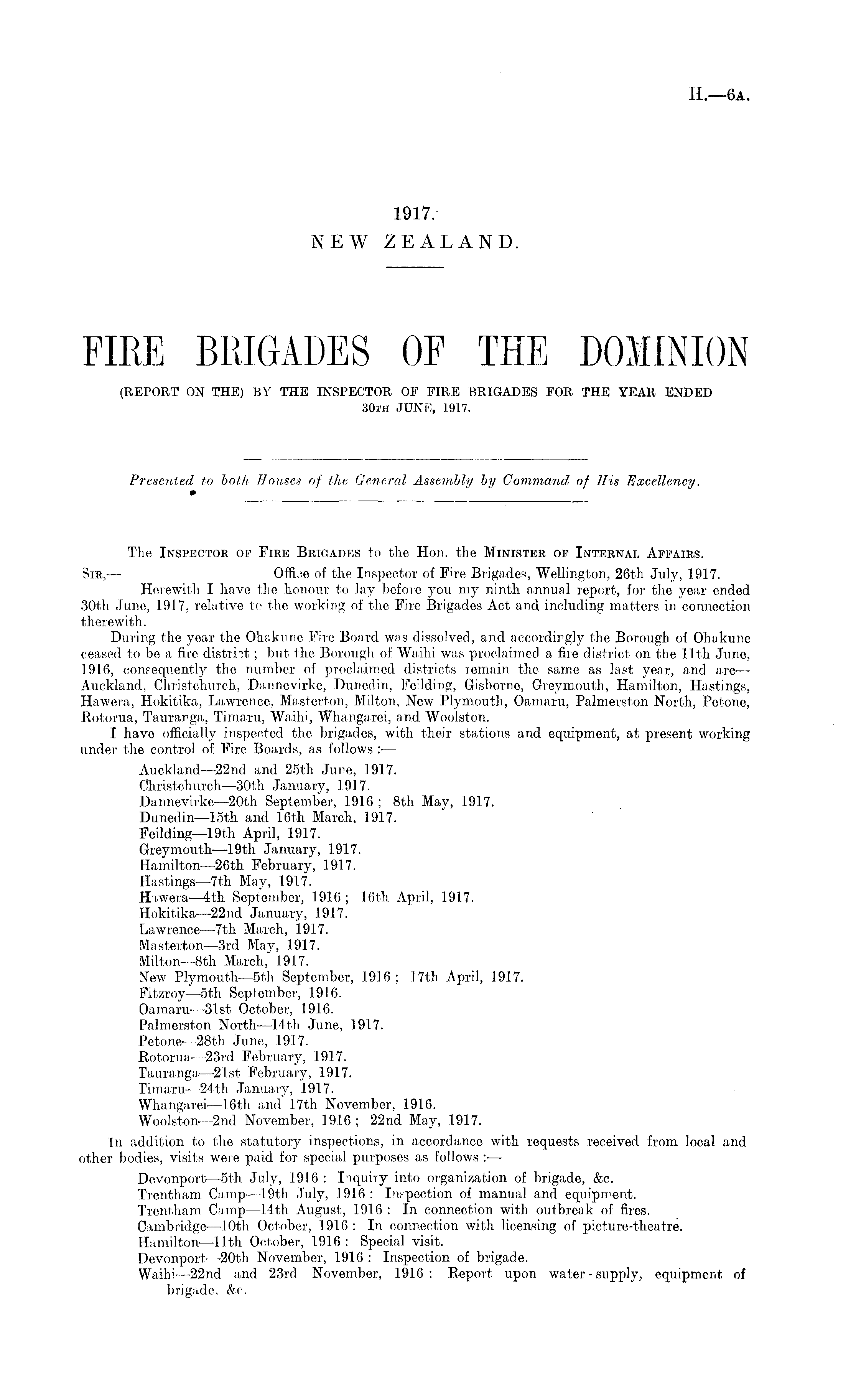 The Inspector of Fire Brigades to the Hon. the Minister of Internal Affairs. 3ir, — Office of the Inspector of Fire Brigades, Wellington, 26th July, 1917. Herewith I have the honour to lay before you my ninth annual report, for the year ended 30th June, 1917, relative to the working of the Fire Brigades Act and including matters in connection therewith. During the year the Ohakune Fire Board was dissolved, and accordingly the Borough of Ohakune ceased to be a fire district; but the Borough of Waihi was proclaimed a fire district on the 11th June, 1916, consequently the number of proclaimed districts remain the same as last year, and are- — Auckland, Christchurch, Dannevirke, Dunedin, Feilding, Gisborne, Greymouth, Hamilton, Hastings, Hawera, Hokitika, Lawrence, Masterton, Milton, New Plymouth, Oamaru, Palmerston North, Petone, Rotorua, Taurarga, Timaru, Waihi, Whangarei, and Woolston. I have officially inspected the brigades, with their stations and equipment, at present working under the control of Fire Boards, as follows :■ — Auckland—22nd and 25th June, 1917. Christchurch —30th January, 1917. Dannevirke—2oth September, 1916 ; Bth May, 1917. Dunedin—lsth and 16th March, 1917. Feilding—l9th April, 1917. Greymouth—l9th January, 1.917. Hamilton—26th February, 1917. Hastings—7th May, 1917. Hiwera—4th September, 1.916 ; 16th April, 1917. Hokitika—22nd January, 1917. Lawrence—7th March, 1917. Masterton—3rd May, 1917. Milton—Bth March, 1917. New Plymouth—sth September, 1916; 17th April, 1917. Fitzroy—sth September, 1916. Oamaru- —31st October, 1916. Palmerston North —14th June, 1917. Petone—2Bth June, 1917. Rotorua—23rd February, 1917. Tauranga—2lst February, 1917. Timaru—24th January, 1917. Whangarei—l6th and 17th November, 1916. Woolston—2nd November, 1916 ; 22nd May, 1917. In addition to the statutory inspections, in accordance with requests received from local and other bodies, visits were paid for special purposes as follows :■ — Devonport —sth July, 1916 : Inquiry into organization of brigade, &c. Trentham Camp—l9th July, 1916 : Inspection of manual and equipment. Trentham Camp—l4th August, 1916 : In connection with outbreak of fires. Cambridge—loth October, 1916 : In connection with licensing of picture-theatre. Hamilton- —11th October, 1916 : Special visit. Devonport —20th November, 1916 : Inspection of brigade. Waihi —22nd and 23rd November, 1916: Report upon water-supply, equipment of brigade, &c.