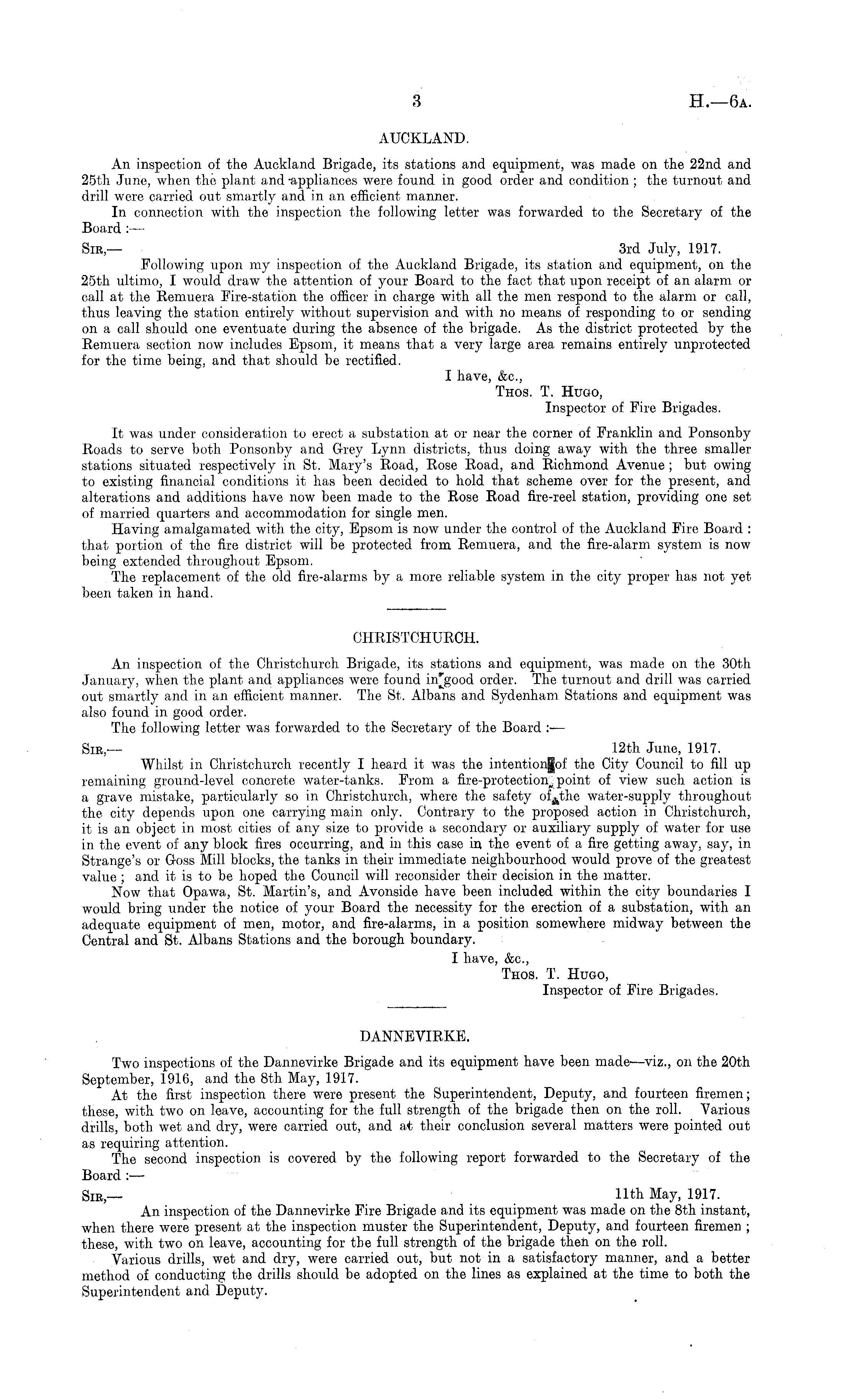 AUCKLAND. An inspection of the Auckland Brigade, its stations and equipment, was made on the 22nd and 2.5 th June, when the plant and-appliances were found in good order and condition ; the turnout and drill, were carried out smartly and in an efficient manner. In connection with the inspection the following letter was forwarded to the Secretary of the Board :— Sir— 3rd July, 1917. Following upon my inspection of the Auckland Brigade, its station and equipment, on the 25th ultimo, I would draw the attention of your Board to the fact that upon receipt of an alarm or call at the Remuera Fire-station the officer in charge with all the men respond to the alarm or call, thus leaving the station entirely without supervision and with no means of responding to or sending on a call should one eventuate during the absence of the brigade. As the district protected by the Remuera section now includes Epsom, it means that a very large area remains entirely unprotected for the time being, and that should be rectified. I have, &c, Thos. T. Hugo, Inspector of Fire Brigades. It was under consideration to erect a substation at or near the corner of Franklin and. Ponsonby Roads to serve both Ponsonby and Grey Lynn districts, thus doing away with the three smaller stations situated respectively in St. Mary's Road, Rose Road, and Richmond Avenue ; but owing to existing financial conditions it has been decided to hold that scheme over for the present, and alterations and additions have now been made to the Rose Road fire-reel station, providing one set of married quarters and accommodation for single men. Having amalgamated with the city, Epsom is now under the control of the Auckland Fire Board : that portion of the fire district will be protected from Remuera, and the fire-alarm system is now being extended throughout Epsom. The replacement of the old fire-alarms by a more reliable system in the city proper has not yet been taken in hand. (CHRISTCHURCH. An inspection of the Christchurch Brigade, its stations and equipment, was made on the 30th January, when the plant and appliances were found order. The turnout and drill was carried out smartly and in an efficient manner. The St. Albans and Sydenham Stations and equipment was also found in good order. The following letter was forwarded to the Secretary of the Board :— Sir,— 12th Juno, 1917. Whilst in Christchurch recently I heard it was the intention|of the City Council to fill up remaining ground-level concrete water-tanks. From a point of view such, action is a grave mistake, particularly so in Christchurch, where the safety of A the water-supply throughout the city depends upon one carrying main only. Contrary to the proposed action in Christchurch, it is an object in most cities of any size to provide a secondary or auxiliary supply of water for use in the event of any block fires occurring, and in this case in the event of a fire getting away, say, in Strange's or Goss Mill blocks, the tanks in their immediate neighbourhood would prove of the greatest value ; and it is to be hoped the Council will reconsider their decision in the matter. Now that Opawa, St. Martin's, and Avonside have been included within the city boundaries I would bring under the notice of your Board the necessity for the erection of a substation, with an adequate equipment of men, motor, and fire-alarms, in a position somewhere midway between the Central and St. Albans Stations and the borough boundary. I have, &c, Thos. T. Hugo, Inspector of Fire Brigades. DANNEVIRKE. Two inspections of the Dannevirke Brigade and its equipment have been made—viz., on the 20th September, 1916, and the Bth May, 1917. At the first inspection there were present the Superintendent, Deputy, and fourteen firemen; these, with two on leave, accounting for the full strength of the brigade then on the roll. Various drills, both wet and dry, were carried out, and at their conclusion several matters were pointed out as requiring attention. The second inspection is covered by the following report forwarded to the Secretary of the Board : — Sir,— 11th May, 1917. An inspection of the Dannevirke Fire Brigade and its equipment was made on the Bth instant, when there were present at the inspection muster the Superintendent, Deputy, and fourteen firemen ; these, with two on leave, accounting for the full strength of the brigade then on the roll. Various drills, wet and dry, were carried out, but not in a satisfactory manner, and a better method of conducting the drills should be adopted on the lines as explained at the time to both the Superintendent and Deputy.
