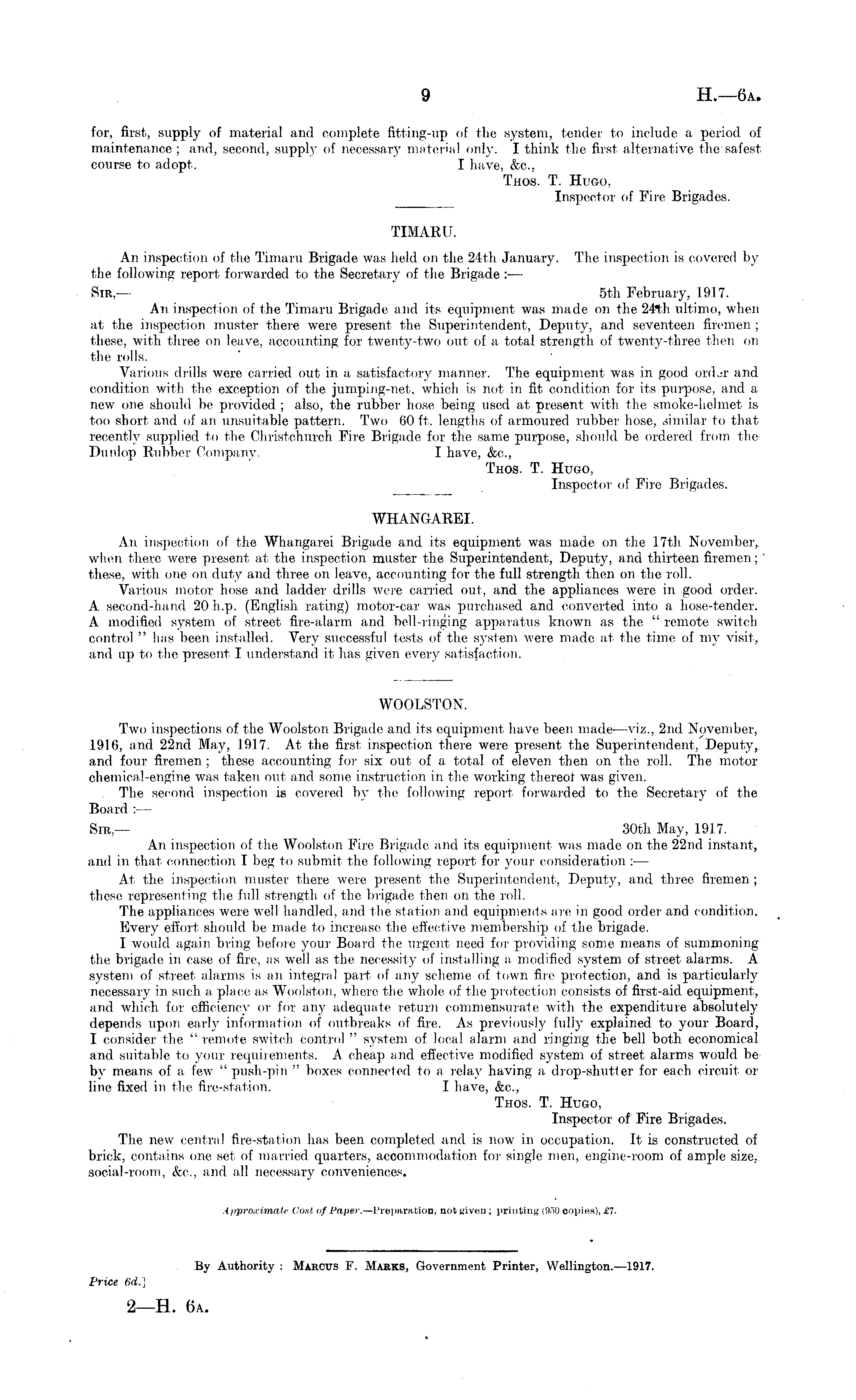 for, first, supply of material and complete fitting-up of the system, tender to include a period of maintenance ; and, second, supply of necessary material only. I think the first alternative the safest course to adopt. I have, &c, Thos. T. Hugo, Inspector of Fire Brigades. TIMARU. An inspection of the Timaru Brigade was held on the 24th. January. The inspection is covered by the following report forwarded to the Secretary of the Brigade : — Sir,— sth February, 1917. An inspection of the Timaru Brigade and its equipment was made on the 24th ultimo, when at the inspection muster there were present the Superintendent, Deputy, and seventeen firemen ; these, with three on leave, accounting for twenty-two out of a total strength of twenty-three then on the rolls. Various drills were carried out in a satisfactory manner. The equipment was in good ordjr and. condition with the exception of the jumping-net, which is not in fit condition for its purpose, and a new one should be provided ; also, the rubber hose being used at present with the smoke-helmet is too short and of an unsuitable pattern. Two 60 ft. lengths of armoured rubber hose, similar to that recently supplied to the Christchurch Fire Brigade for the same purpose, should be ordered from the Dunlop Rubber Company. I have, &c, Thos. T. Hugo, Inspector of Fire Brigades. WHANGAREI. An inspection of the Whangarei Brigade and its equipment was made on the I.7th November, when there were present at the inspection muster the Superintendent, Deputy, and thirteen firemen; these, with one on duty and three on leave, accounting for the full strength then on the roll. Various motor hose and ladder drills were carried out, and the appliances were in good order. A second-hand 20 h.p. (English, rating) motor-car was purchased and converted into a hose-tender. A modified system of street fire-alarm and bell-ringing apparatus known as the " remote switch control " has been installed. Very successful tests of the system were made' at the time of my visit, and up to the present I understand it has given every satisfaction. WOOLSTON. Two inspections of the Woolston Brigade and its equipment have been made-—viz., 2nd November, 1916, and 22nd May, 1917. At the first inspection there were present the Superintendent, Deputy, and four firemen; these accounting for six out of a total of eleven then on the roll. The motor chemical-engine was taken out and some instruction in the working thereof was given. . The second inspection is covered by the following report forwarded to the Secretary of the Board :— Sir,— 30th May, 1917. An inspection of the Woolston Fire Brigade and its equipment was made on the 22nd instant, and in that connection I beg to submit the following report for your consideration :■ — At the inspection muster there were present the Superintendent, Deputy, and three firemen; these representing the full strength of the brigade then on the roll. The appliances were well handled, and the station and equipments are in good order and condition. Every effort should be made to increase the effective membership of the brigade. I would again bring before your Board the urgent need for providing some means of summoning the brigade in case of fire, as well as the necessity of installing a modified system of street alarms. A system of street alarms is an integral part of any scheme of town fire protection, and is particularly necessary in such a place as Woolston, where the whole of the protection consists of first-aid equipment, and which for efficiency or for any adequate return commensurate with the expenditure absolutely depends upon earty information of outbreaks of fire. As previously fully explained to your Board, I consider the " remote switch control " system of local alarm and ringing the bell both, economical and suitable to your requirements. A cheap and effective modified system of street alarms would be by means of a few "push-pin " boxes connected to a relay having a. drop-shutter for each circuit or lino fixed in the fire-station. I have, &c, Thos. T. Hugo, Inspector of Fire Brigades. The new central fire-station has been completed and is now in occupation. It is constructed of briok, contains one set of married quarters, accommodation for single men, engine-room of ample size, social-room, &c, and all necessary conveniences.