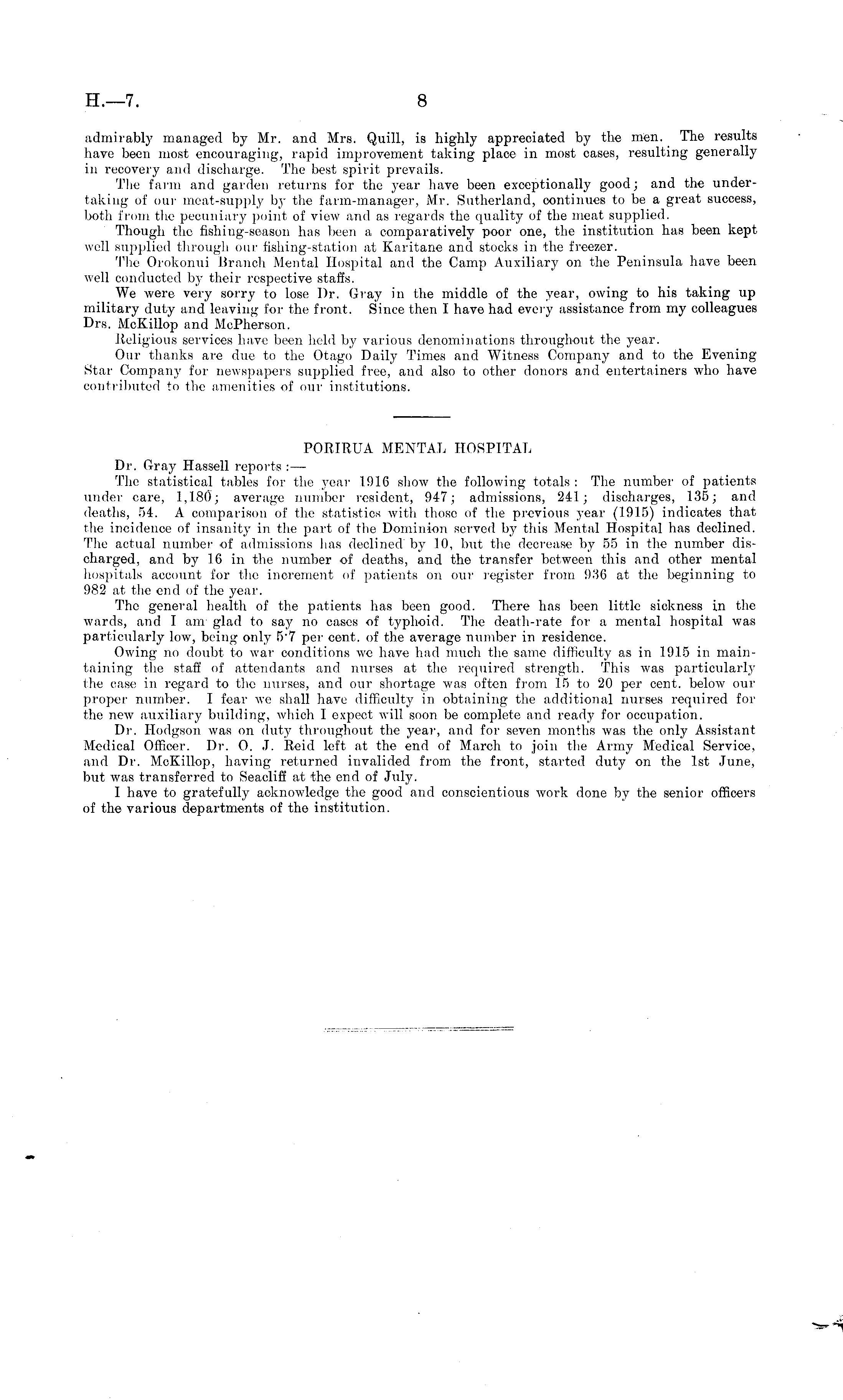 admirably managed by Mr. and Mrs. Quill, is highly appreciated by the men. The results have been most encouraging, rapid improvement taking place in most cases, resulting generally in recovery and discbarge. The best spirit prevails. The farm and garden returns for the year have been exceptionally good; and the undertaking of our meat-supply by the farm-manager, Mr. Sutherland, continues to be a great success, both from the pecuniary point of view and as regards the quality of the meat supplied. Though the fishing-season has been a comparatively poor one, the institution has been kept well supplied through our fishing-station at Karitane and stocks in the freezer. The Orokonui Branch Mental Hospital and the Camp Auxiliary on the Peninsula have been well conducted by their respective staffs. We were very sorry to lose Dr. Gray in the middle of the year, owing to his taking up military duty and leaving for the front. Since then I have had every assistance from my colleagues Drs. McKillop and McPherson. Religious services have been held by various denominations throughout the year. Our thanks are due to the Otago Daily Times and Witness Company and to the Evening Star Company for newspapers supplied free, and also to other donors and entertainers who have contributed to the amenities of our institutions. PORTRUA MENTAL HOSPITAL Dr. Gray Hassell reports : — The statistical tables for the year 1916 show the following totals: The number of patients under care, 1,180; average number resident, 947; admissions, 241; discharges, 135; and deaths, 54. A comparison of the statistics with those of the previous year (1915) indicates that the incidence of insanity in the part of the Dominion served by this Mental Hospital has declined. The actual number of admissions has declined by 10, but the decrease by 55 in the number discharged, and by 16 in the number of deaths, and the transfer between this and other mental hospitals account for the inoremenl nf patients on our register from 936 at the beginning to 982 at the end of the year. Tho general health of the patients has been good. There has been little sickness in the wards, and I am glad to say no cases of typhoid. The death-rate for a mental hospital was particularly low, being only 5*7 per cent, of the average number in residence. Owing no doubt to war conditions we have had much the same difficulty as in 1915 in maintaining the staff of attendants and nurses at the required strength. This was particularly the case in regard to the nurses, and our shortage was often from 15 to 20 per cent, below our proper number. I fear we shall have difficulty in obtaining the additional nurses required for the new auxiliary building, which I expect will soon be complete and ready for occupation. Dr. Hodgson was on duty throughout the year, and for seven months was the only Assistant Medical Officer. Dr. O. J. Reid left at the end of March to join the Army Medical Service, and Dr. McKillop, having returned invalided from the front, started duty on the Ist June, but was transferred to Seacliff at the end of July. I have to gratefully acknowledge the good and conscientious work done by the senior officers of the various departments of the institution.