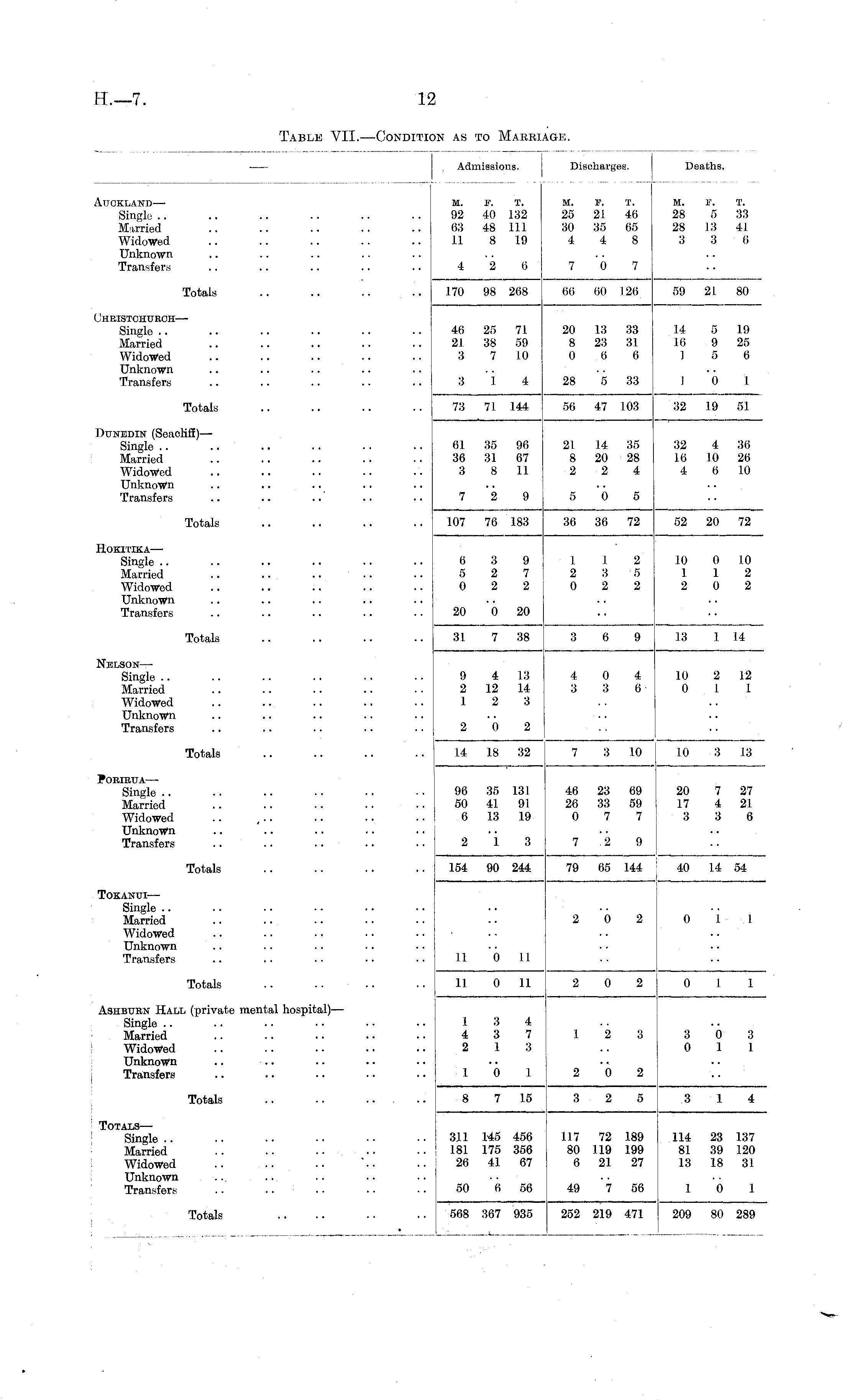 Admissions. Discharges. Deaths. All OKLA'ND Single Married Widowed Unknown .. .. Transfers M. F. T. 92 40 132 63 48 111 11 8 1.9 M. F. T. 25 21 46 30 35 65 4 4 8 M. F. T. 28 5 33 28 13 41 3 3 6 4 2 6 7 0 7 Totals 170 98 268 66 60 126 59 21 80 Ohristohuroh— Single Married WidoWed Unknown Transfers 46 21 3 25 38 7 71 59 10 20 8 0 13 23 6 33 31 6 14 16 1 5 9 5 19 25 6 3 i 4 28 5 33 I 0 I Totals 73 71 144 56 47 103 32 19 51 Dunedin (Seacliff) — Single .. Married WidoWed Unknown Transfers 61 36 3 35 31 8 96 67 11 21 S 2 14 20 2 35 28 4 32 4 36 1.6 10 26 4 6 1.0 7 2 9 5 0 5 Totals 107 76 183 36 36 72 52 20 72 Hokitika — Single Married Widowed Unknown Transfers 6 5 0 2 2 9 7 2 1 2 0 I. 3 2 2 5 2 1.0 1 2 0 1 0 10 2 2 20 '(') 20 Totals 31 7 38 o 6 13 1 14 Nelson —■ Single .. .. .,. Married Widowed Unknown Transfers 9 2 1 4 12 2 13 14 3 4 3 0 3 4 6 10 0 2 1 12 1 2 0 2 Totals 1.4 18 32 3 10 10 3 13 PORIRUA Single Married Widowed Unknown Transfers 96 50 6 35 41 13 131 91 19 46 26 0 23 33 7 69 59 7 20 17 3 7 4 3 27 21 6 2 1 3 7 2 9 Totals .. .. 154 90 244 79 65 144 40 14 54 Tokanui — Single Married Widowed Unknown Transfers 2 0 2 0 1 1 11 0 11 Totals 11 0 11 Ashburn Hall (private mental hospital) — Single Married WidoWed Unknown Transfers 1 4 2 3 3 1 4 7 3 1 2 3 3 0 6 i 3 1 1 0 1 2 6 2 Totals 7 15 3 Totals — Single Married .. .. Widowed Unknown ... .... Transfers 311 181 26 145 456 175 356 41 67 117 72 189 80 119 199 6 21. 27 114 81. 13 23 39 18 137 120 31 50 6 56 49 7 56 1 0 1 Totals 568 367 935 252 219 471 209 80 289 L