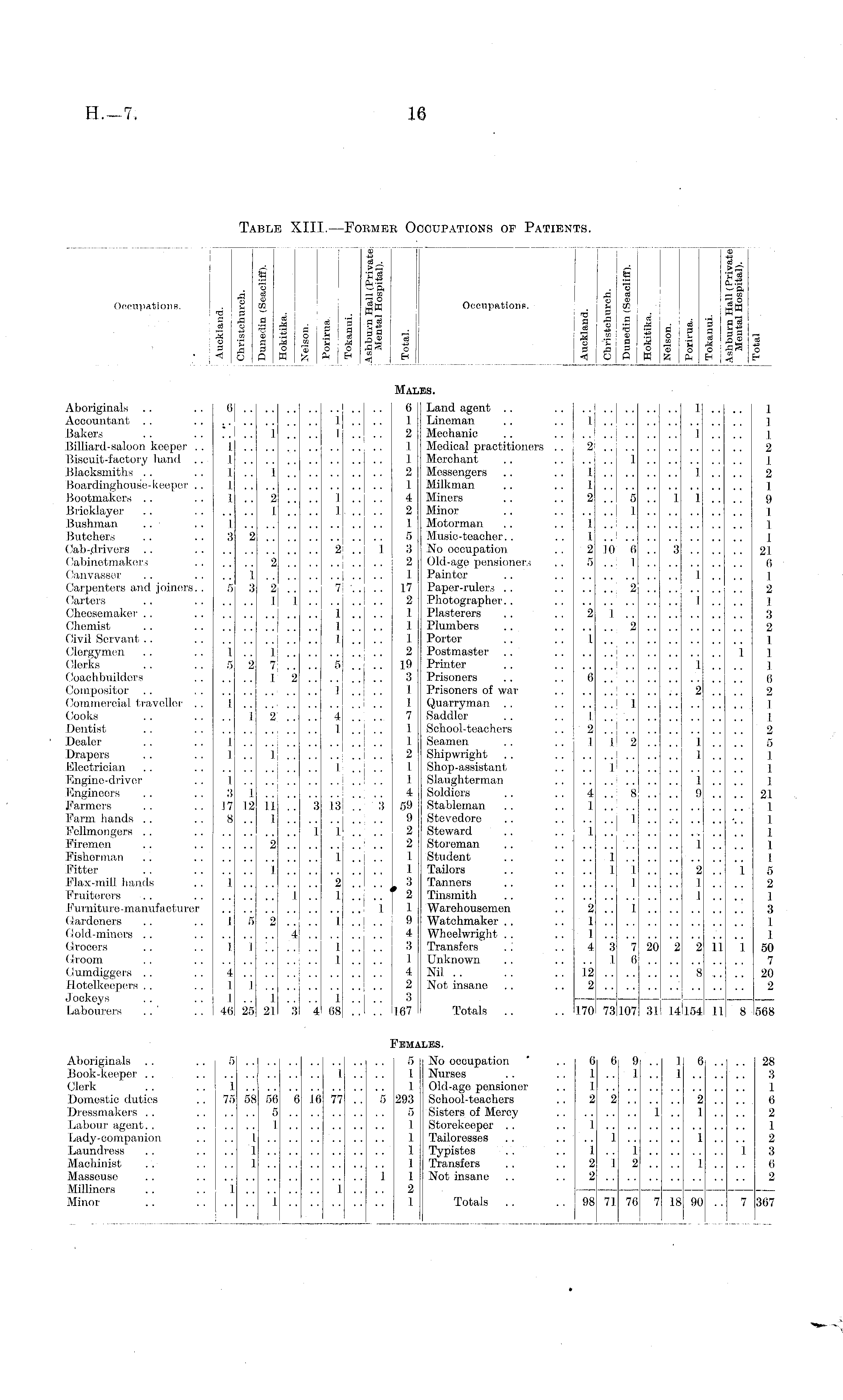 is 'cj a $ Occupations. . £ to *> " ~ H ; n h q to , .h : 3 " £ -a h § 5 r" HJ CCJ -H p jj g 0 '£ a h) I % £ M a jd a o o o ; o • < o P W 1 g hjH CO d . ■rj d §1 I« a & 5 a -; «* ■a 3 -g CD t_ «1 * I CO S \ *£ ■X Cl."S u ' — a S3 9? 1— co OcenpatioiiP. u cq ™y 1 1 I I « \i 1 §1 1 -i 1 s i I 1 \M 3 s a fi £ o | o o rga o < O P ffi C, CM H J tAboriginals .. . . 61 Accountant . . . . 1 . Bakers . . . . '. I .. 1 .. .. 1 , Billiard-saloon keeper . . 1 Biscuit-factory hand .. 1 Blacksmiths .. . . 1 .. 1 Boardinghous'e- keeper . . I Bootmakers .. .. 1. . . 2 .. .. I . Bricklayer .. .. .... I .. .. I . Bushman .. . . I Butchers .. . . 3 2 Oab-.drivers .. . . 2 . Cabinetmakers .. .. .. 2 . Canvasser .. . . . . 1 ......... . Carpenters and joiners. . 5 3 2 . . . . 7 '. Carters .. I 1 Cheosemaker . . 1 . Chemist . . 1 . Civil Servant .. j . . .. 1 . Clergymen .. .. 1 . . 1 Clerks .. .. 5 2 7; .... 5 . Coach buildors 12 Compositor .. 1 . Commercial traveller .. I .. Cooks .. . . . . I 2 .. . . 4 . Dentist . . .. 1 . Dealer .. .. I Drapers .. . . 1 .. 1 1 . Electrician .. 1 , Engine-driver .. 1 Engineors . . . . 3 1 Farmers .. .. 1.7 12 11 .. 3 13 . Farm hands . . . . 8 .. I Fellmongers . . 1 1 . Firemen .. 2 Fisherman .. 1 . Fitter . . I Flax-mill hands . . 1, 2 . Fruiterers . . I .. 1 . Furniture-manufacturer Gardeners .. .. I 5 2.... 1 . Gold-miners .. 4 Grocers, .. .. 1 1 '. 1 . Groom. . . 1 , Gumdiggers .. . . 4 Hotelkeepers .. .. 1 1 Jockeys .. .. 1 .. 1 .. .. 1 . Labourers . . ' .. 46 25 21 3 4 68 . Mal ,ES. 2 i 3 "2 2 i 1 2 I "2 "2 1 1 7 1 i 1 1 2 7 1 1 1 5 1 4 1 ! • ■ '.'. i ■.. I "I " .. .. 6 1 2 1 1 2 1 4 2 1 5 1 3 2 1 .. 17 2 1 1 I 2 .. 19 I •• 3 I I 7 1 1 2 1 I 4 3 59 ! ■• 9 2 2 1 1 3 T ? 9 4 3 I 4 2 3 I .. 167 Land agent .. 1 .. .. 1 Lineman .. .. 1 ] Mechanic .. .. .. 1 . . .. I Medical practitioners . . 2 2 Merchant .. 1 J. Messengers .. .. 1 I . . .. 2 Milkman .. .. 1 1 Miners . . . . 2 . . 5 . . 1 I . . . . 9 Minor .. I 1 | Motorman .. .. 1 .. 1 Music-teacher.. . . 1 ., | No occupation .. 2 10 6 .. 3 21 Old-age pensioners . . 5 . . I (i Painter .. 1 . . .. 1 Paper-rulers . . 2 . . .. j 2 Photographer.. I .. .. 1 Plasterers . . . . 2 I 3 Plumbers .. 2 2 Porter . . . . 1 ] Postmaster .. i 1 ] Printer .. ! 1 ,. ,. 1 Prisoners . . . . 6 . . j (i Prisoners of war ; 2 . . .. 2 Quarryman .. 1 ] \ Saddler . . . . L .. I | School-teachers .. 2 . . 2 Seamen .. .. 1 1' 2 . . . . 1 .. .. 5 Shipwright . . ...... I 1 1 Shop-assistant .. .. 1 1 Slaughterman 1 .. .. 1 Soldiers .. .. 4 .. 8 .. .. 9 .. .. 21 Stableman . . . . I I Stevedore .. j 1 . . •. . 1 Steward .. .. 1 1 Storemah .. ...... ! ... .. 1 Student . . .. .. 1 ' I Tailors .. .. .. 1 1 .. .. 2 .. 1 5 Tanners .. 1 .. .. 1 .. .. 2 Tinsmith .. 1 . . .. ] Warehousemen .. 2 .. I 3 Watchmaker . . . . 1 1 Wheelwright . . .. ' 1 1 Transfers . .' ., 4 3 7 20 2 2 11 1 50 Unknown . . .. . . I 6 7 Nil . . . . . . 12 8 20 Not insane . . . . 2 ' 2 i '2 1 1 2 1 1 2 5 2 i 6 i 2 1 '.'. i .. 1 10 6 ..; 1 '■'■ 2 2 '.'.\ 1 1 3 1 1 I 1 2 I 2 1 9 I 1 1 21 (i 1 2 1 3 2 I 1 1 6 2 I I 2 5 1 I .1 21 I 1 1 1 1 5 2 I 3 1 I 50 7 20 2 .... 'i '2 i 1 1 . .1 .; 1 .. 1 1 12 4 .1 . . 8 i 9 ii 1 3 is '.'. 3 ••! 'l 1 i 1 '2 1 .1 i i '2 1 1 .. 1 1 .. I 2 1 1 1. :: (- i 2 1 1 4 .. 1 5 2 i 1 1 3 7 1 (i 20 20 2 i '2 ii i 1 ii 2 8 25 i 21 3 4 i 68 Totals .. .. 170 73107 31 14 154 II 8 568 170 73 107 31 14 ,154 ii 8 568 Aboriginals . . .. 5 Book-keeper .. i Clerk . . .. 1 Domestic duties .. 75 58 56 6 16 77 Dressmakers . . 5 Labour agent. . I Lady-companion .. .. I Laundress . . . . . . 1 Machinist .. . . . . 1 Masseuse . . Milliners .. .. 1 1 Minor .. I 1LES. 0 1 2 : 6 9 .. J I . . 1 1 I 6 I . . ?em. 58 56 5 I 6 16 i 77 5 5 1 1 293 5 I 1 I I 1 2 1 I No occupation . . 6 6 9.. 1 6 . . . . 28 Nurses . . . . I .. 1 .. J 3 Old-age pensioner . . I 1 School-teachers .. 2 2 2 . . .. 6 Sisters of Mercy I . . 1 .. ., 2 Storekeeper .. .. 1 1 Tailorosses . . I 1 . . .. 2 Typistes ■"."."." . . 1 . . J 1 3 Transfers . . . . 2 I 2 . . . . 1 . . . . (i Not insane .. . . 2 2 ; 2 .. ~2 1 28 3 1 a 2 1 2 3 6 2 I 1 1 I .. .. 1 I 2 I i 2 2 1 1 i i i 1 Totals .. .. 98 71 76 7 18 90 .. 7 367 98 71 76 '. 7 7 18 90 7 367