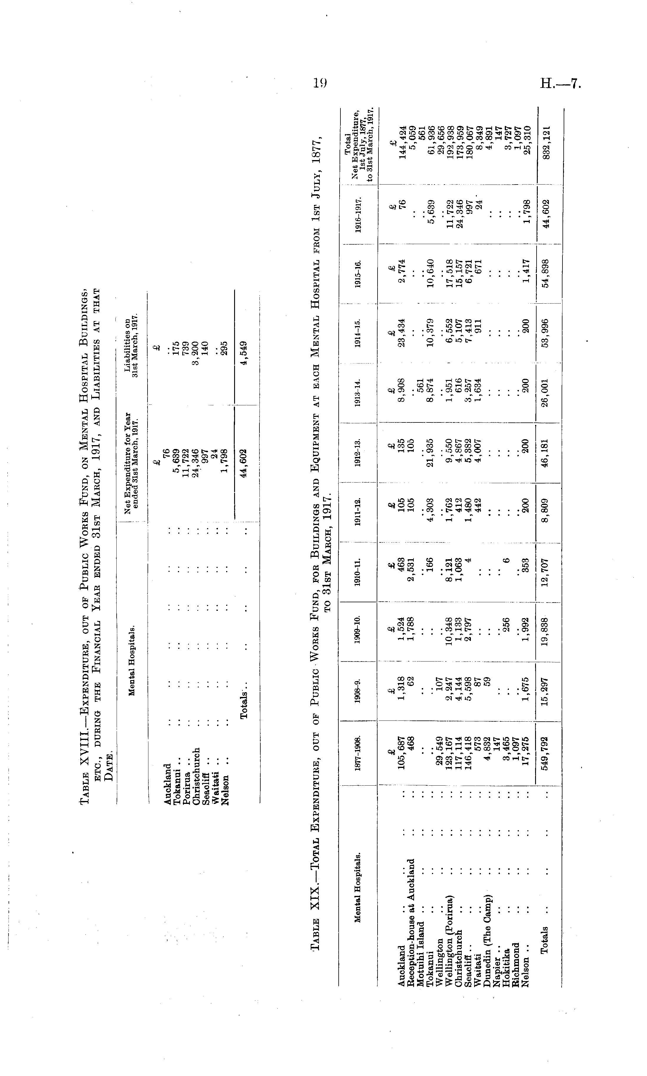 Table XIX.—Total Expenditure, out of Public Works Fund, for Buildings and Equipment at each Mental Hospital from 1st July, 1877, to 31st March, 1917.