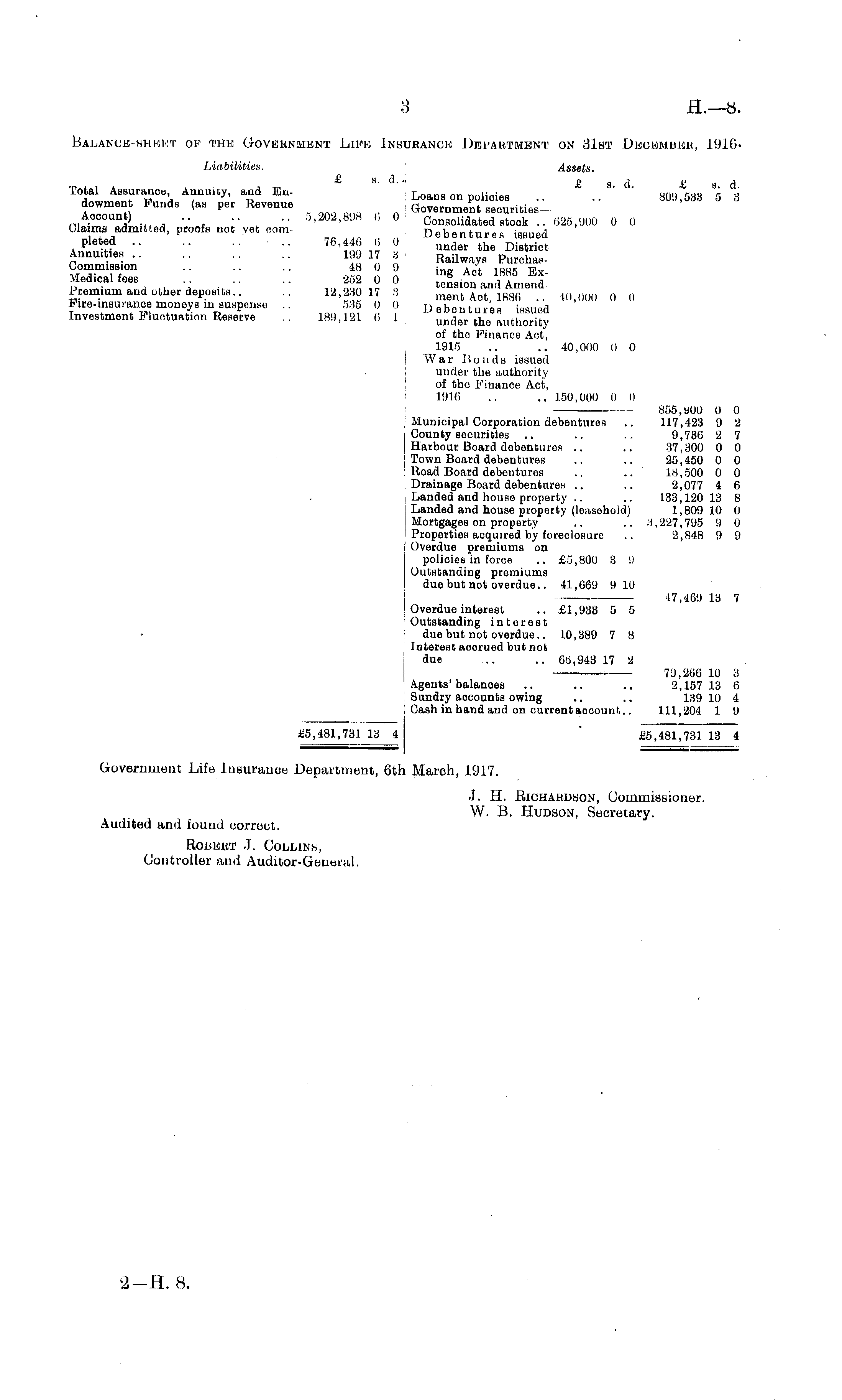 ISalanoe-nhiokt of the Government Life Insurance Department on 31st December, 1916Liabilities. Assets. Total Assurance Annuity, and En- Loans on policies .. *..*'*' \ 3 dowmen Funds (as per Revenue Government securitiesAccount) . .. .. 5,202,898 6 0 Consolidated stock .. 625,900 0 0 Claims admitted, proofs not yet com- Debentures issued P' et °? ' ■• 6 0 under the District ;V lnU,t,es Hallways PurehasCommission .. .. .. 48 0 9 in „ 4( i ,00c Wv K alfee % .H Vi .♦" - , Q S£,S2 ten^and'Amend: Premium arm other deposits.. 12,280 17 3 ment Act, 1880 .. 40,000 0 0 Fire-insurance moneys in suspense .. 535 0 0 Debentures issued Investment Fluctuat.on Reserve 189,121 (, 1 under the authority of the Finance Act, 1915 .. .. 40,000 0 0 War Bonds issued under the authority of the Finance Act, 1916 .. .. 150,000 0 (I 855,M00 0 0 Municipal Corporation debentures .. 117,423 9 2 County securities .. .. .. 9,736 2 7 Harbour Board debentures .. .. 37,300 0 0 ; Town Board debentures .. .. 25,450 0 0 Road Board debentures .. .. 18,500 0 0 Drainage Board debentures .. .. 2,077 4 6 Landed and house property .. .. 133,120 18 8 Landed and house property (leasohold) 1,809 10 0 Mortgages on property .. .. :i, 227,795 9 0 Properties acquired by foreclosure .. 2,848 9 9 Overdue premiums on policies in force .. £5,800 3 9 Outstanding premiums due but not overdue.. 41,669 910 17,469 13 7 Overdue interest .. £1,933 5 5 Outstanding interest • duo but not overdue.. 10,389 7 8 Interest aoorued but not due .. .. 66,943 17 2 79,266 10 8 Agents'balances .. .. .. 2,157 13 6 Sundry aocounts owing .. .. 139 10 4 Cash in hand and on current aooount,. 111,204 1 9 £5,481,731 13 4 £5,481,731 13 4 Government Life lusurauce Department, 6th March, 1917. J. 11. Richaudson, Commissioner. W. 13. Hudson, Secretary. Audited and fouud correct. Robert J. Collins, Controller and Auditor-General.