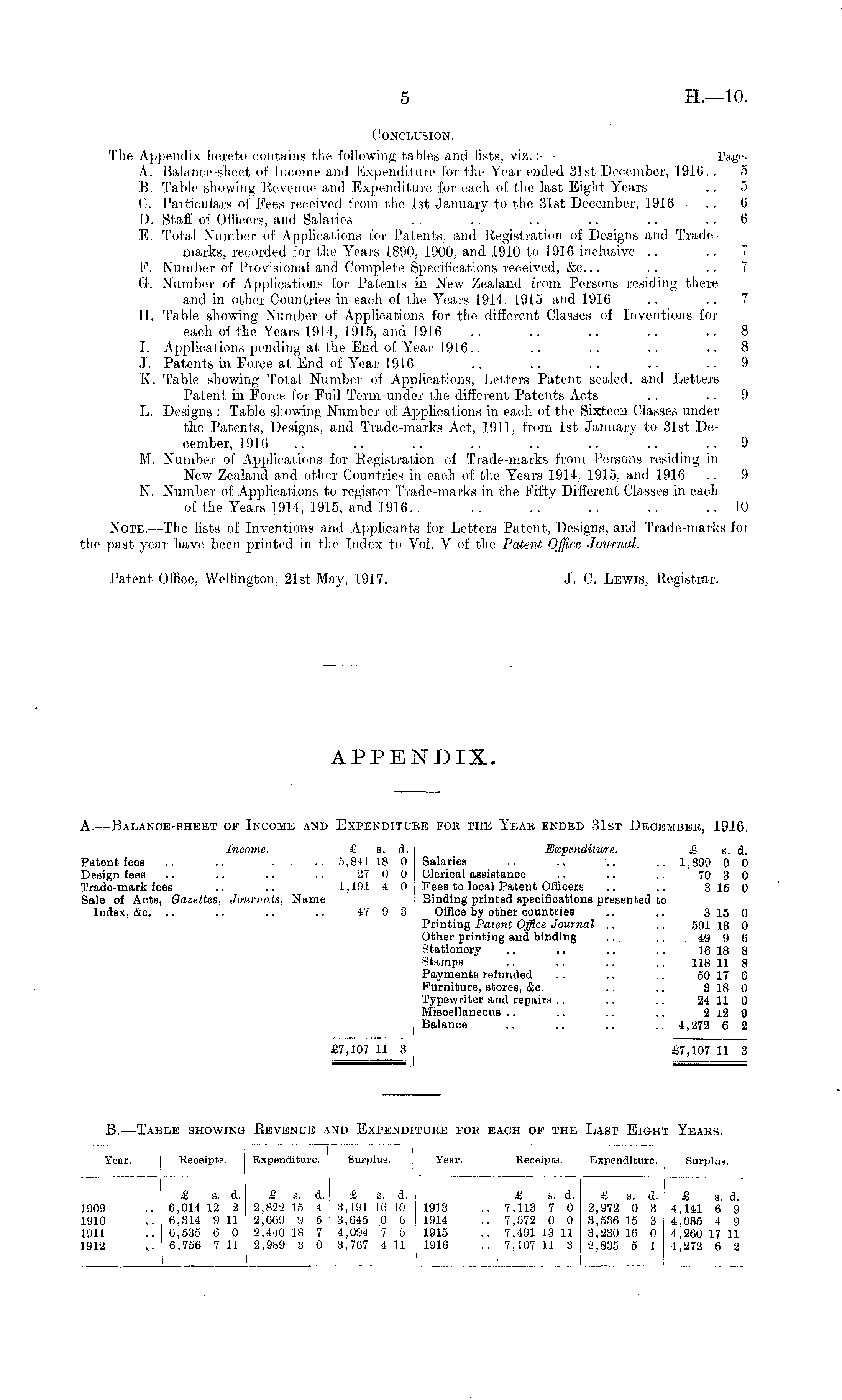 Conclusion. The Appendix hereto contains the following tables and lists, viz.: — Page. A. Balance-sheet of Income and Expenditure for the Year ended 31st December, 1916. . 5 B. Table showing Revenue and Expenditure for each of the last Eight Years .. 5 C. Particulars of Fees received from the Ist January to the 31st December, 1916 .. 6 D. Staff of Officers, and Salaries . . . . . . .. .. .. 6 E. Total Number of Applications for Patents, and Registration of Designs and Trademarks, recorded for the Years 1890, 1900, and 1910 to 1916 inclusive .. .. 7 F. Number of Provisional and Complete Specifications received, &c.. .. .. 7 G. Number of Applications for Patents in New Zealand from Persons residing there and in other Countries in each of the Years 1914, 1915 and 1916 .. .. 7 H. Table showing Number of Applications for the different Classes of Inventions for each of the Years 1914, 1915, and 1916 .. .. .. .. .. 8 I. Applications pending at the End of Year 1916.. .. .. .. ..8 J. Patents in Force at End of Year 1916 .. .. .. .. ..9 K. Table showing Total Number of Applications, Letters Patent sealed, and Letters Patent in Force for Full Term under the different Patents Acts .. . . 9 L. Designs : Table showing Number of Applications in each of the Sixteen Classes under the Patents, Designs, and Trade-marks Act, 1911, from Ist January to 31st December, 1916 .. .. .. .. .. .. .. .. 9 M. Number of Applications for Registration of Trade-marks from Persons residing in New Zealand and other Countries in each, of the. Years 1914, 1915, and 1916 .. 9 N. Number of Applications to register Trade-marks in the Fifty Different Classes in each of the Years 1914, 1915, and 1916.. .. .. .. .. ..10 Note. —The lists of Inventions and Applicants for Letters Patent, Designs, and Trade-marks for the past year have been printed in the Index to Vol. V of the Patent Office Journal. Patent Office, Wellington, 21st May, 1917. J. C. Lewis, Registrar.