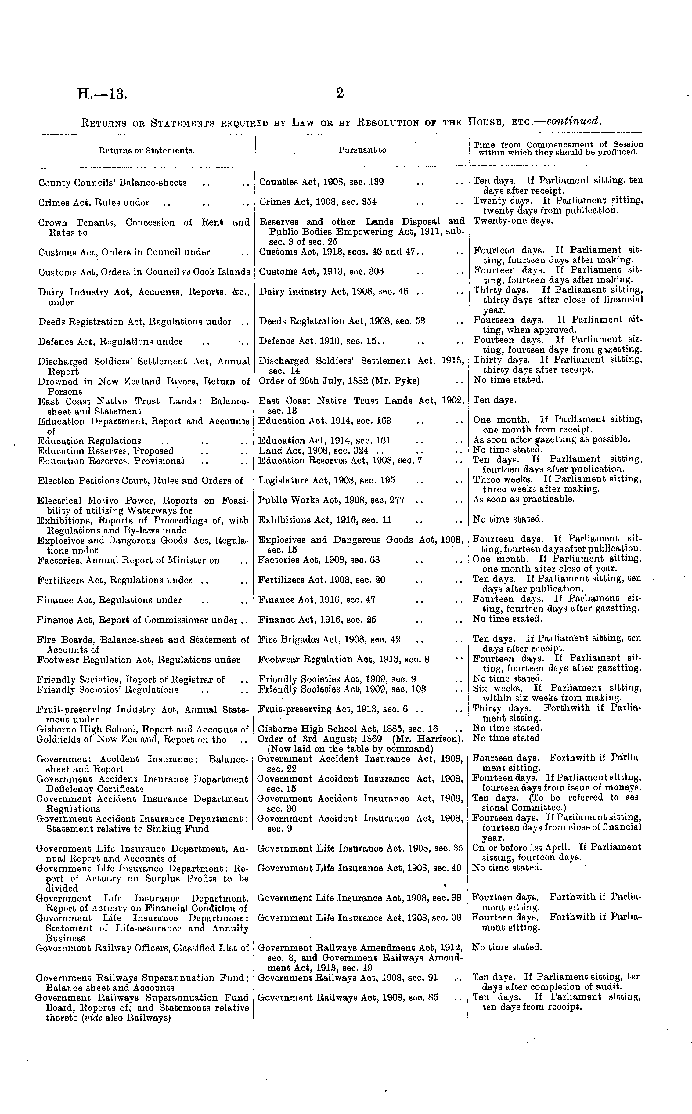 Returns or Statements. Pursuant to Time from Commencement of Session within which they should be produced. County Councils' Balance-sheets Crimes Aot, Rules under Counties Act, 1908, sec 189 Crimes Act, 1908, sec 354 Ten days. If Parliament sitting, ten days after receipt. Twenty days. If Parliament sitting, twenty days from publication. Twenty-one days. Crown Tenants, Concession of Rent and Rates to Reserves and other Lands Disposal and Publio Bodies Empowering Act, 1911, subsec 3 of seo. 25 CustomB Aot, 1913, sees. 46 and 47.. Customs Act, Orders in Council under Customs Act, Orders in Counoil re Cook Islands Dairy Industry Act, Accounts, Reports, &c, under Customs Aot, 1913, seo. 303 Dairy Industry Act, 1908, sec. 46 .. Deeds Registration Act, 1908, sec 53 Fourteen days. If Parliament sitting, fourteen days after making. Fourteen days. If Parliament sitting, fourteen days after making. Thirty days. If Parliament sitting, thirty days after close of finanoial year. Fourteen days. If Parliament sitting, when approved. Fourteen days. If Parliament sitting, fourteen days from gazetting. Thirty days. If Parliament sitting, thirty days after receipt. No time stated. Deeds Registration Aot, Regulations under .. Defence Act, Rsgulations under Defence Aot, 1910, sec. 15.. Discharged Soldiers' Settlement Act, Annual Report Drowned in New Zealand Rivers, Return of Persons East Coast Native Trust Lands: Balancesheet and Statement Education Department, Report and Acoounts of Eduoation Regulations Education Reserves, Proposed Eduoation Reserves, Provisional Discharged Soldiers' Settlement Act, 1915, sec 14 Order of 26th July, 1882 (Mr. Pyke) East Coast Native Trust Lands Aot, 1902, seo. 13 Education Aot, 1914, seo. 163 Ten days. One month. If Parliament sitting, one month from receipt. As soon after gazetting as possible. No time stated. Ten days. If Parliament sitting, fourteen days after publication. Three weeks. If Parliament sitting, three weeks after making. As soon as practicable. Eduoation Act, 1914, sec 161 Land Aot, 1908, seo. 324 .. Eduoation Reserves Act, 1908, seo. 7 Election Petitions Court, Rules and Orders of Legislature Act, 1908, sec 195 Electrical Motive Power, Reports on Feasibility of utilizing Waterways for Exhibitions, Reports of Proceedings of, with Regulations and By-laws made Explosives and Dangerous Goods Act, Regulations under Faotories, Annual Report of Minister on Publio Works Act, 1908, sec. 277 .. Exhibitions Act, 1910, seo. 11 Explosives and Dangerous Goods Act, 1908, sec 15 Faotories Aot, 1908, seo. 68 No time stated. Fourteen days. If Parliament sitting, fourteen days after publication. One month. If Parliament sitting, one month after close of year. Ten days. If Parliament sifting, ten days after publication. Fourteen days. If Parliament sitting, fourteen days after gazetting. No time stated. Fertilizers Aot, Regulations under Fertilizers Aot, 1908, seo. 20 Finance Aot, Regulations under Finanoe Aot, 1916, sec. 47 Finanoe Act, Report of Commissioner under .. Finance Aot, 1916, sec 25 Fire Boards, Balance-sheet and Statement of Accounts of Footwear Regulation Act, Regulations under Friendly Societies, Report of Registrar of Friendly Societies' Regulations Fire Brigades Aot, 1908, sec 42 Footwear Regulation Act, 1913, sec. 8 Friendly Sooieties Act, 1909, sec. 9 Friendly Sooieties Act, 1909, seo. 103 Ten days. If Parliament sitting, ten days after receipt. Fourteen days. If Parliament sitting, fourteen days after gazetting. No time stated. Six weeks. If Parliament sitting, within six weeks from making. Thirty days. Forthwith if Parliament sitting. No time stated. No time stated. Fruit-preserving Industry Aot, Annual Statement under Gisborne High School, Report and Accounts of Goldfields of New Zealand, Report on the Fruit-preserving Act, 1913, seo. 6 .. Gisborne High Sohool Act, 1885, sec. 16 Order of 3rd August. 1869 (Mr. Harrison). (Now laid on the table by oommand) Government Aocident Insuranoe Act, 1908, sec. 22 Government Aooident Insurance: Balancesheet and Report Government Aocident Insurance Department Deficiency Certificate Government Accident Insurance Department Regulations Government Aocident Insurance Department: Statement relative to Sinking Fund Government Aocident Insurance Aot, 1908, seo. 15 Government Accident Insuranoe Act, 1908, sec. 30 Government Aocident Insuranoe Aot, 1908, sec 9 Fourteen days. Forthwith if Parliament sitting. Fourteen days. If Parliament sitting, fourtoen days from issue of moneys. Ten days. (To bo referred to sessional Committee.) Fourteen days. If Parliament sitting, fourteen days from close of financial year. On or before 1st April. If Parliament sitting, fourteen days. No time stated. Government Life Insurance Department, Annual Report and Acoounts of Government Life Insurance Department: Report of Actuary on Surplus Profits to be divided Government Life Insuranoe Act, 1908, sec 35 Government Life Insuranoe Aot, 1908, sec. 40 Government Life Insurance Department, Report of Actuary on Financial Condition of Government Life Insurance Department: Statement of Life-assurance and Annuity Business Government Railway Officers, Classified List of Government Life Insuranoo Aot, 1908, sec 38 Government Life Insurance Aot, 1908, seo. 38 Fourtoen days. Forthwith if Parliament sitting. Fourteen days. Forthwith if Parliament sitting. Government Railways Amendment Act, 1912, sec 3, and Government Railways Amendment Aot, 1913, sec. 19 Government Railways Aot, 1908, sec. 91 No time stated. Government Railways Superannuation Fund: Balance-sheet and Aooounts Government Railways Superannuation Fund Board, Reports of, and Statements relative thereto (vide also Railways) Government Railways Aot, 1908, sec 85 Ten days. If Parliament sitting, ten days after completion of audit. Ten days. If Parliament sitting, ten days from receipt.