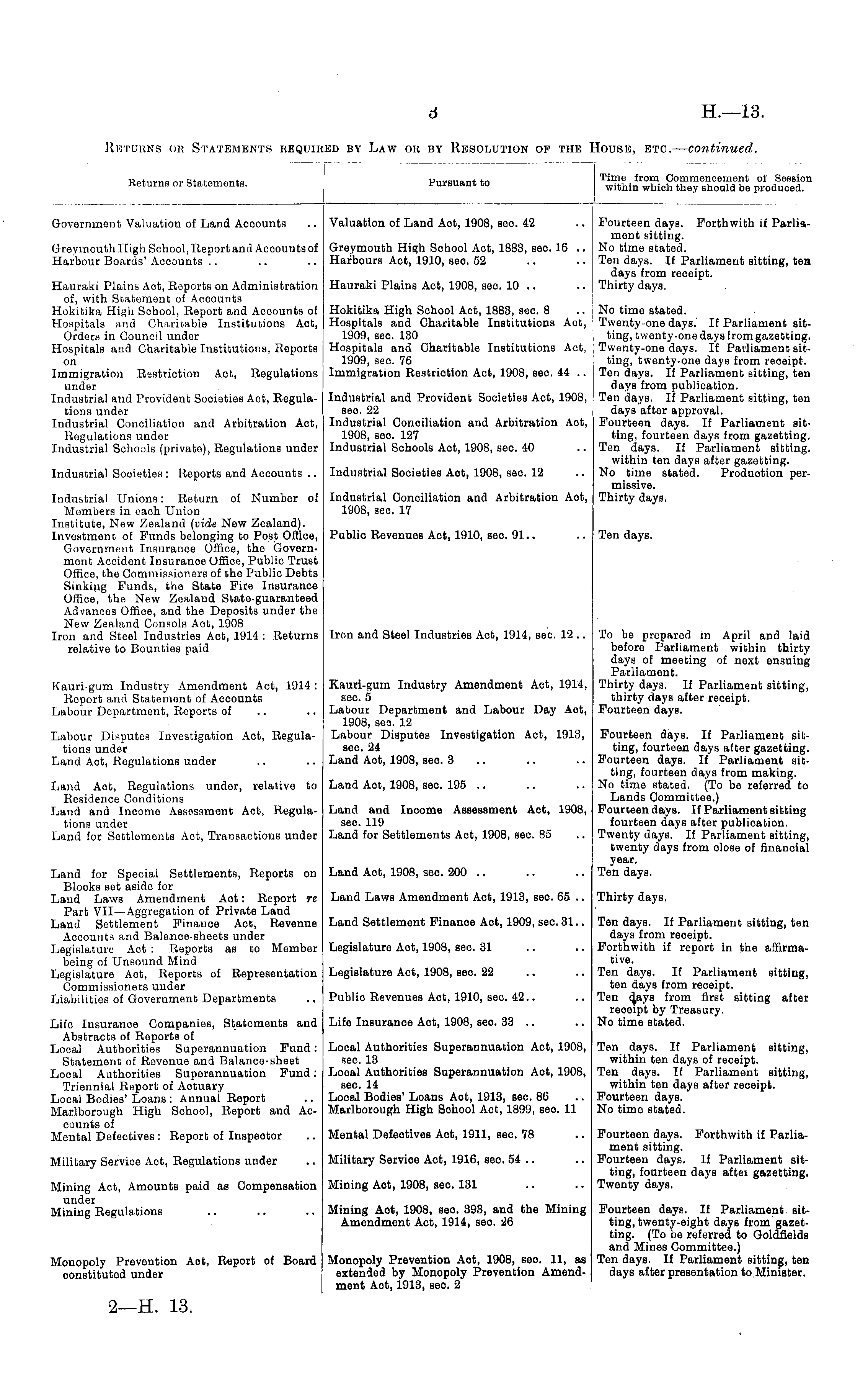 Returns or Statements. Pursuant to Time from Commencement of Session within which they should be produced. Government Valuation of Land Accounts Greymouth High School, Report and Acoounts of Harbour Boards' Accounts Valuation of Land Act, 1908, soo. 42 Greymouth High School Aot, 1883, sec. 16 .. Harbours Aot, 1910, seo. 52 Fourteen days. Forthwith if Parliament sitting. No time stated. Ten days. If Parliament sitting, ten days from receipt. Thirty days. Hauraki Plains Act, Reports on Administration of, with Statement of Accounts Hokitika High School, Report and Acoounts of Hospitals and Charitable Institutions Aot, Orders in Counoil under Hospitals and Charitable Institutions, Reports on Immigration Restriction Act, Regulations under Industrial and Provident Sooieties Act, Regulations under Industrial Conciliation and Arbitration Aot, Regulations under Industrial Schools (private), Regulations under Hauraki Plains Act, 1908, sec 10 .. Hokitika High Sohool Act, 1883, sec. 8 Hospitals and Charitable Institutions Aot, 1909, sec. 130 Hospitals and Charitable Institutions Aot, 1909, seo. 76 Immigration Restriction Act, 1908, sec. 44 .. Industrial and Provident Sooieties Act, 1908, seo. 22 Industrial Conciliation and Arbitration Act, 1908, sec. 127 Industrial Schools Act, 1908, sec. 40 No time stated. Twenty-one days. If Parliament sitting, twenty-one days from gazetting. Twenty-one days. If Parliament sitting, twenty-one days from receipt. Ten days. If Parliament sitting, ten days from publication. Ten days. If Parliament sitting, ten days after approval. Fourteen days. If Parliament sitting, fourtoen days from gazetting. Ten days. If Parliament sitting, within ten days after gazetting. No time stated. Production permissive. Thirty days. Industrial Sooieties : Reports and Accounts .. Industrial Societies Aot, 1908, seo. 12 Industrial Unions: Return of Number of Mombers in each Union Institute, New Zealand (vide New Zealand). Investment of Funds belonging to Post Office, Government Insuranoe Office, the Government Accident Insurance Office, Public Trust Office, the Commissioners of the Public Debts Sinking Funds, the State Fire Insurance Office, the New Zealand State-guaranteed Advances Office, and the Deposits undor the New Zealand Consols Act, 1908 Iron and Steel Industries Act, 1914 : Returns relative to Bounties paid Industrial Conciliation and Arbitration Aot, 1908, seo. 17 Public Revenues Act, 1910, sec. 91.. Ten days. Iron and Steel Industries Aot, 1914, sec. 12 .. Kauri-gum Industry Amendment Aot, 1914: Report and Statemont of Accounts Labour Department, Reports of Kauri-gum Industry Amendment Aot, 1914, sec 5 Labour Department and Labour Day Aot, 1908, sec 12 Labour Disputes Investigation Act, 1913, sec. 24 Land Aot, 1908, sec 3 To be prepared in April and laid before Parliament within thirty days of meeting of next ensuing Parliamont. Thirty days. If Parliament sitting, thirty days after receipt. Fourteen days. Labour Disputes Investigation Act, Regulations under Land Act, Regulations under Land Aot, Regulations under, relative to Residence Conditions Land and Income Assessment Act, Regulations under Land for Settlements Act, Transactions under Land Aot, 1908, seo. 195 .. Land and Income Assessment Act, 1908, sec 119 Land for Settlements Act, 1908, sec. 85 Fourteen days. If Parliament sitting, fourteon days after gazetting. Fourteen days. If Parliament sitting, fourteen days from making. No time stated. (To be referred to Lands Committee.) Fourteen days. If Parliament sitting fourteen days after publication. Twenty days. If Parliament sitting, twenty days from olose of financial year. Ten days. Land for Special Settlements, Reports on Blocks set aside for Land Laws Amendment Aot: Report re Part VII —Aggregation of Private Land Land Settlement Finance Act, Revenue Acoounts and Balance-sheets under Legislature Act : Reports as to Member being of Unsound Mind Legislature Aot, Reports of Representation Commissioners under Liabilities of Government Departments Land Act, 1908, sec 200 .. Land Laws Amendment Aot, 1913, sec 65 .. Thirty days. Land Settlement Finanoe Aot, 1909, sec 31.. Ten days. If Parliament sitting, ten days from reoeipt. Forthwith if report in the affirmative. Ten days. If Parliament sitting, ten days from receipt. Ten d,ays from first sitting after receipt by Treasury. No time stated. Legislature Act, 1908, seo. 31 Legislature Aot, 1908, sec. 22 Publio Revenues Act, 1910, sec. 42.. Life Insurance Companies, Statements and Abstracts of Roports of Looal Authorities Superannuation Fund: Statement of Rovenue and Balanco-sheet Looal Authorities Superannuation Fund: Triennial Report of Actuary Local Bodies'Loans : Annual Report Marlborough High Sohool, Report and Accounts of Mental Defectives : Report of Inspeotor Life Insurance Act, 1908, sec 33 .. Local Authorities Superannuation Act, 1908, sec. 13 Local Authorities Superannuation Aot, 1908, sec 14 Local Bodies' Loans Act, 1913, seo. 86 Marlborough High Sohool Aot, 1899, seo. 11 Ten days. If Parliament sitting, within ten days of receipt. Ten days. If Parliament sitting, within ten days after receipt. Fourteen days. No time stated. Military Service Aot, Regulations under Mental Defectives Act, 1911, seo. 78 Military Servioe Aot, 1916, sec. 54 .. Fourteen days. Forthwith if Parliament sitting. Fourteen days. If Parliament sitting, fourteen days after gazetting. Twenty days. Mining Act, Amounts paid as Compensation under Mining Regulations Mining Act, 1908, sec. 131 Monopoly Prevention Aot, Report of Board constituted under Mining Aot, 1908, sec 393, and the Mining Amendment Act, 1914, seo. 26 Fourteen days. If Parliament sitting, twenty-eight days from gazetting. (To be referred to Goldfieids and Mines Committee.) Ten days. If Parliament sitting, ten days after presentation to Minister. Monopoly Prevention Act, 1908, sec 11, as extended by Monopoly Prevention Amendment Aot, 1913, sec. 2