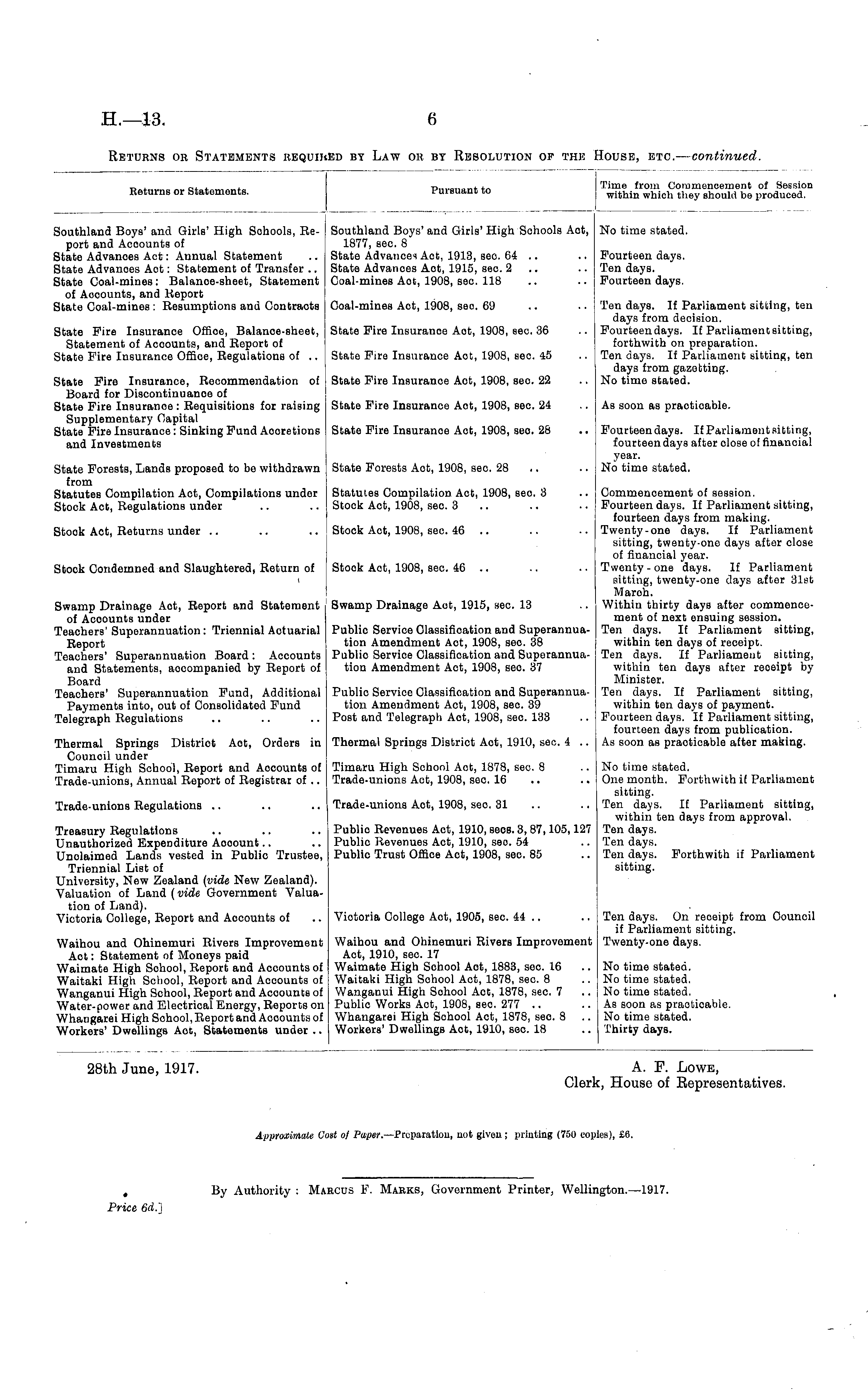 Returns or Statements. Pursuant to Time from Commencement of Session within which they should be produced. Southland Boys' and Girls' High Sohools, Report and Acoounts of State Advanoes Act: Annual Statement State Advanoes Aot: Statement of Transfer .. State Coal-mines: Balanoe-sheet, Statement of Aooounts, and Report State Coal-mines : Resumptions and Contracts Southland Boys' and Girls' High Sohools Aot, 1877, sec. 8 State Advances Act, 1913, seo. 64 .. State Advances Aot, 1915, sec. 2 .. Coal-mines Aot, 1908, sec. 118 No time statod. Fourtoen days. Ten days. Fourteen days. Coal-mines Act, 1908, sec. 69 Ten days. If Parliament sitting, ten days from decision. Fourteendays. If Parliament sitting, forthwith on preparation. Ten days. If Parliament sitting, ten days from gazetting. No time stated. State Fire Insurance Office, Balance-sheet, Statement of Acoounts, and Report of State Fire Insuranoe Offioe, Regulations of .. State Fire Insurance Aot, 1908, sec. 36 State Fire Insurance Aot, 1908, sec. 45 State Fire Insurance, Recommendation of Board for Discontinuanoe of State Fire Insuranoe : Requisitions for raising Supplementary Capital State Fire Insurance : Sinking Fund Aooretions and Investments State Fire Insurance Aot, 1908, sec. 22 State Fire Insurance Aot, 1908, sec. 24 As soon as practicable. State Fire Insuranoe Act, 1908, sec 28 Fourteendays. If Parliament sitting, fourteen days after olose of financial year. No time stated. State Forests, Lands proposed to bo withdrawn from Statutes Compilation Aot, Compilations under Stock Act, Regulations under State Forests Aot, 1908, seo. 28 Statutes Compilation Act, 1908, sec 3 Stock Act, 1908, sec 3 Commencement of session. Fourteen days. If Parliament sitting, fourteen days from making. Twenty-one days. If Parliament sitting, twenty-one days aftor close of financial year. Twenty - one days. If Parliament sitting, twenty-one days after 31st March. Within thirty days after commencement of next ensuing session. Ten days. If Parliament sitting, within ten days of receipt. Ten days. If Parliament sitting, within ten days after rooeipt by Minister. Ten days. If Parliament sitting, within ten days of payment. Fourteen days. If Parliament sitting, fourteen days from publication. As soon as practicable after making. Stook Act, Returns under Stook Act, 1908, sec. 46 .. Stock Condemned and Slaughtered, Return of i Stook Act, 1908, sec. 46 .. Swamp Drainage Act, Report and Statement j of Acoounts under Teachers' Superannuation: Triennial Actuarial Report Teachers' Superannuation Board : Accounts and Statements, aocompanied by Report of Board Teachers' Superannuation Fund, Additional Payments into, out of Consolidated Fund Telegraph Regulations Swamp Drainage Act, 1915, seo. 13 Publio Service Classification and Superannuation Amendment Act, 1908, sec. 38 Public Service Classification and Superannuation Amendment Act, 1908, seo. 37 Public Service Classification and Superannuation Amendment Act, 1908, seo. 39 Post and Telegraph Act, 1908, sec. 133 Thermal Springs District Aot, Orders in Counoil under Timaru High Sohool, Report and Accounts of Trade-unions, Annual Report of Registrar of .. Thermal Springs District Act, 1910, sec. 4 .. Timaru High Sohool Act, 1878, sec 8 Trade-unions Aot, 1908, sec 16 No time stated. One month. Forthwith if Parliament sitting. Ten days. If Parliament sitting, within ten days from approval. Ten days. Ten days. Ten days. Forthwith if Parliament sitting. Trade-unions Regulations Trade-unions Act, 1908, sec. 31 Treasury Regulations Unauthorized Expenditure Acoount Unclaimed Lands vested in Public Trustee, Triennial List of University, New Zealand (vide New Zealand). Valuation of Land (vide Government Valuation of Land). Victoria College, Roport and Accounts of Public Revenues Act, 1910, seos. 3, 87,105,127 Public Revenues Act, 1910, sec 54 Public Trust Office Aot, 1908, sec. 85 Victoria College Act, 1905, sec. 44 .. Ten days. On receipt from Council if Parliament sitting. Twenty-one days. Waihou and Ohinemuri Rivers Improvement Aot: Statement of Moneys paid Waimate High School, Report and Accounts of Waitaki High Sohool, Report and Accounts of Wanganui High School, Report and Acoounts of Water-power and Electrical Energy, Reports on Whangarei High Sohool, Report and Acoounts of Workers' Dwellings Act, Statements under .. Waihou and Ohinemuri Rivers Improvement Act, 1910, sec. 17 Waimate High School Aot, 1883, sec. 16 Waitaki High School Act, 1878, seo. 8 Wanganui High School Act, 1878, sec. 7 Public Works Aot, 1908, sec 277 .. Whangarei High School Act, 1878, sec 8 .. Workers' Dwellings Act, 1910, seo. 18 No time stated. No time stated. No time stated. As soon as practicable. No time stated. Thirty days.